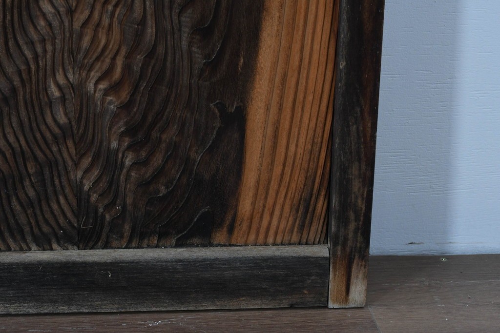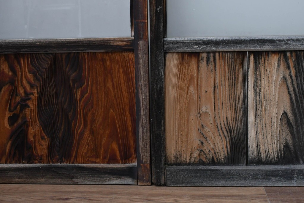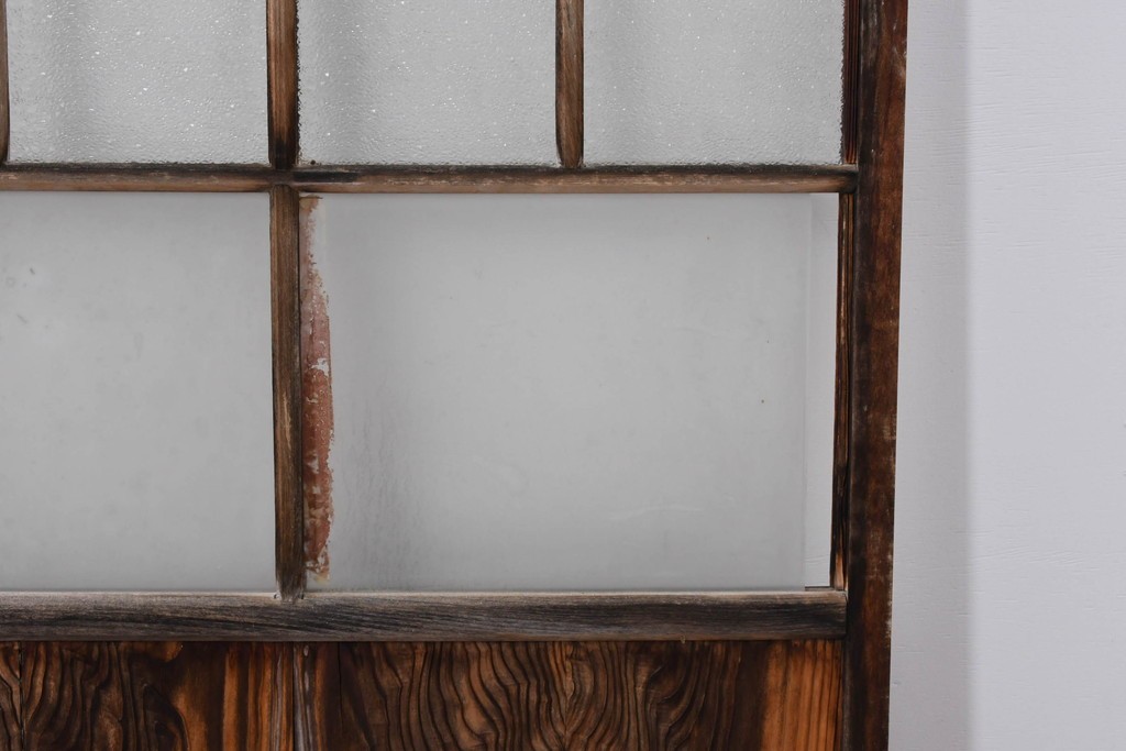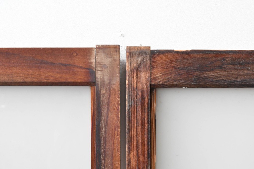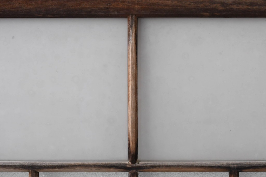 下部の板材には、経年で深く味わいを帯びた独特の木目が現れています。色の濃淡や揺らぎが自然に残り、古い建具ならではの表情を楽しめる点が魅力です。和空間はもちろん、素材感を活かしたインテリアとも相性が良く、空間に温かみと落ち着きを添えてくれます。