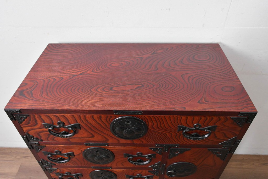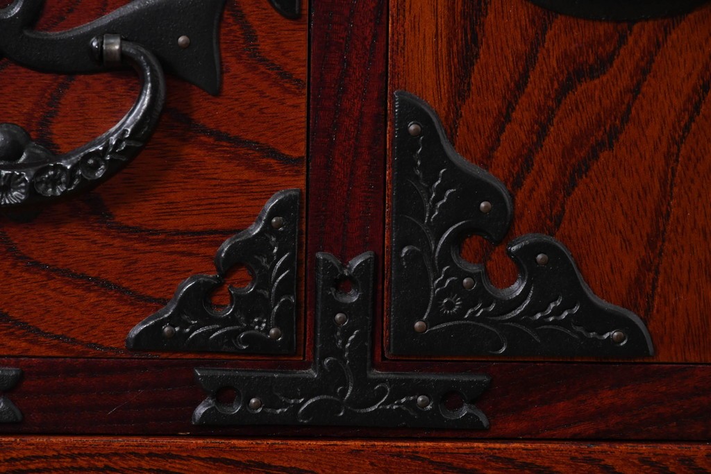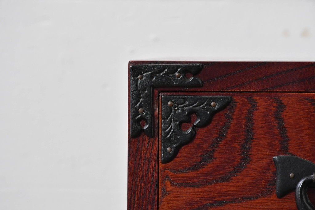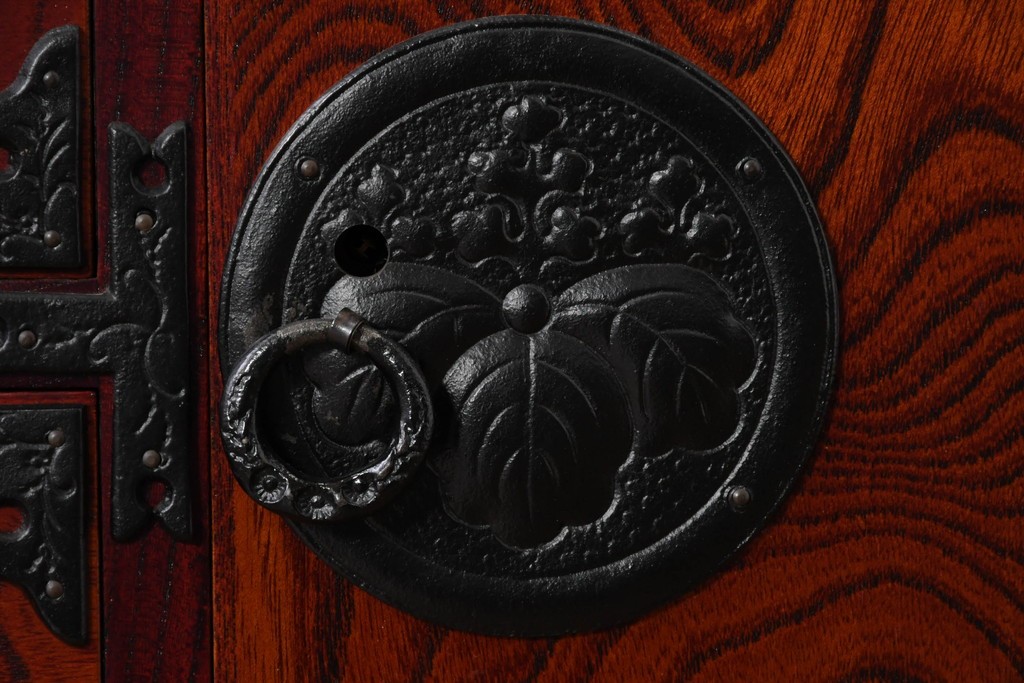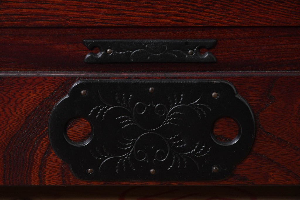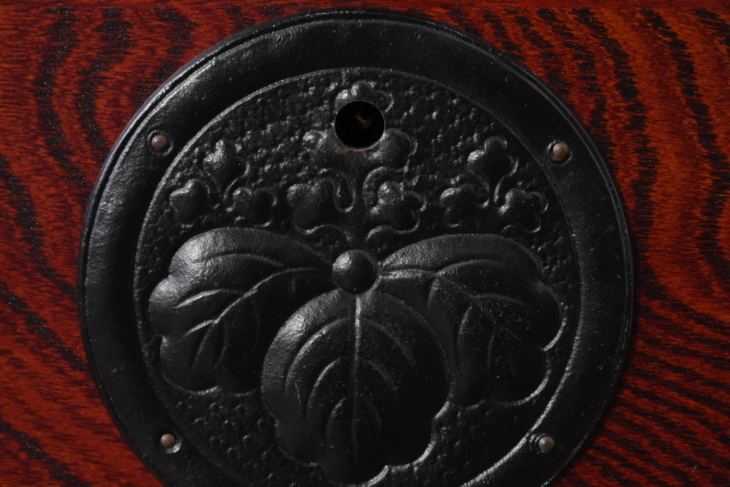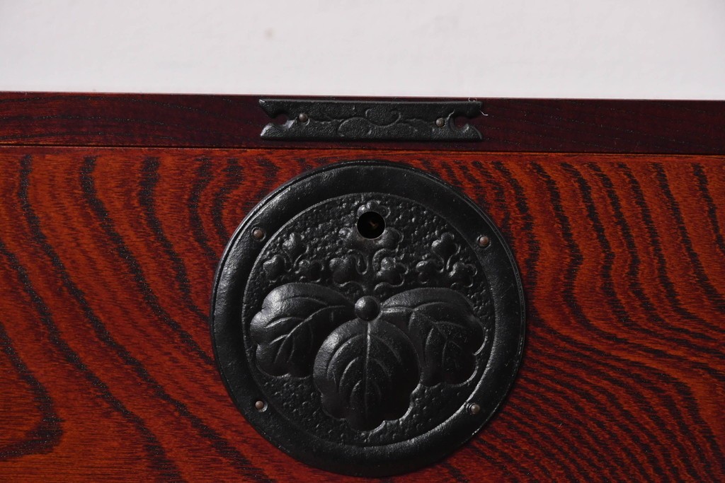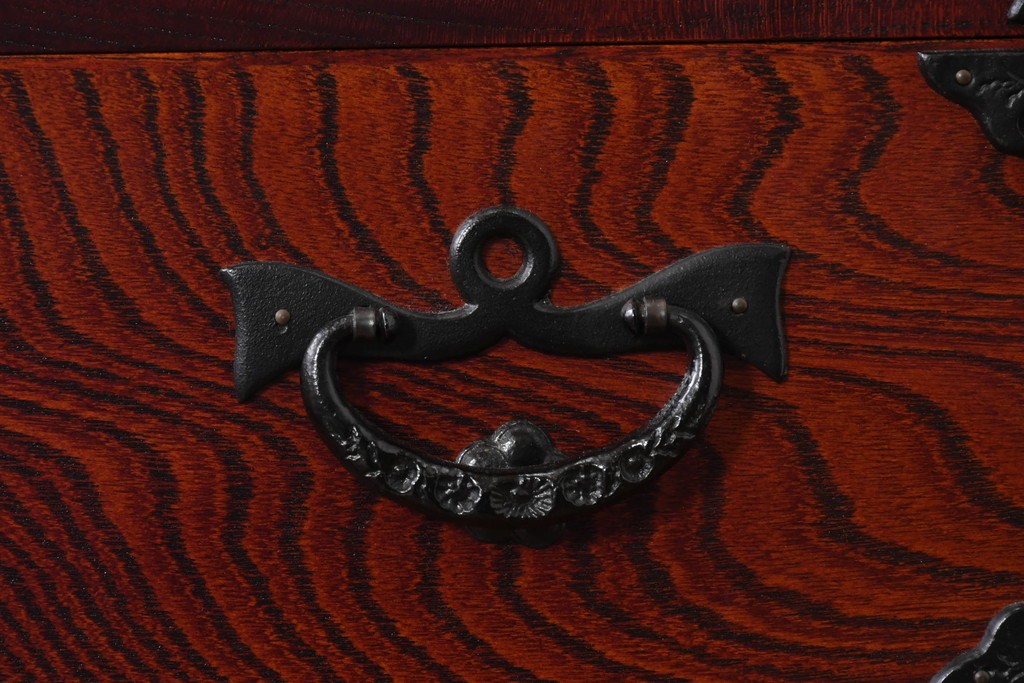 深い色味の木目が力強く浮かび上がり、前面を飾る重厚な金具と相まって存在感のある佇まいです。