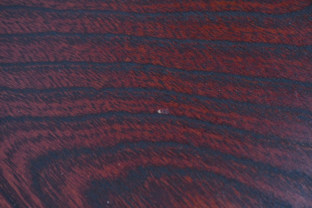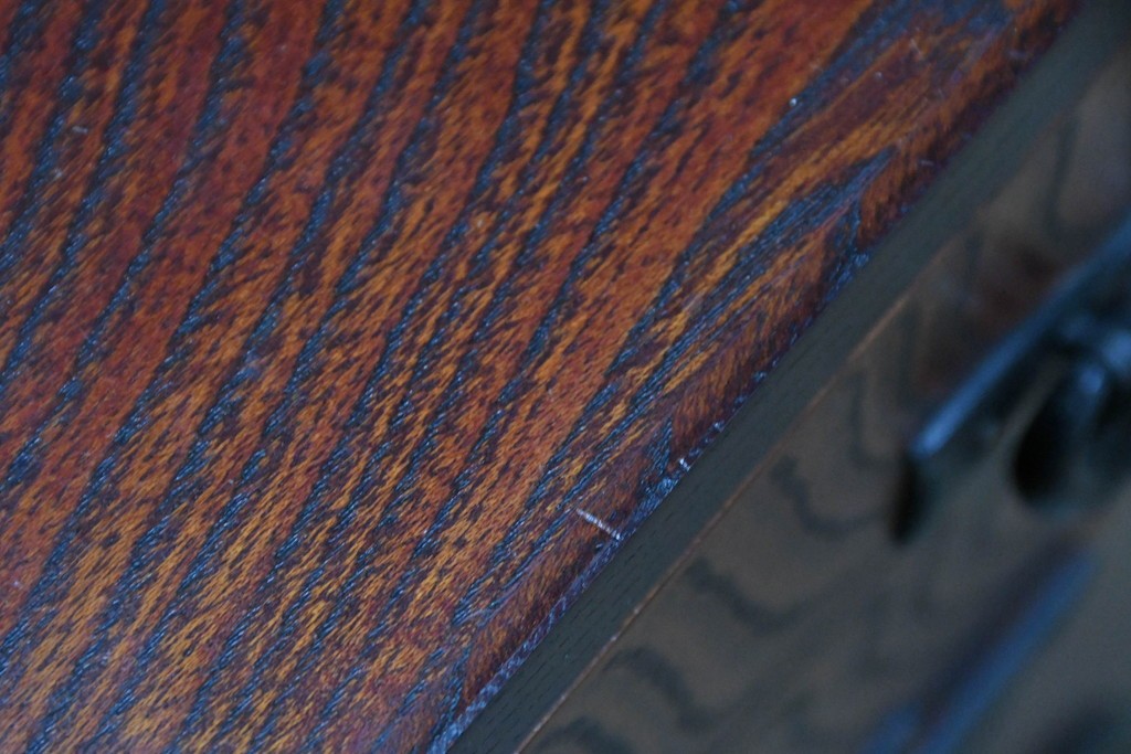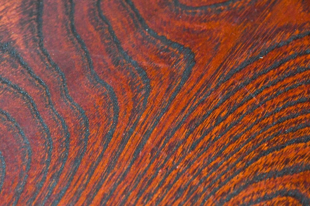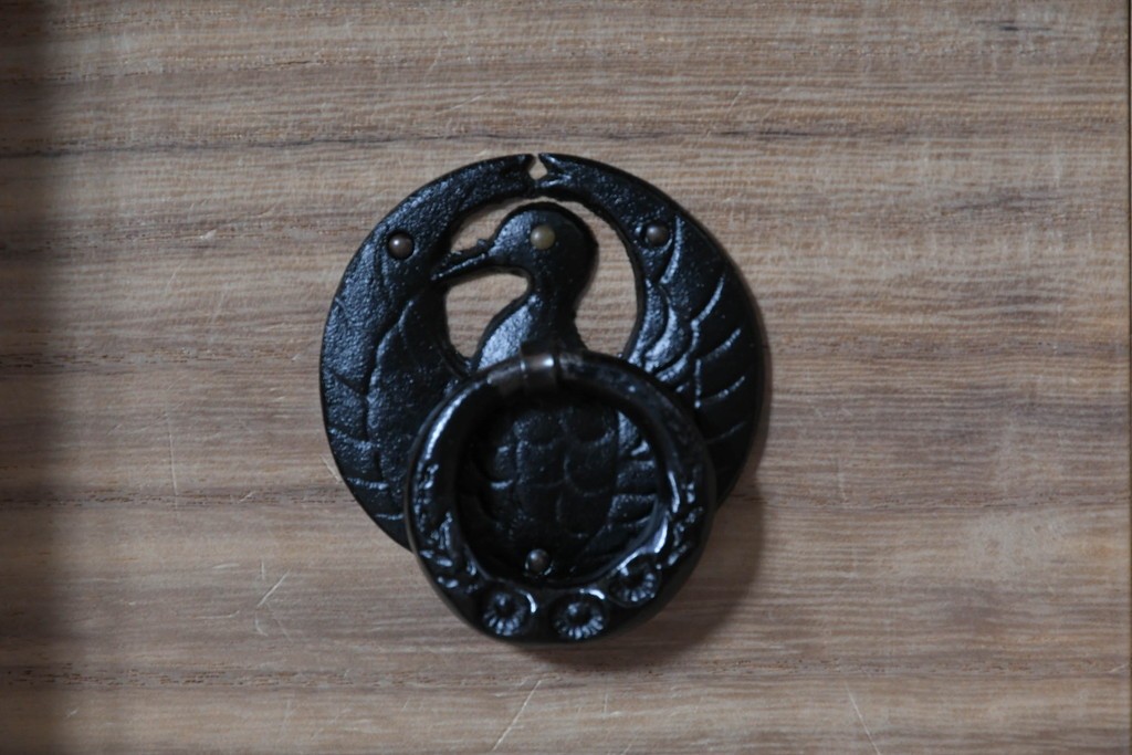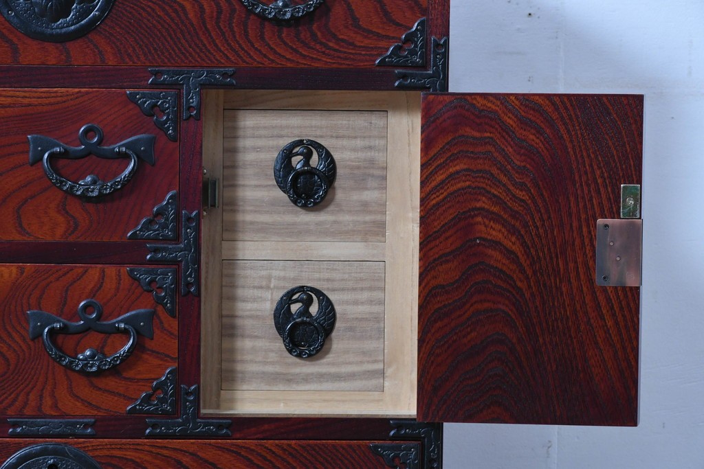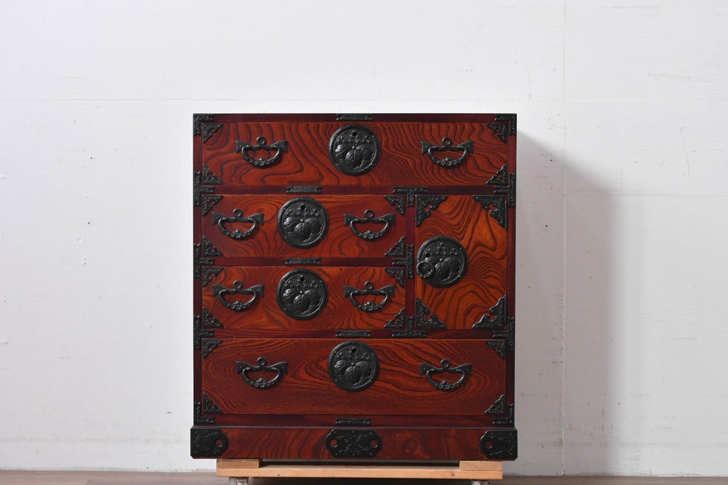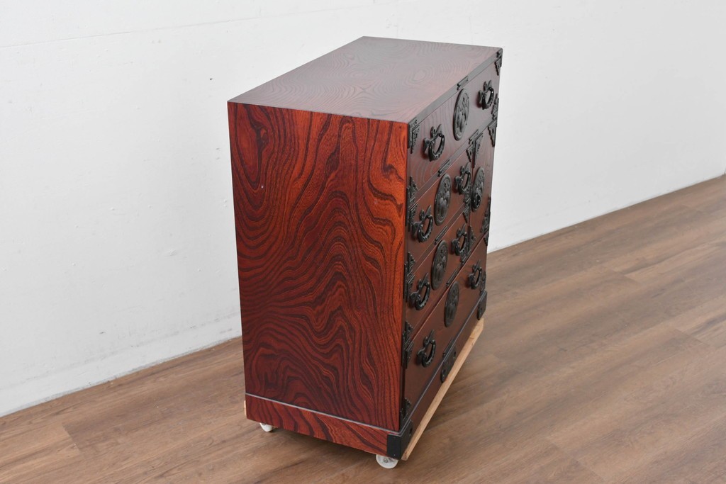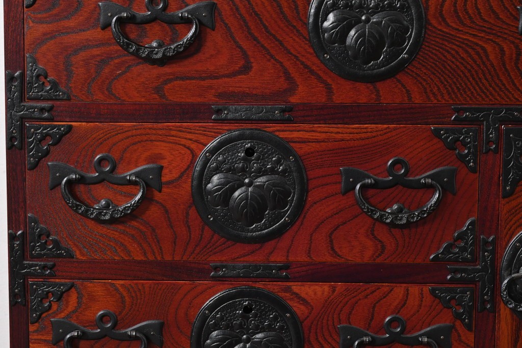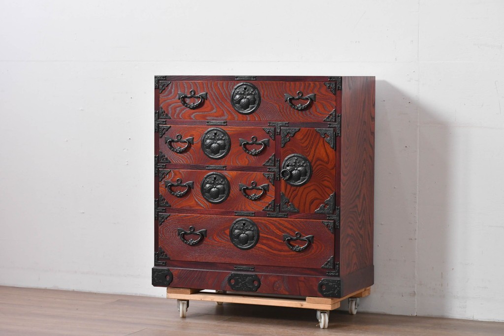 深い色味の木目が力強く浮かび上がり、前面を飾る重厚な金具と相まって存在感のある佇まいです。