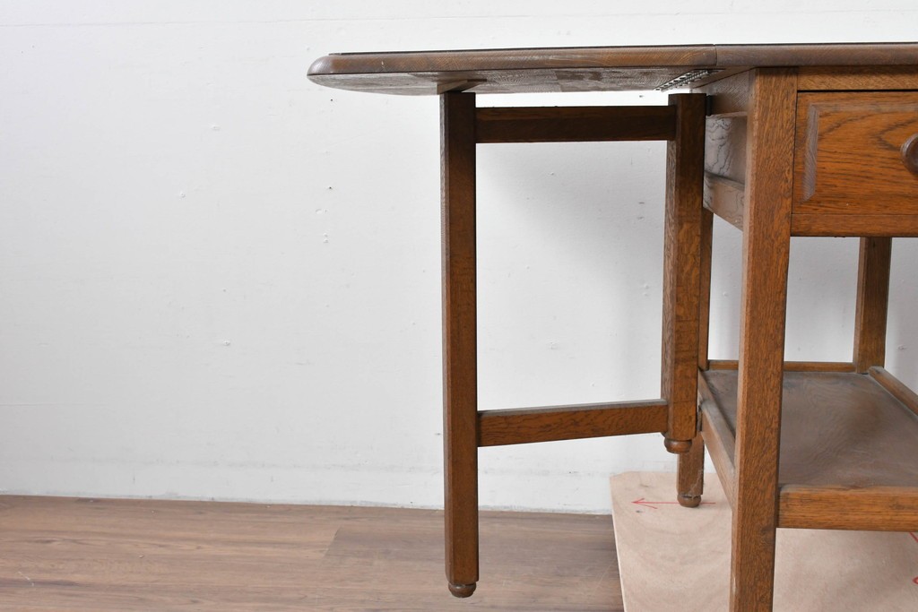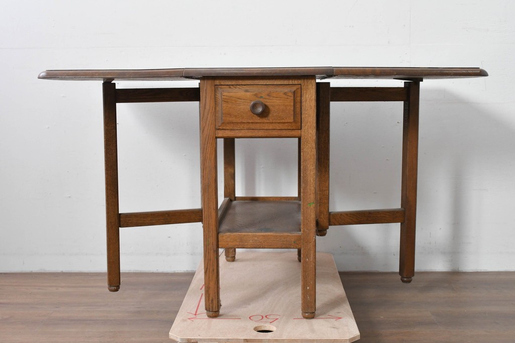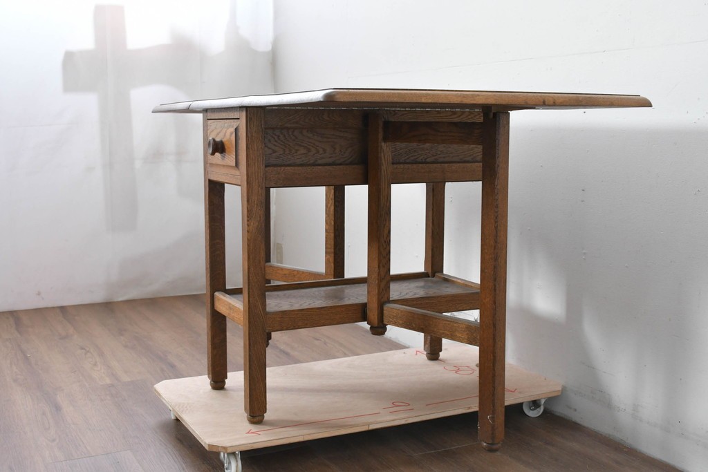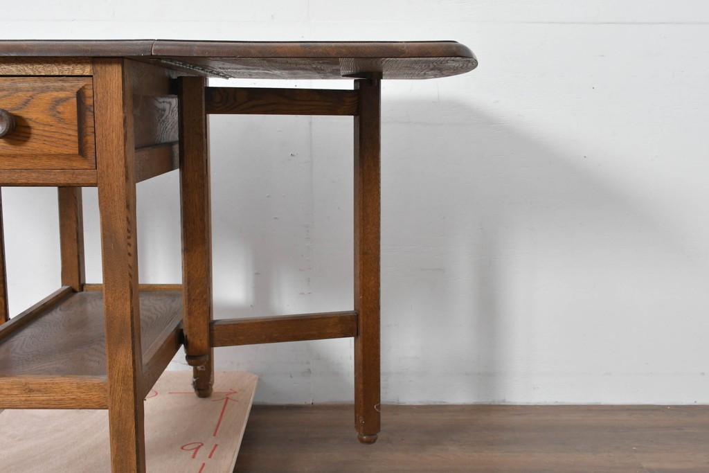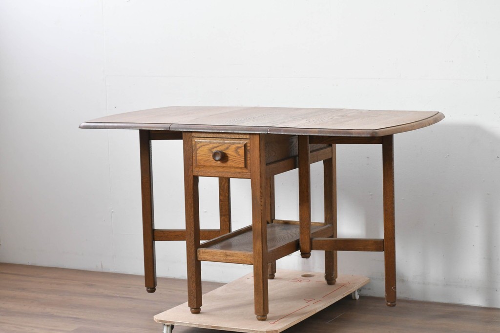 両側の天板を跳ね上げて広げられる構造で、スペースに合わせて使い分けができる実用的なつくりです。