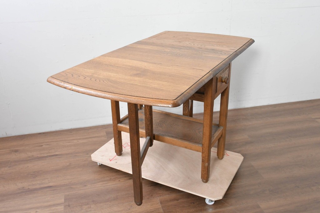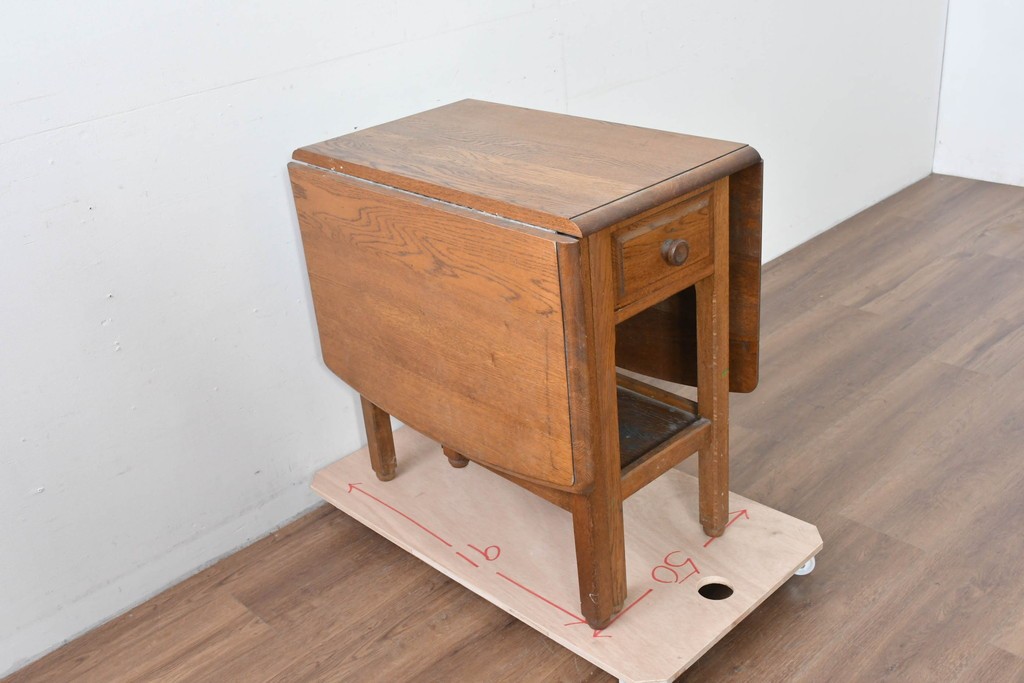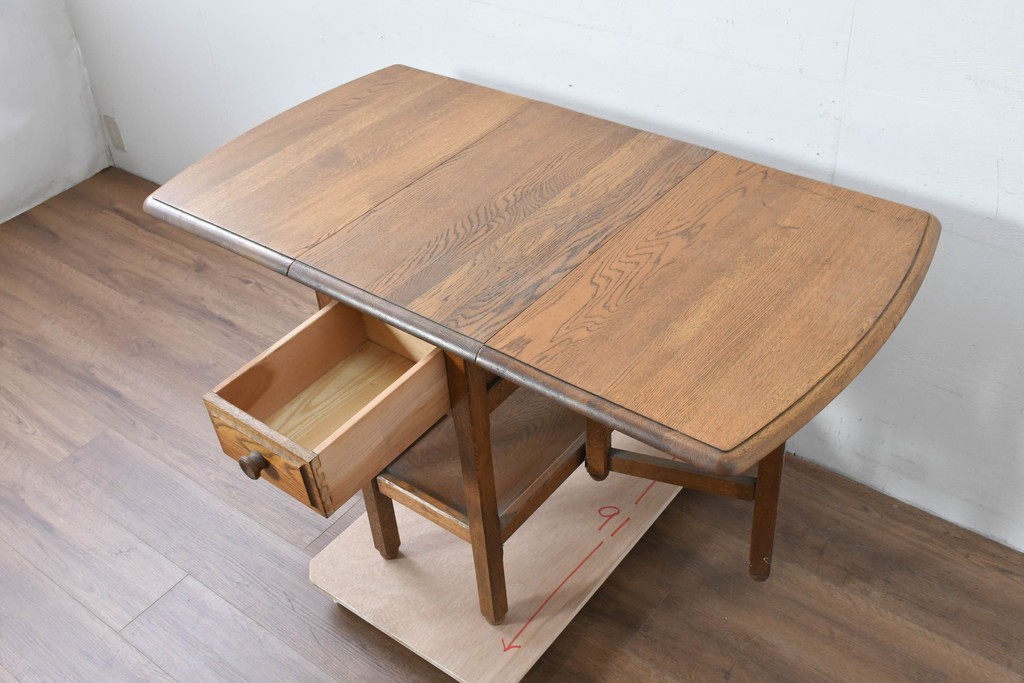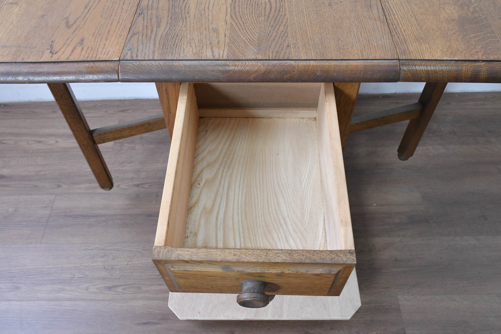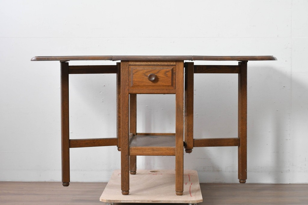 両側の天板を跳ね上げて広げられる構造で、スペースに合わせて使い分けができる実用的なつくりです。