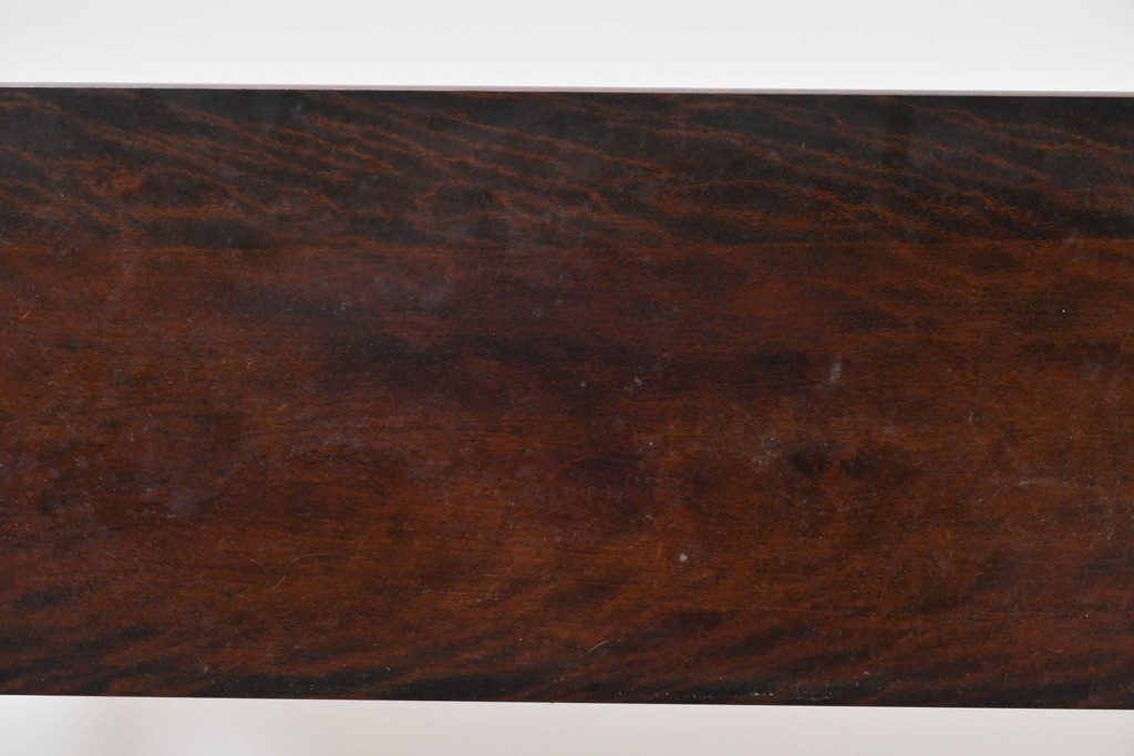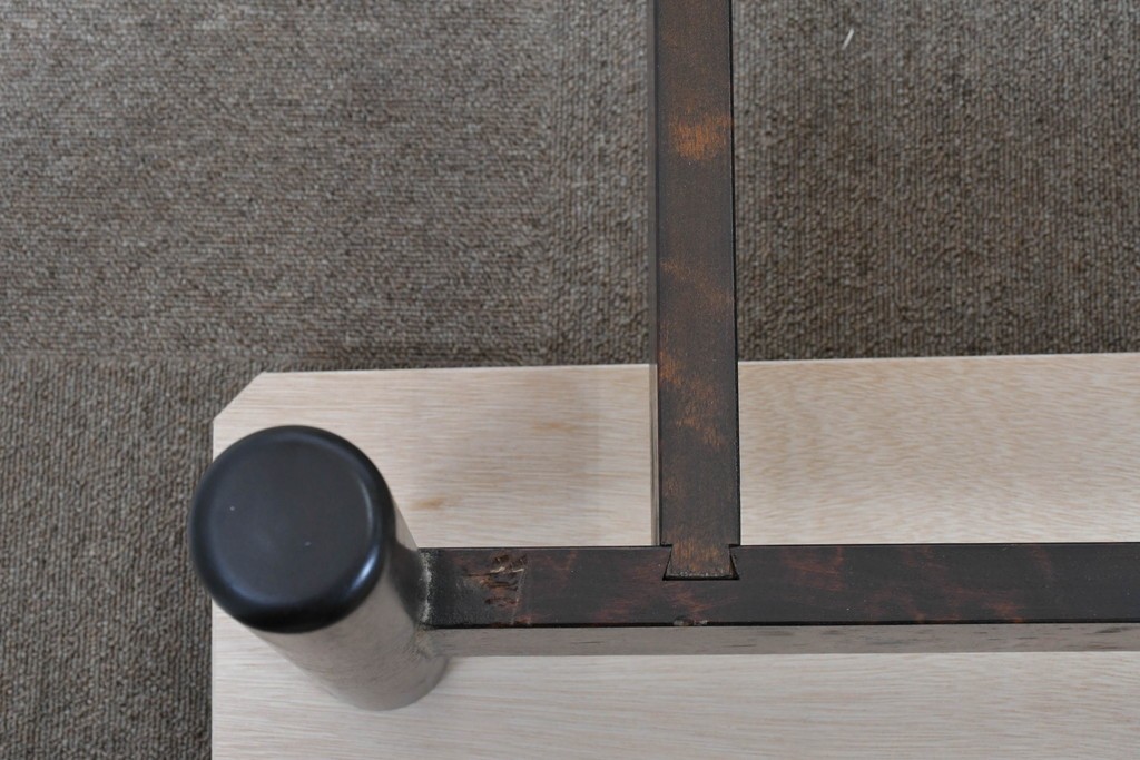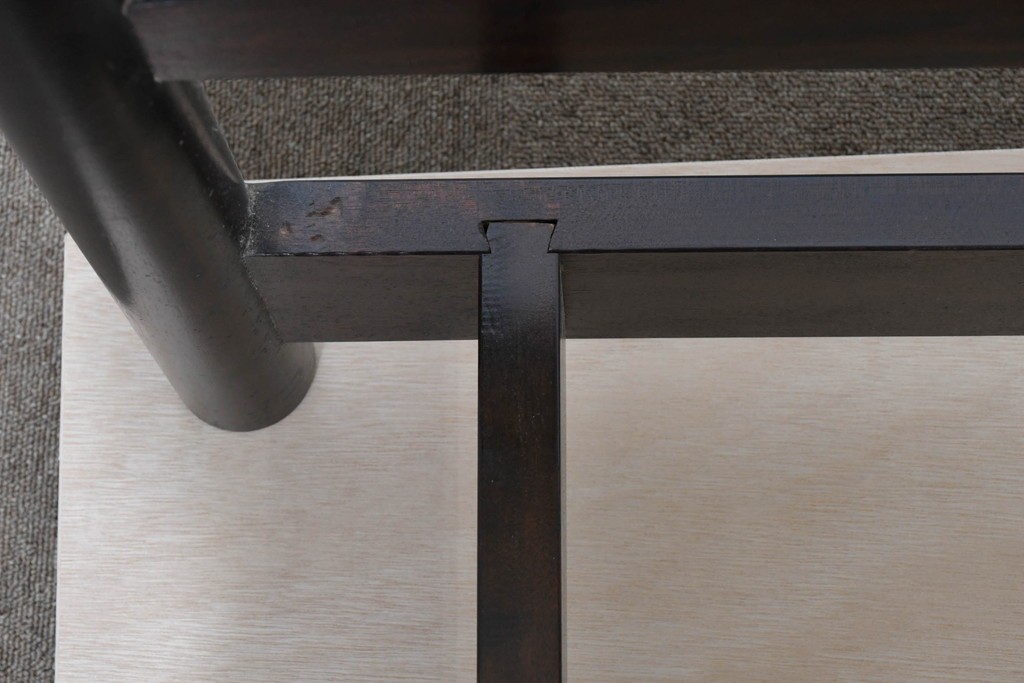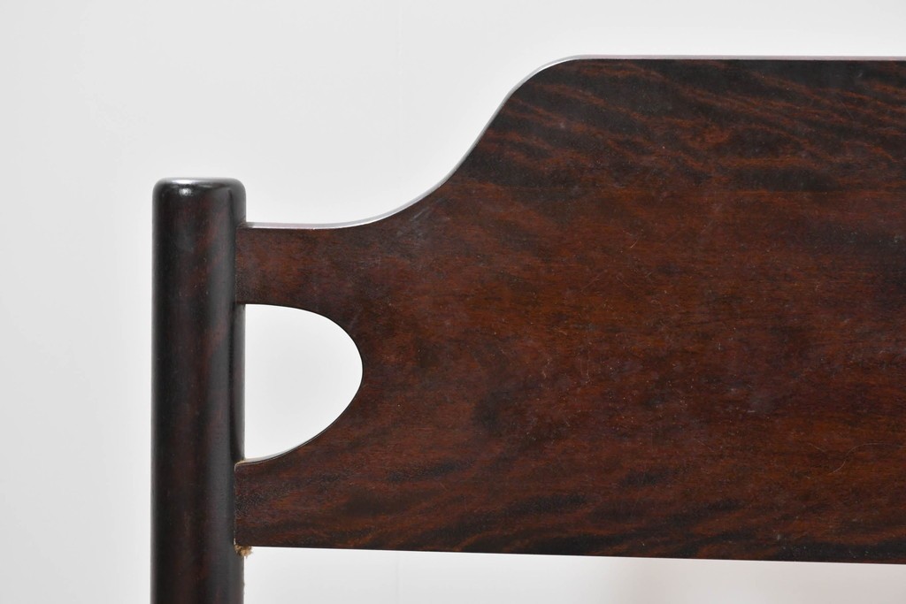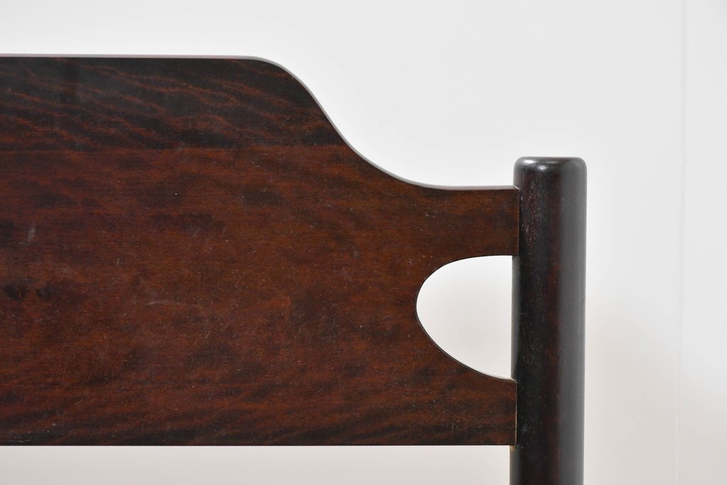 深みのある濃茶色の木肌が、松本民芸家具らしい上質な雰囲気を醸し出します。無駄のない造形と、優しい丸みを帯びた支柱の組み合わせに、手仕事の丁寧さが自然と感じられます。シンプルで飽きのこないデザインが魅力です。