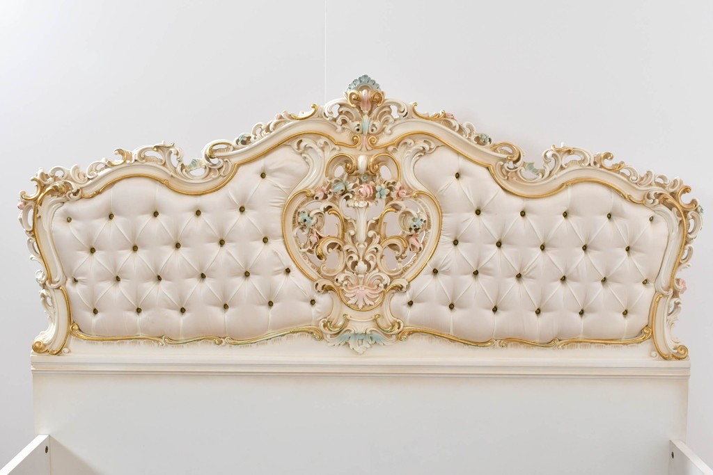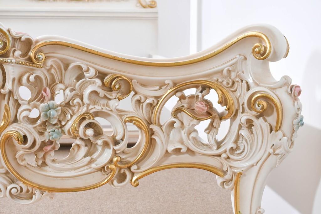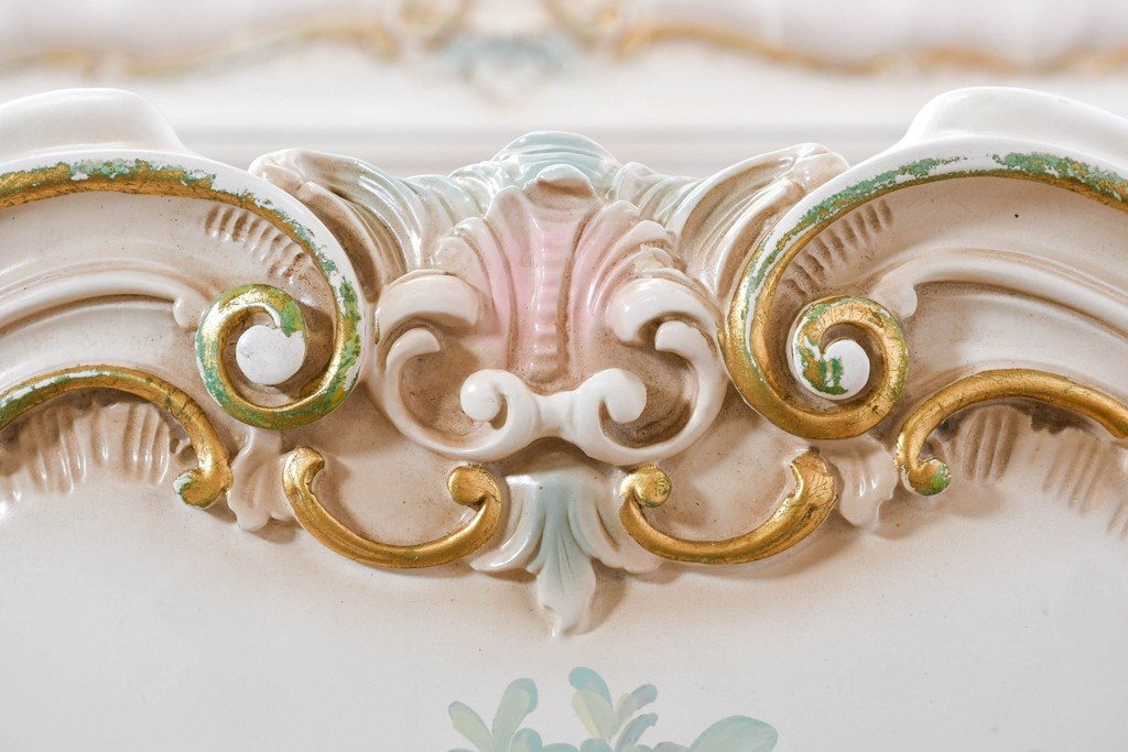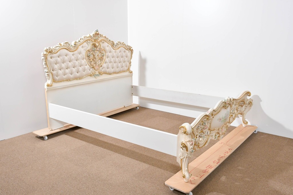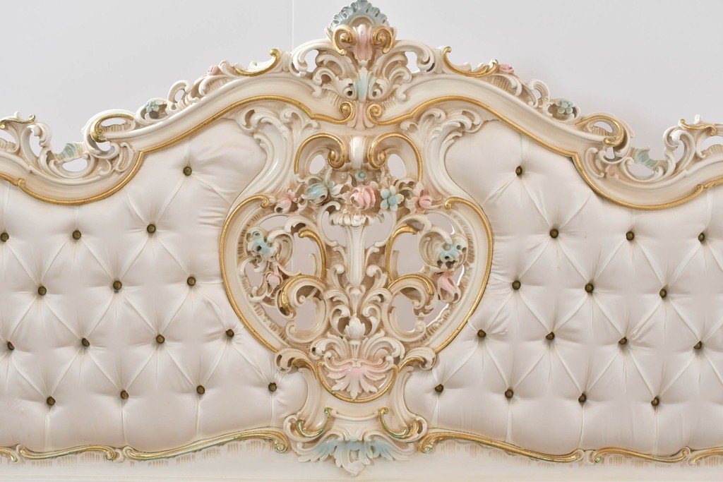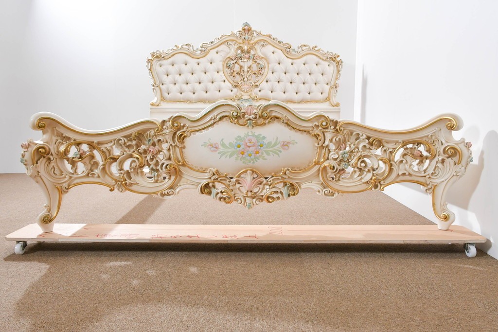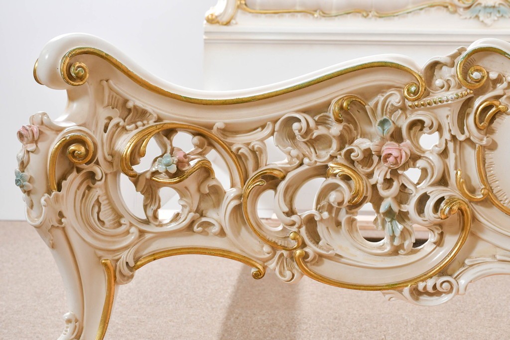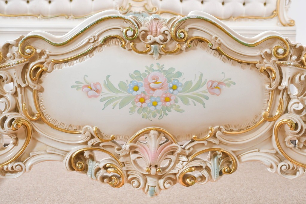ヘッドボードやフットボードには金彩を交えた繊細な装飾が施され、柔らかな色調の花モチーフが家具全体を華やかにまとめています。