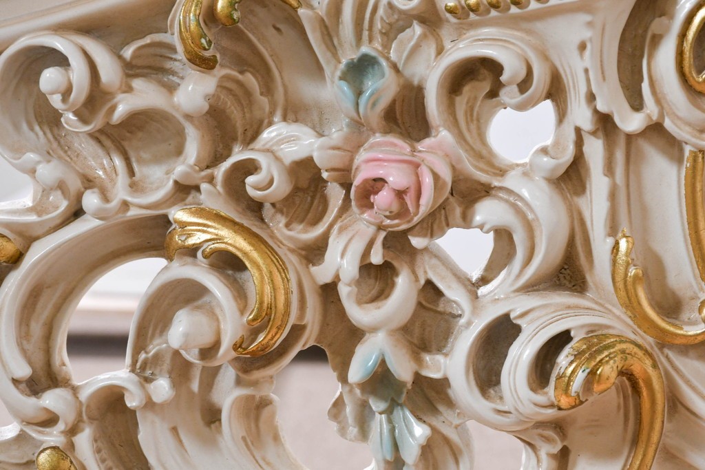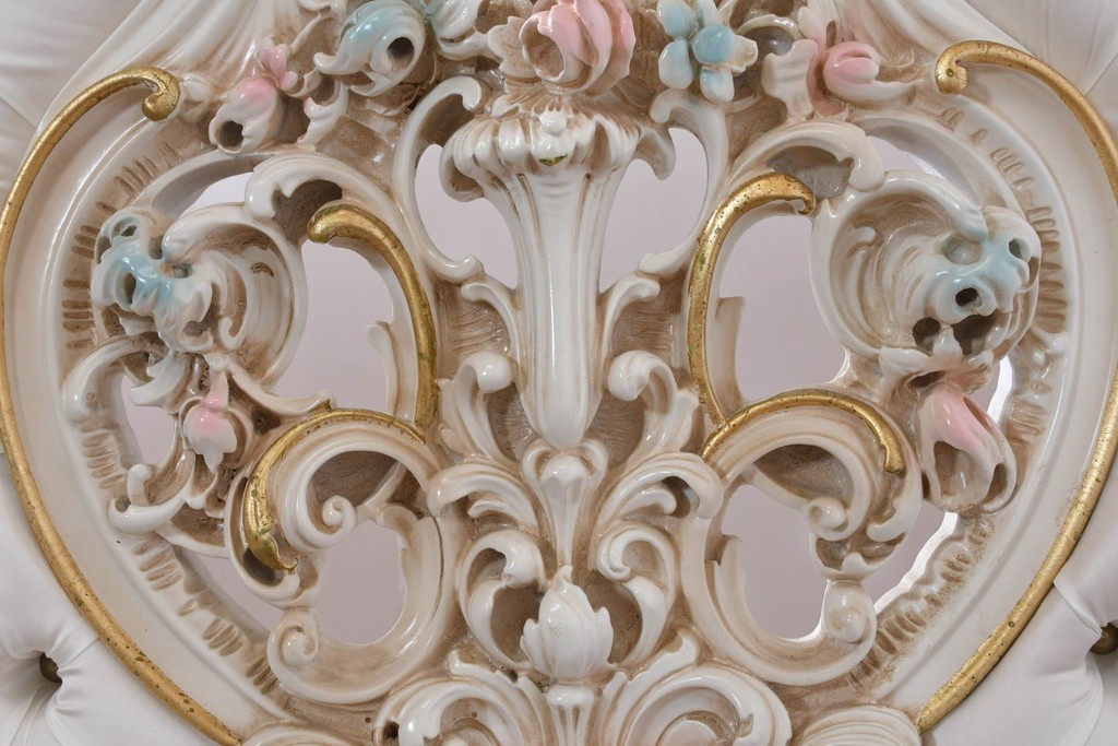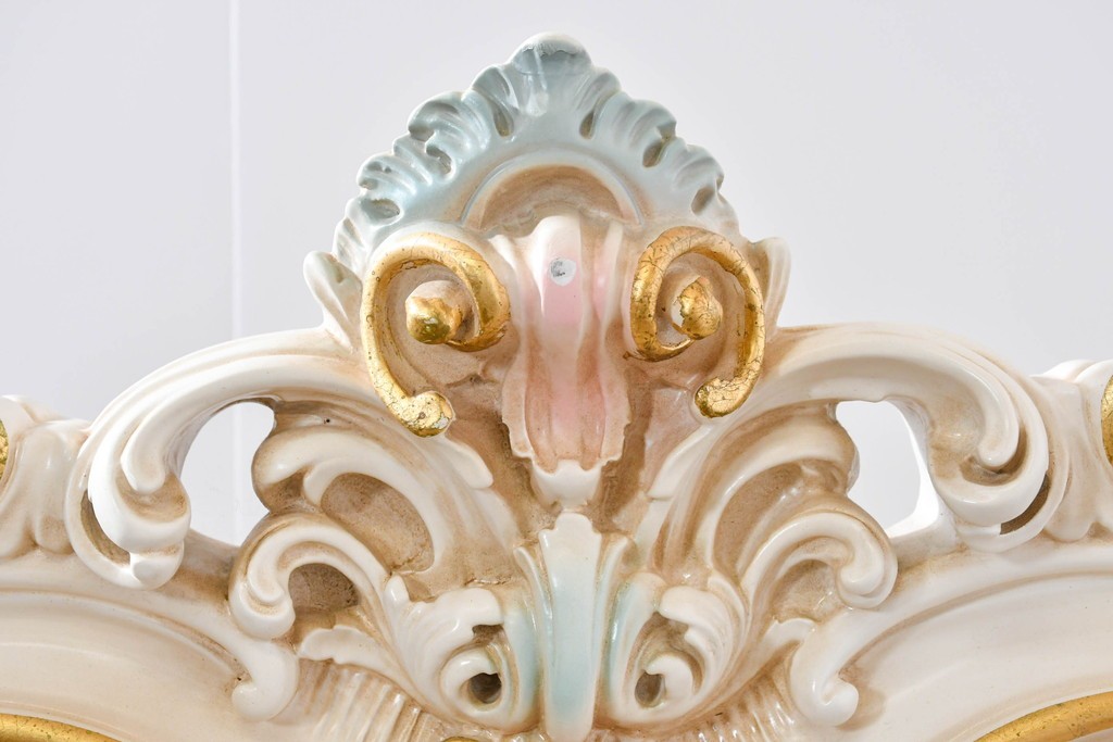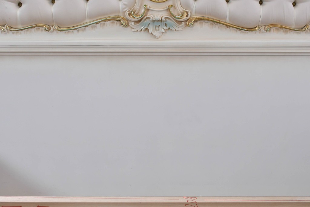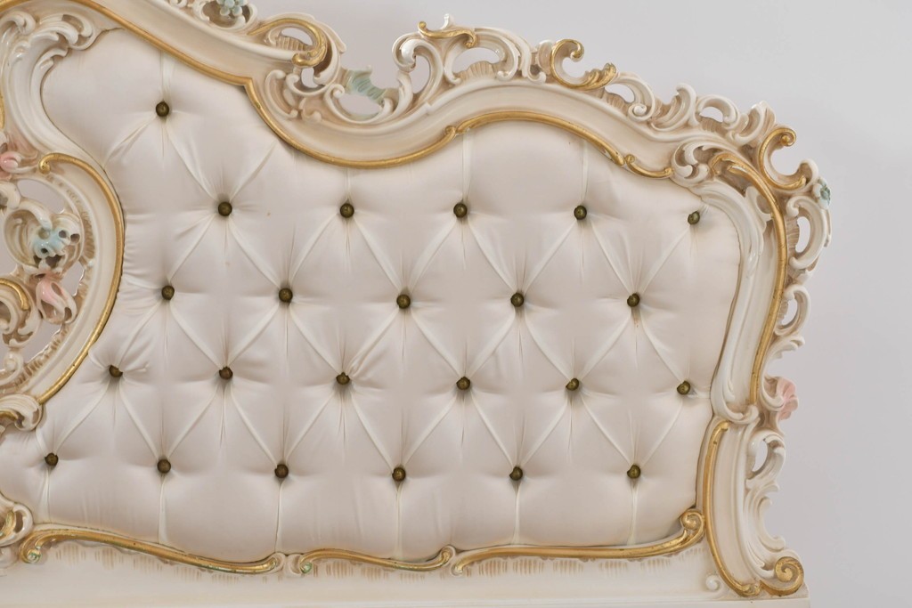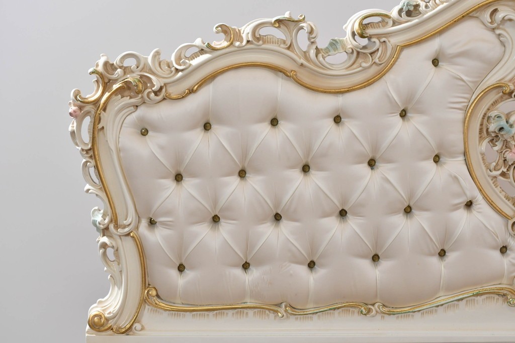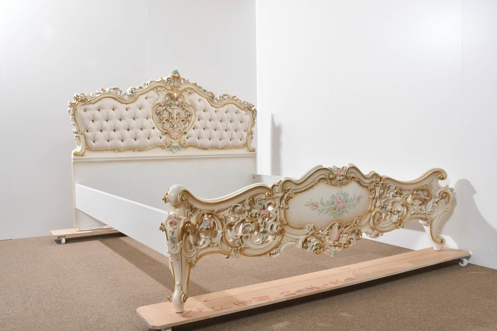 ヘッドボードやフットボードには金彩を交えた繊細な装飾が施され、柔らかな色調の花モチーフが家具全体を華やかにまとめています。