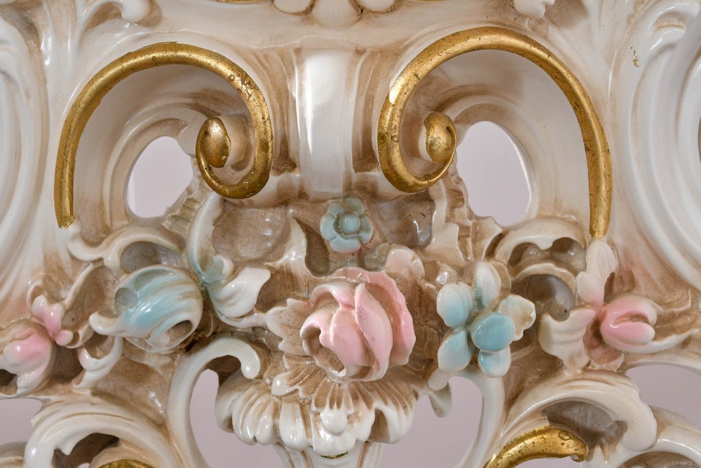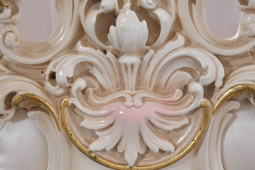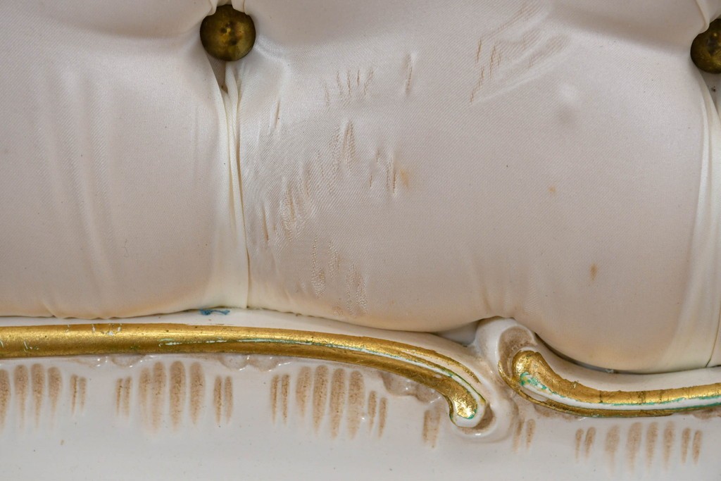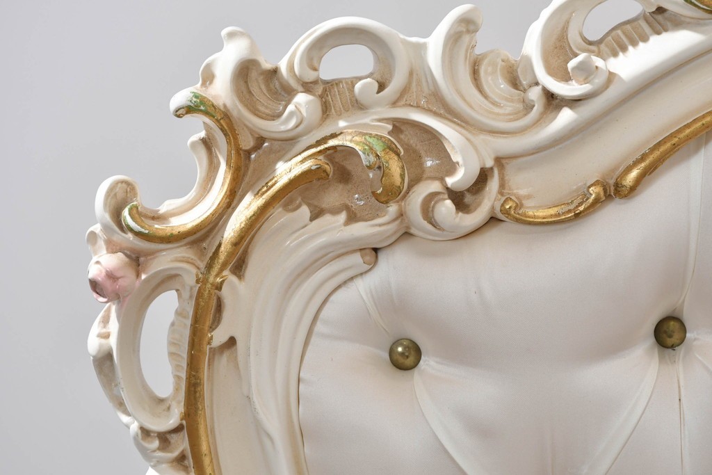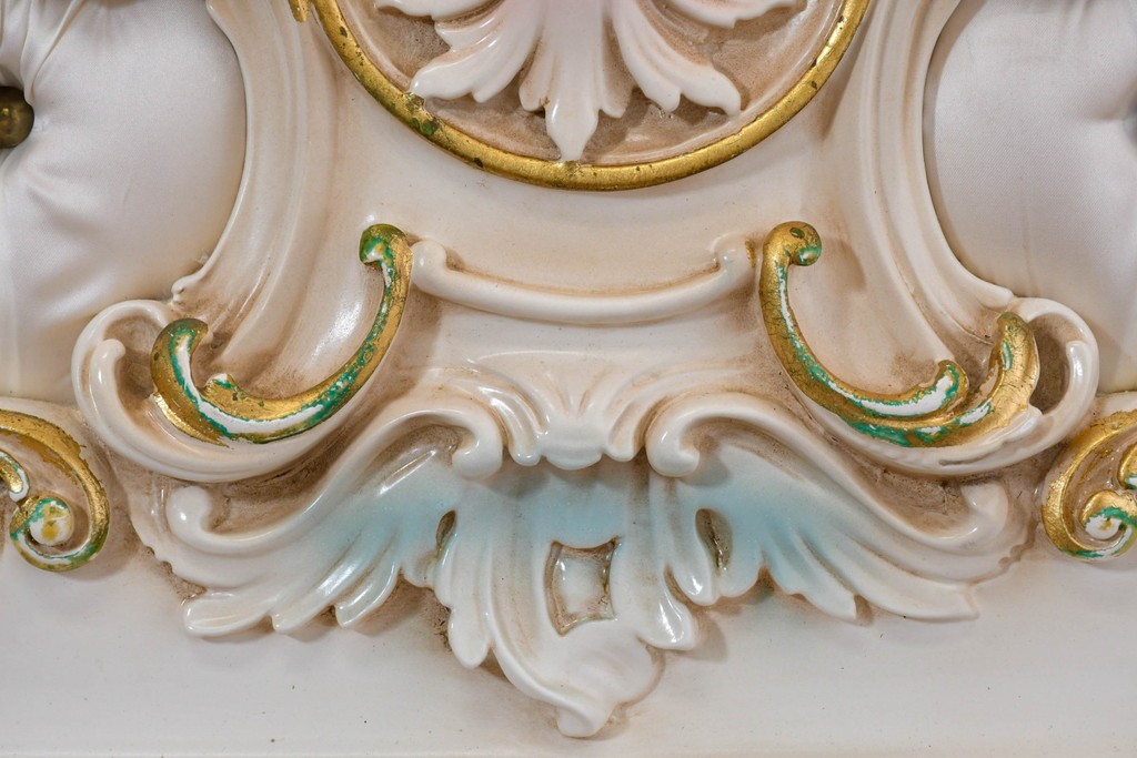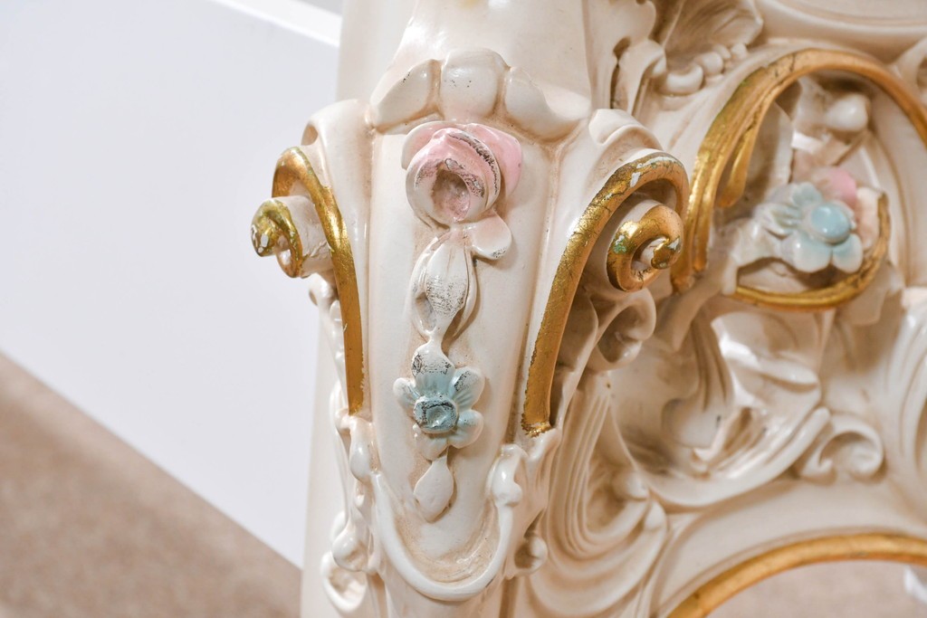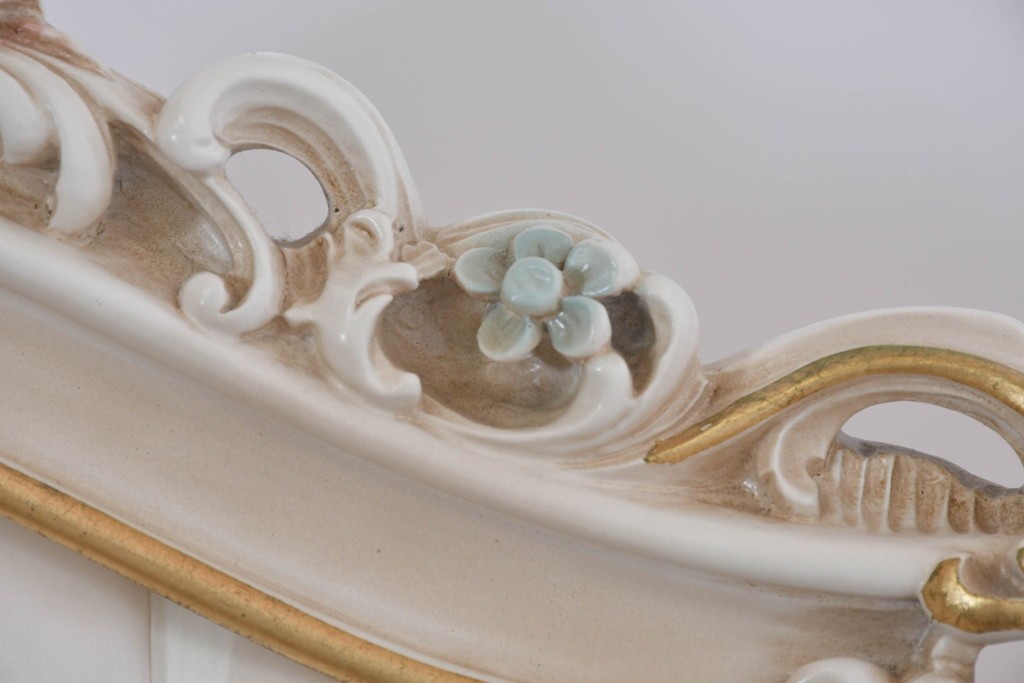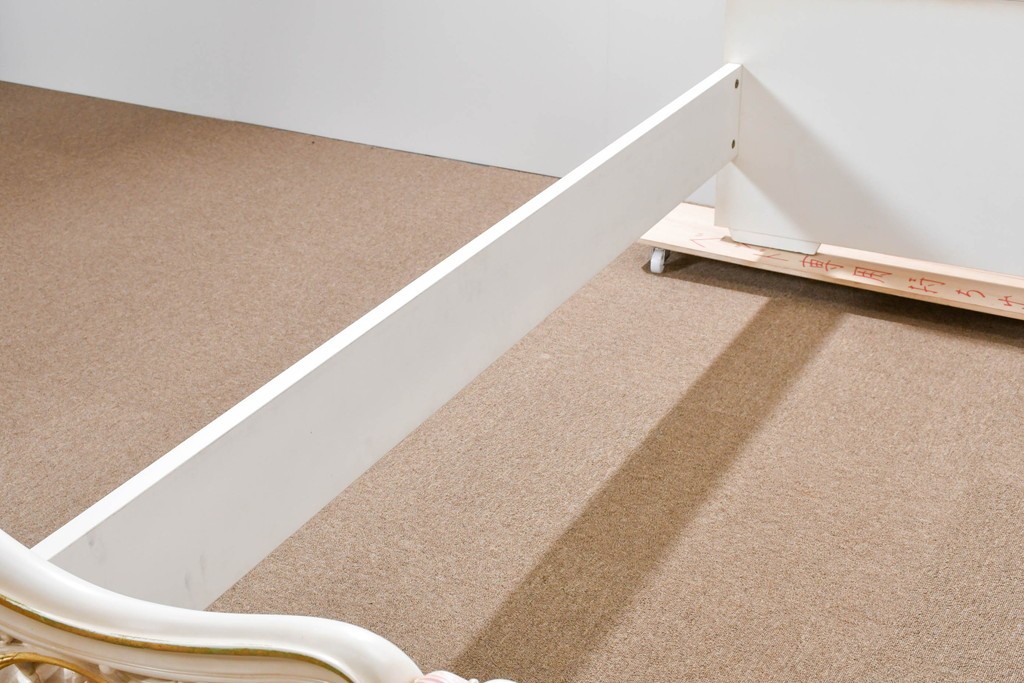 ヘッドボードやフットボードには金彩を交えた繊細な装飾が施され、柔らかな色調の花モチーフが家具全体を華やかにまとめています。