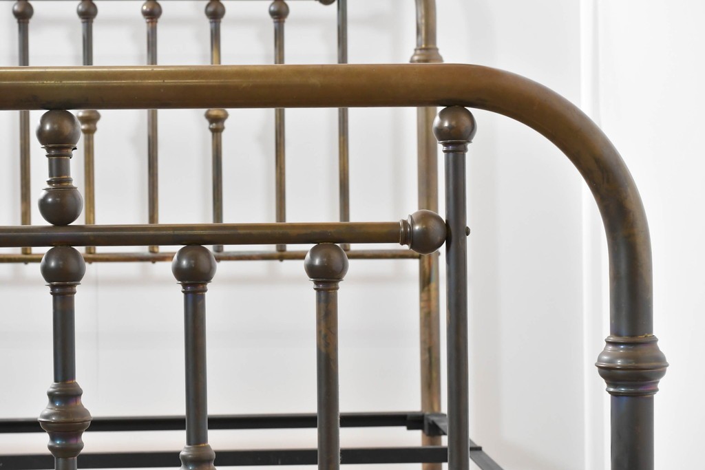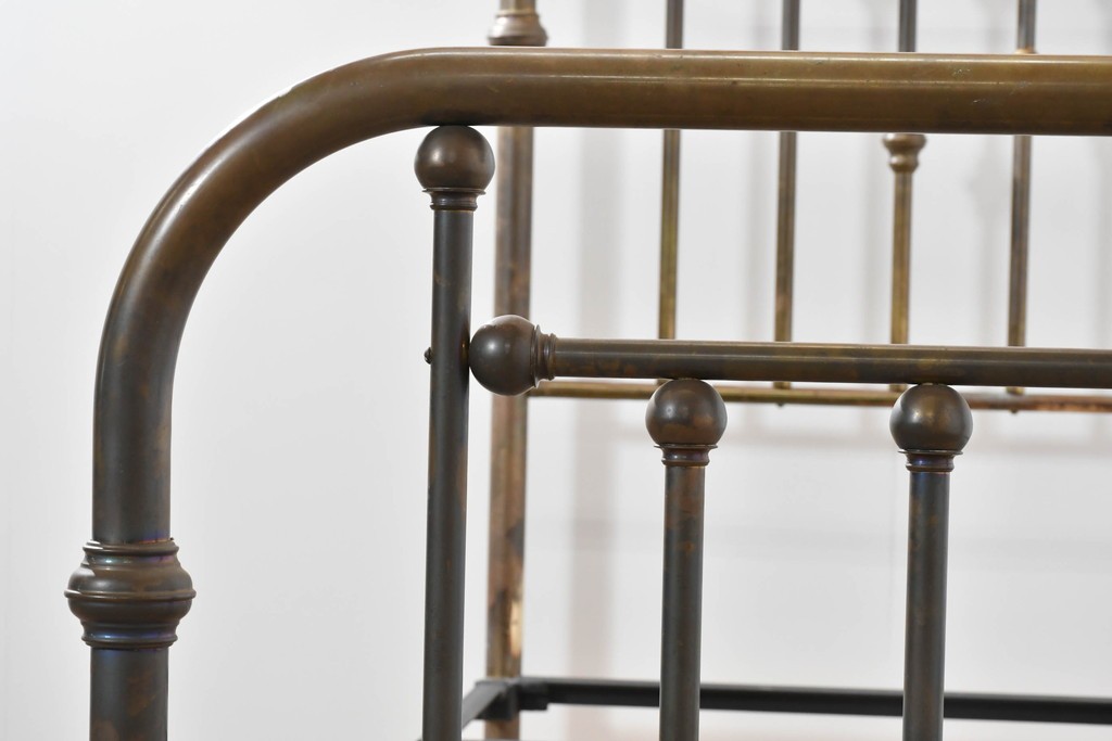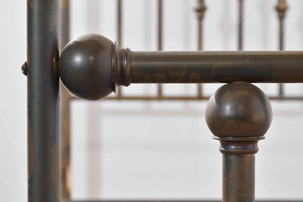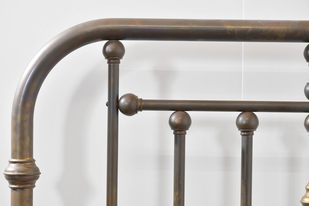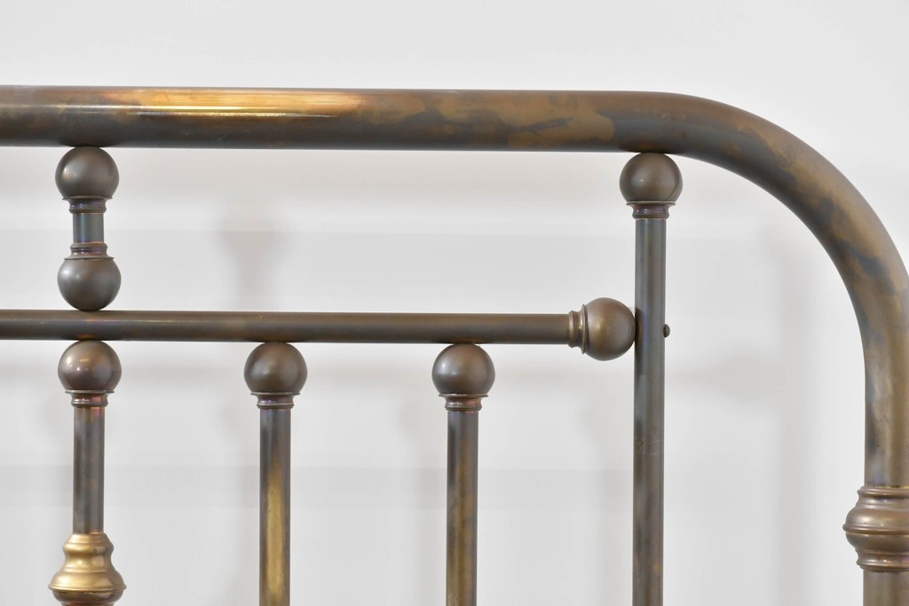 支柱や横桟に施された球状の装飾がデザインのアクセントとなり、クラシックでありながら存在感のある佇まいを生み出しています。ヘッドボードとフットボードに共通する整った装飾バランスにより、寝室の主役となる上質なヴィンテージスタイルを演出します。