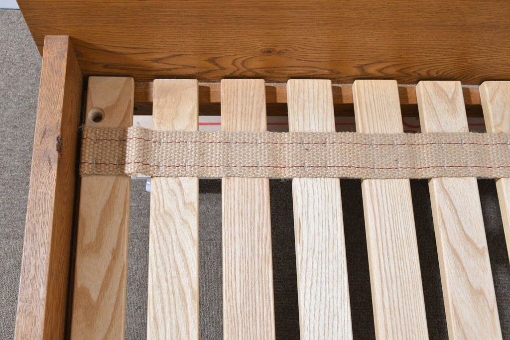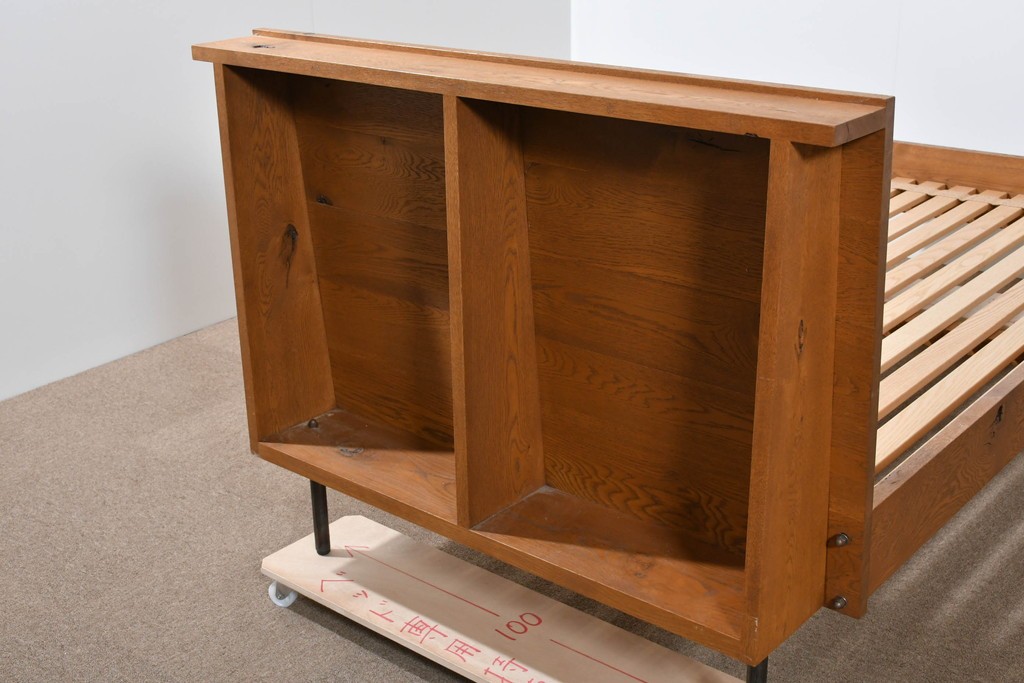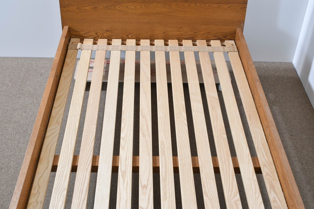すのこ仕様で通気性に配慮されており、季節を問わず快適に使いやすい構造です。シングルサイズは一人暮らしの寝室やゲスト用にも取り入れやすく、空間を圧迫しないすっきりとしたシルエットが特徴です。金属脚が軽やかな印象を添え、ナラ材の温もりとバランスよく調和したデザインとなっています。