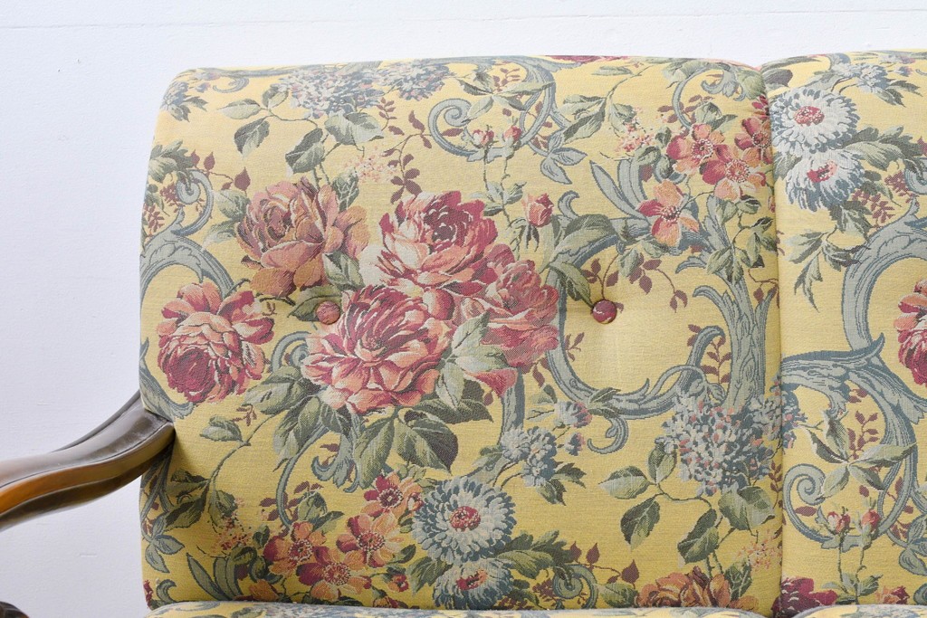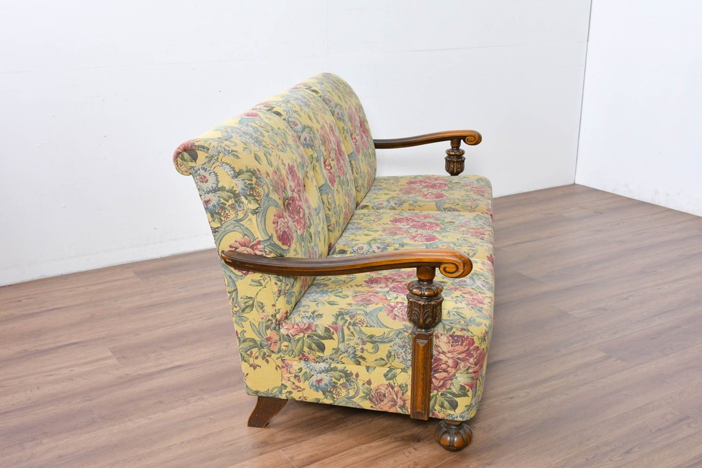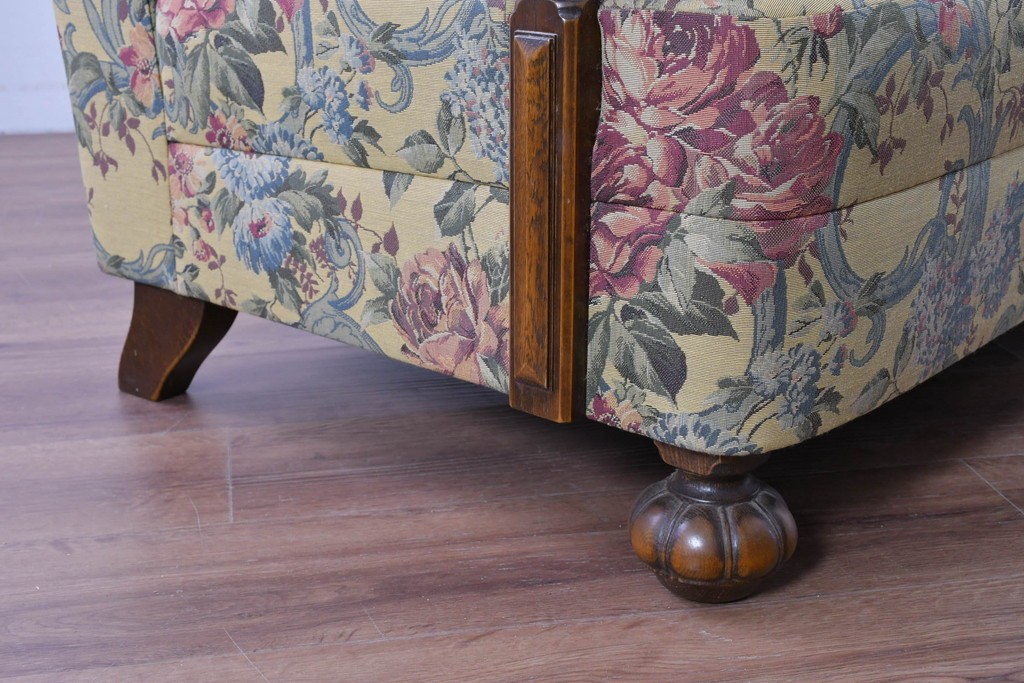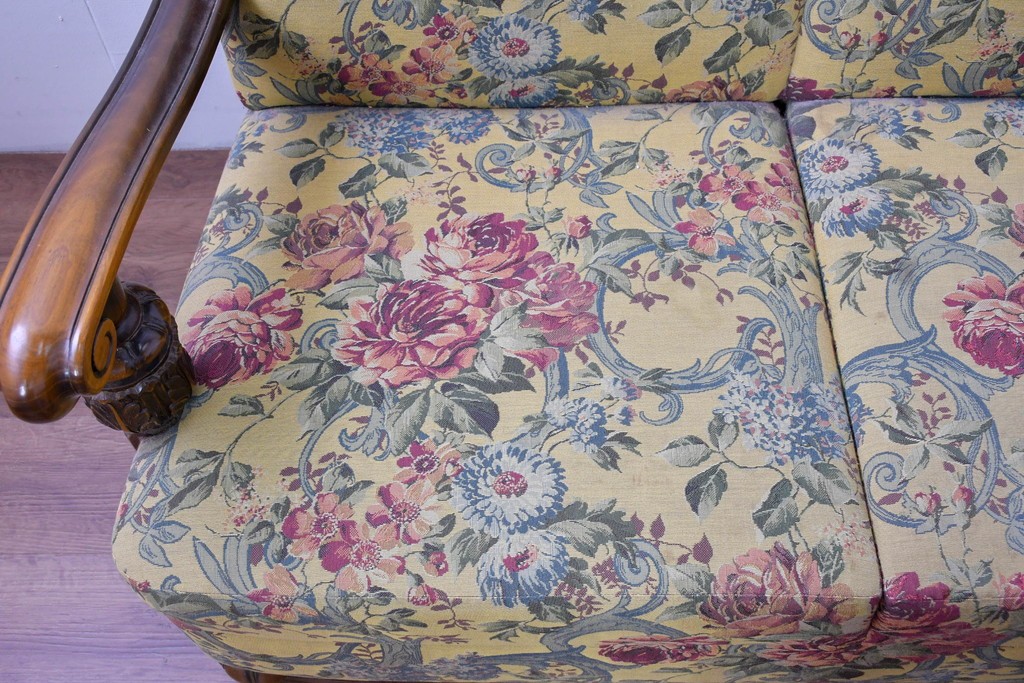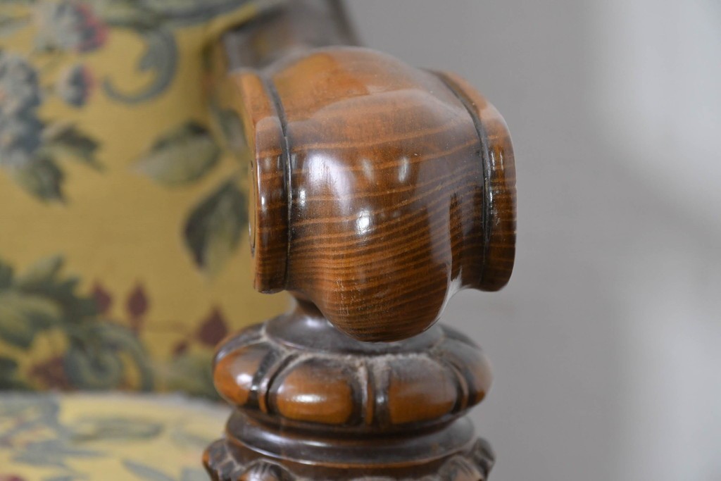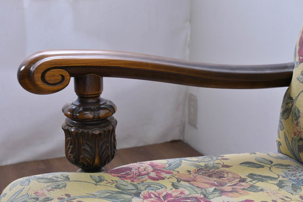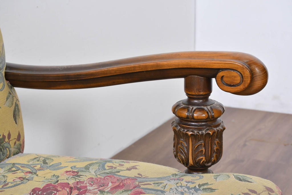 優美な花柄ファブリックと、アーム部に施された彫刻装飾が調和したクラシックな佇まいが魅力です。