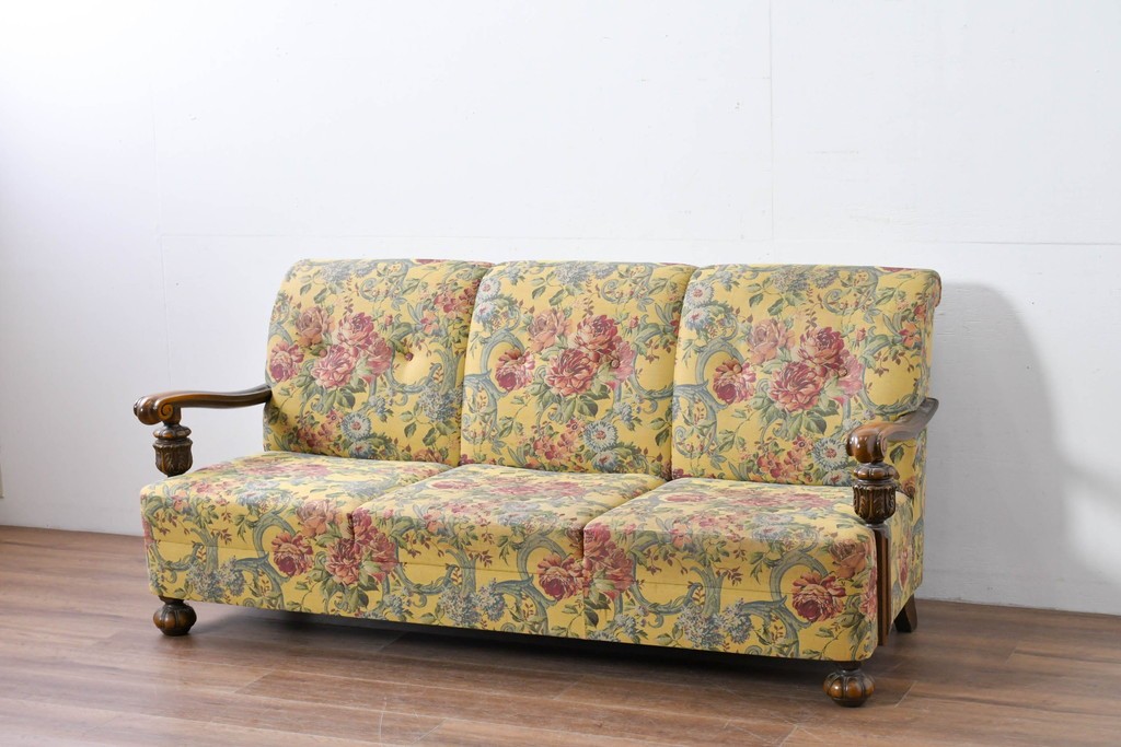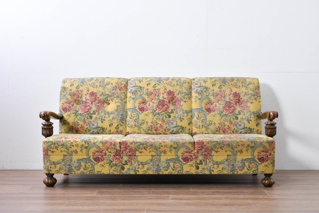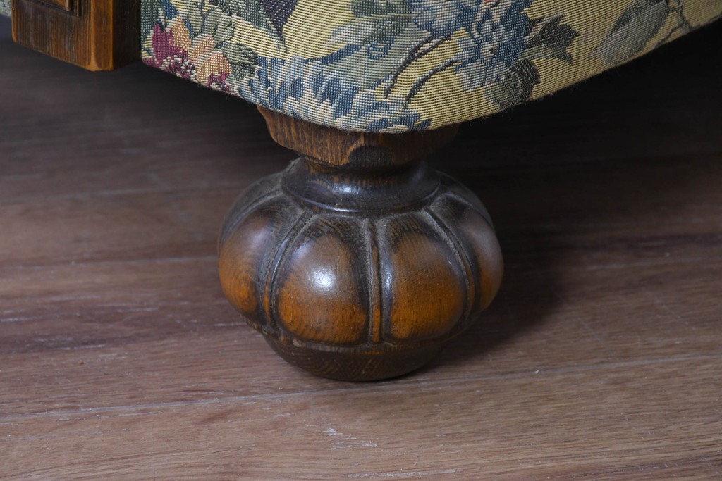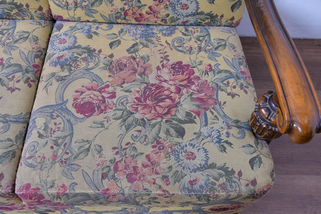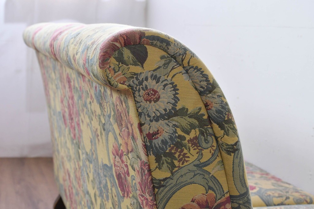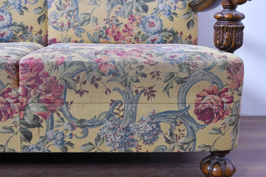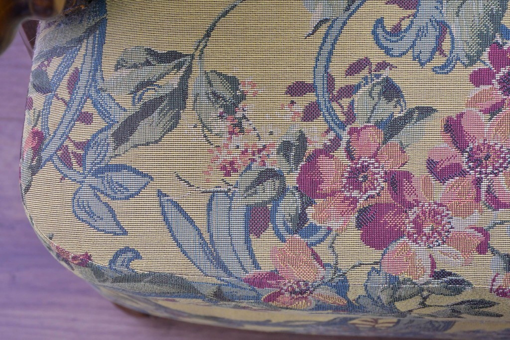優美な花柄ファブリックと、アーム部に施された彫刻装飾が調和したクラシックな佇まいが魅力です。