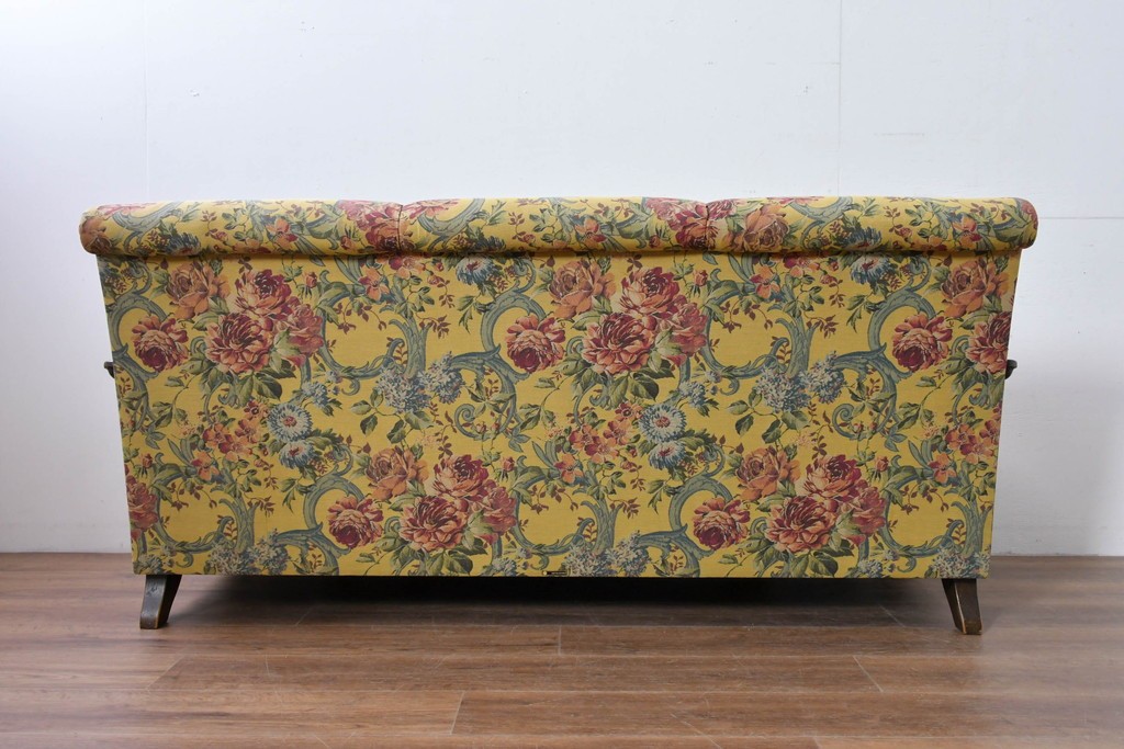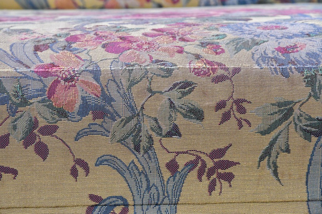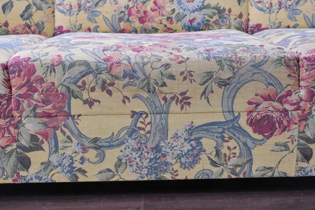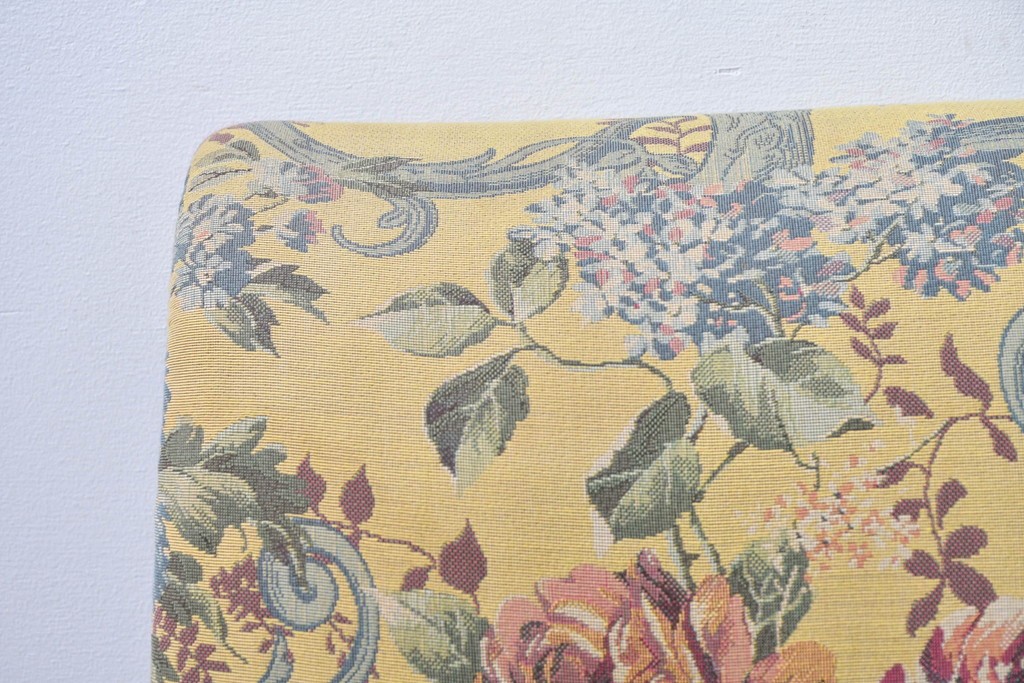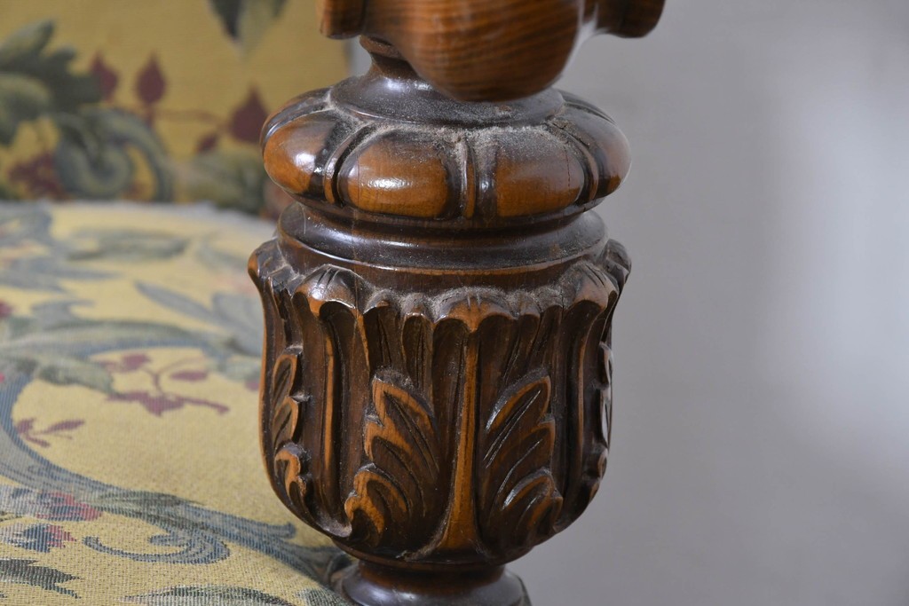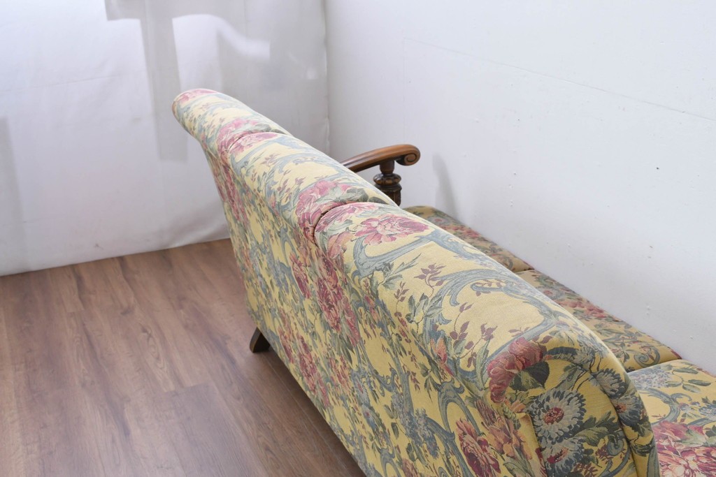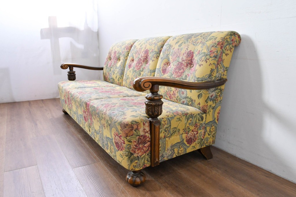 優美な花柄ファブリックと、アーム部に施された彫刻装飾が調和したクラシックな佇まいが魅力です。