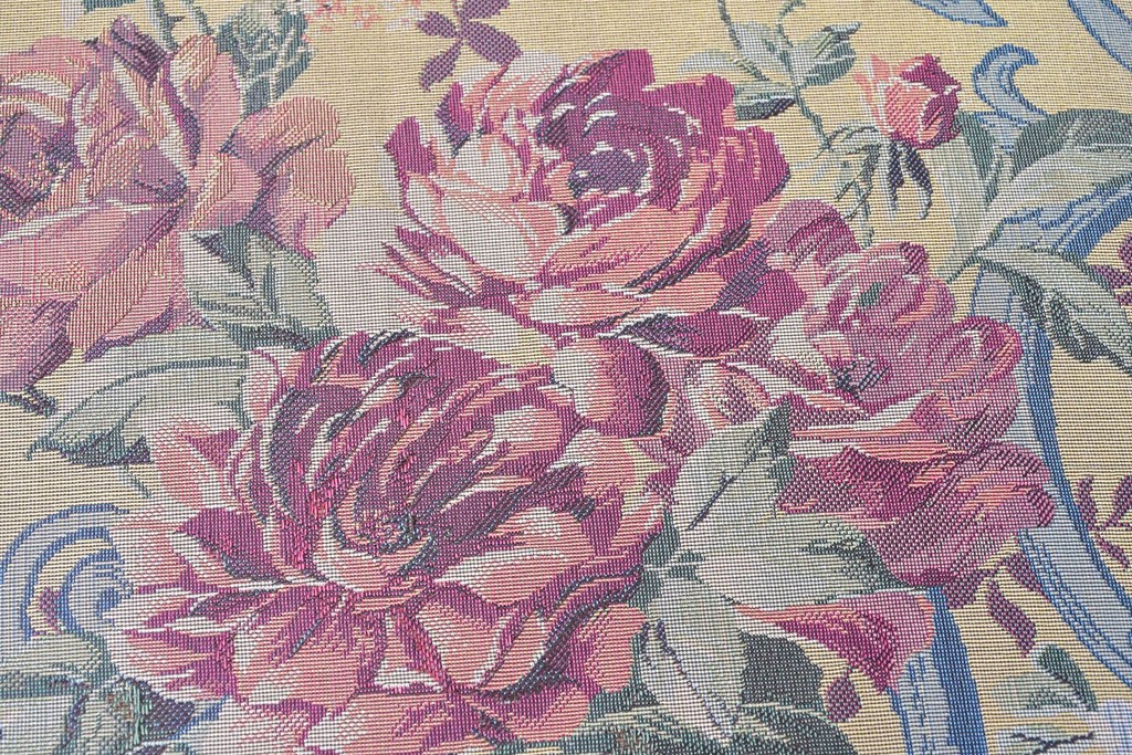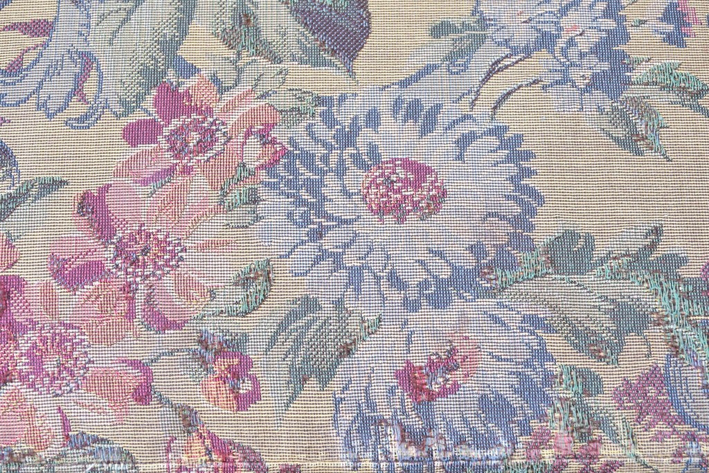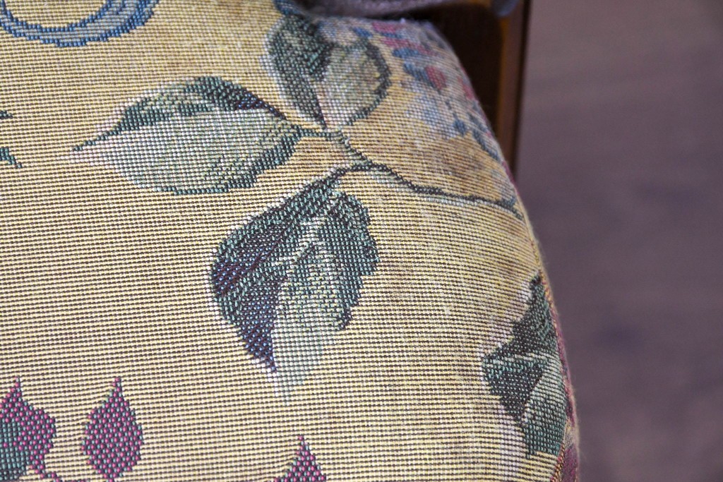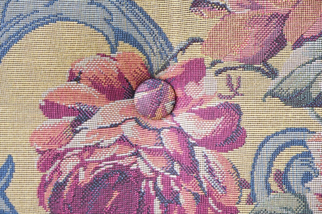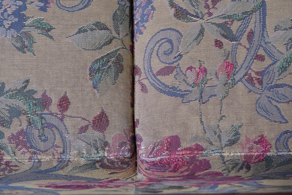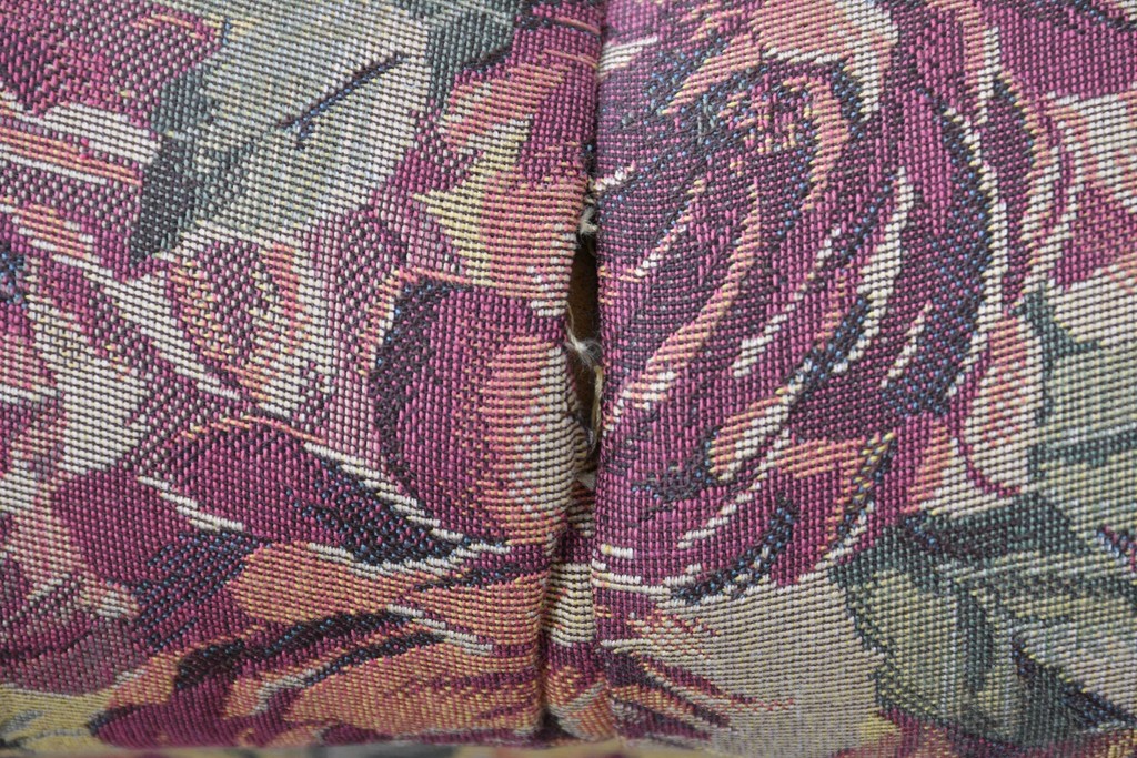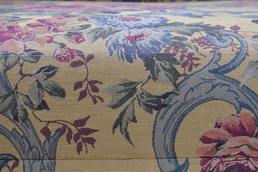 優美な花柄ファブリックと、アーム部に施された彫刻装飾が調和したクラシックな佇まいが魅力です。