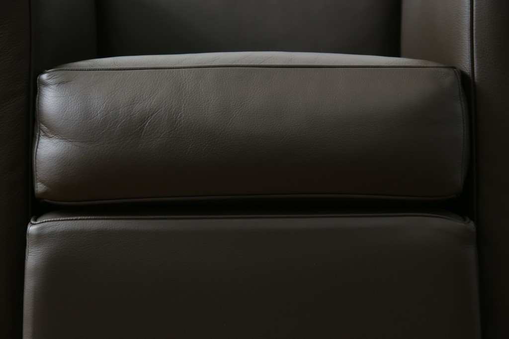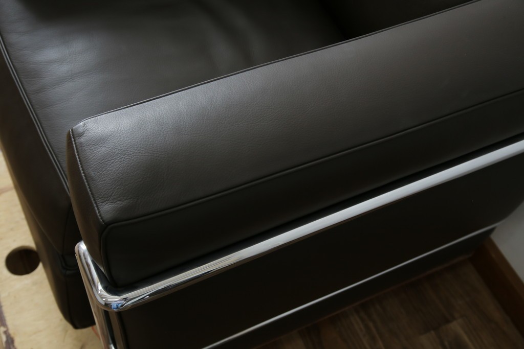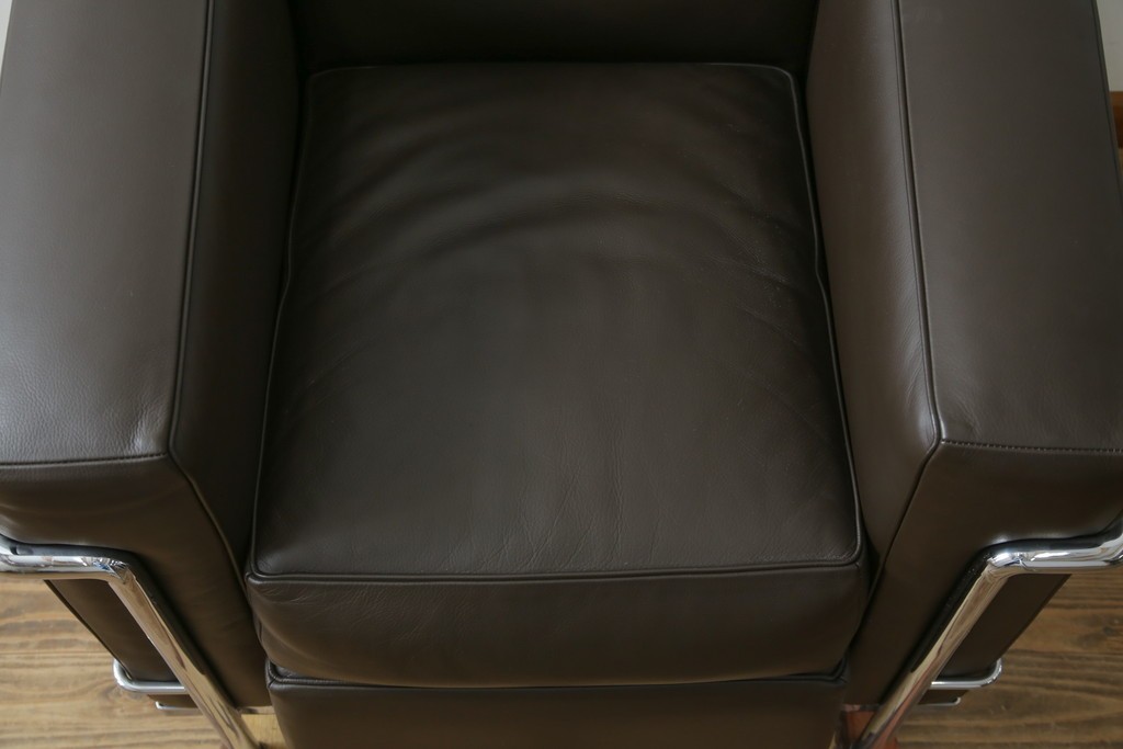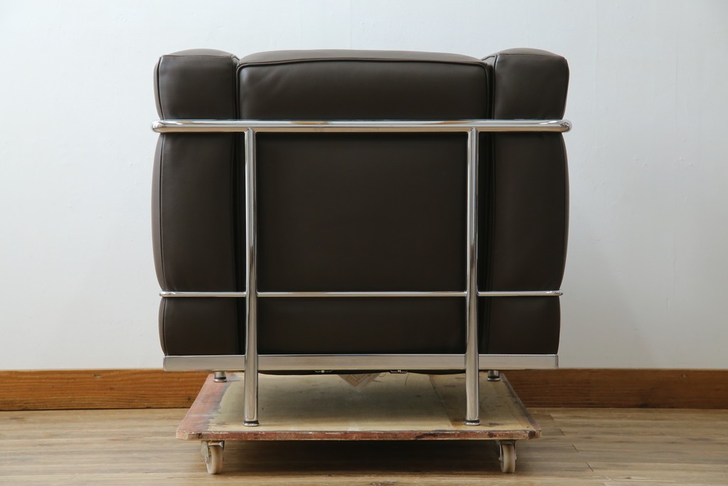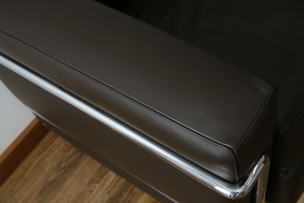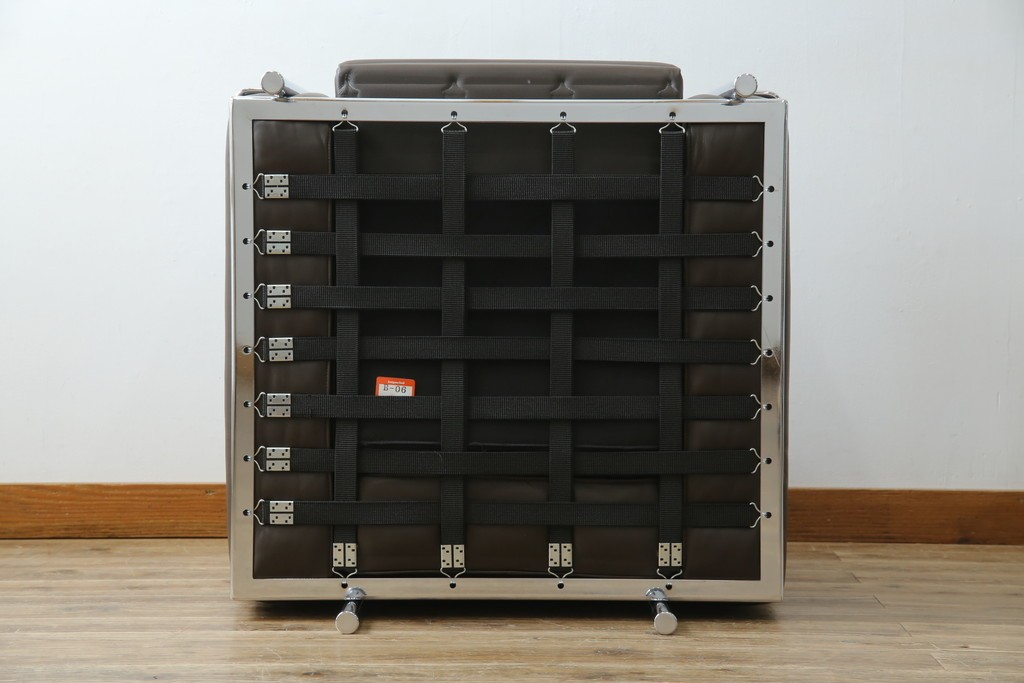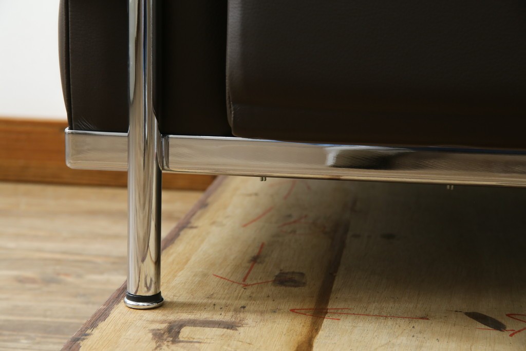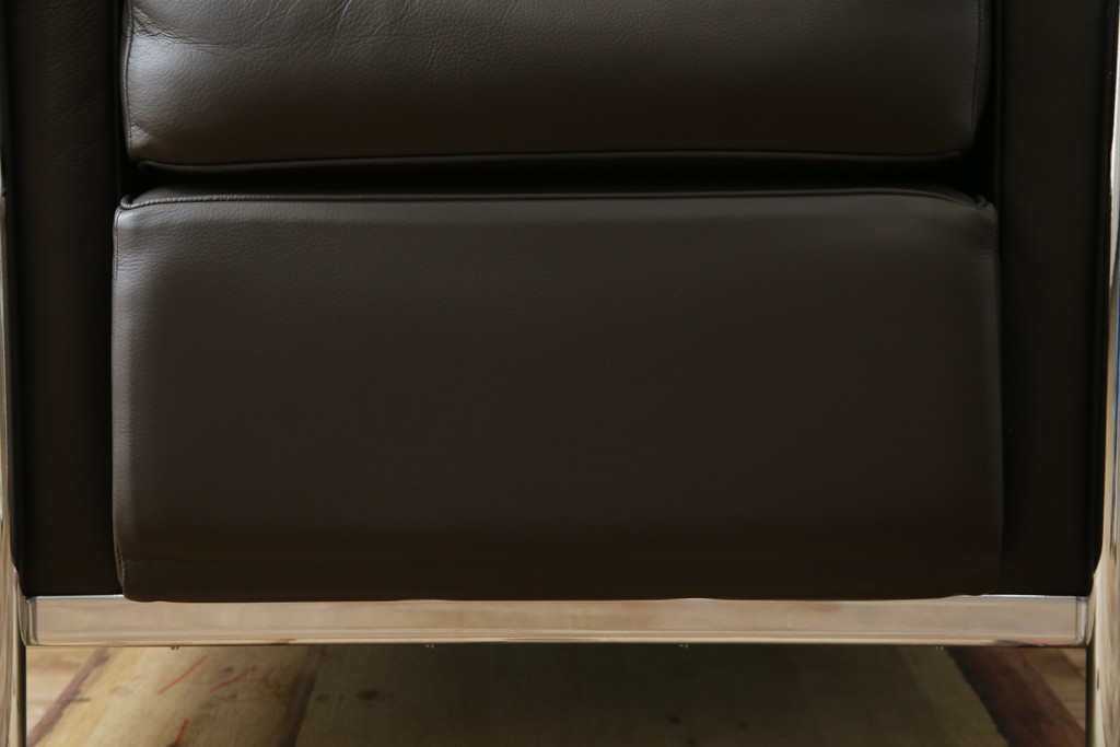 深みのあるダークブラウンレザーは、モダンな印象のクロームフレームとよく調和し、洗練された雰囲気を生み出します。直線的なデザインながら冷たさを感じさせず、リビングや書斎など幅広い空間に自然に馴染む色味です。名作ソファを落ち着いた佇まいで楽しめる一脚です。