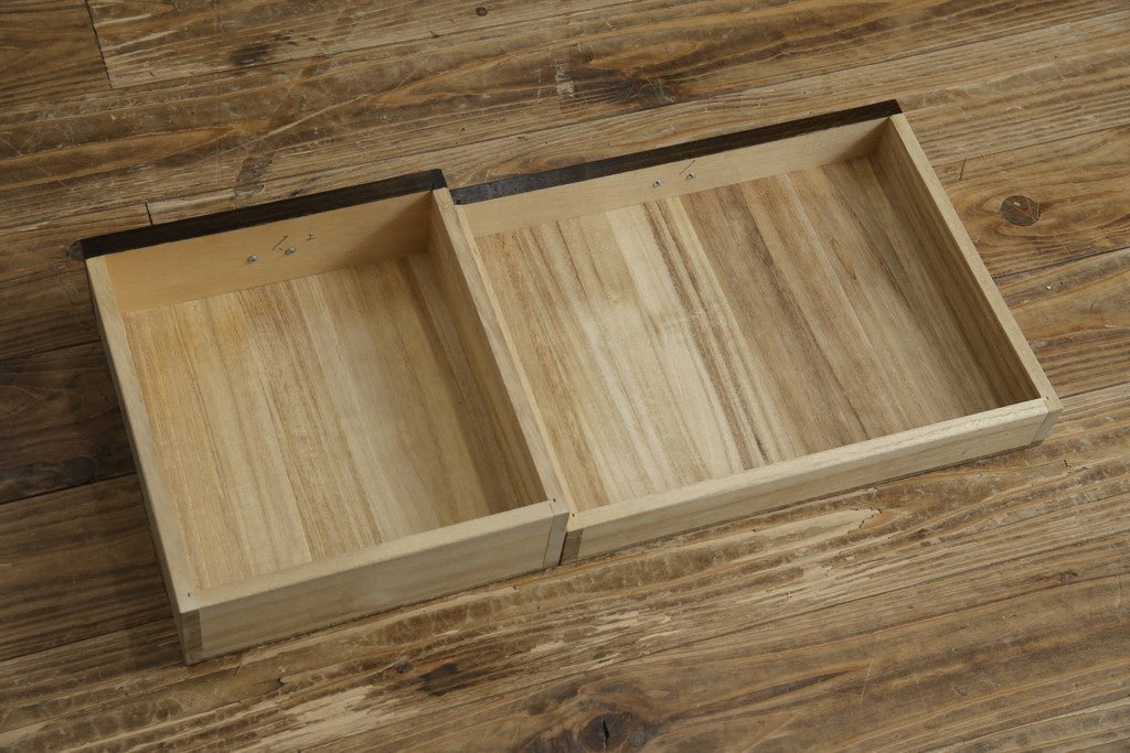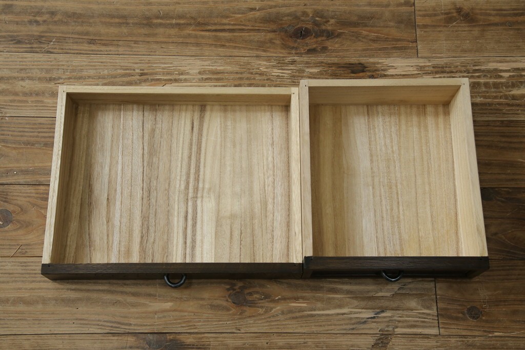引き戸内には棚板や引き出しがあり、食器類や日用品を分けて収納しやすい構成になっています。