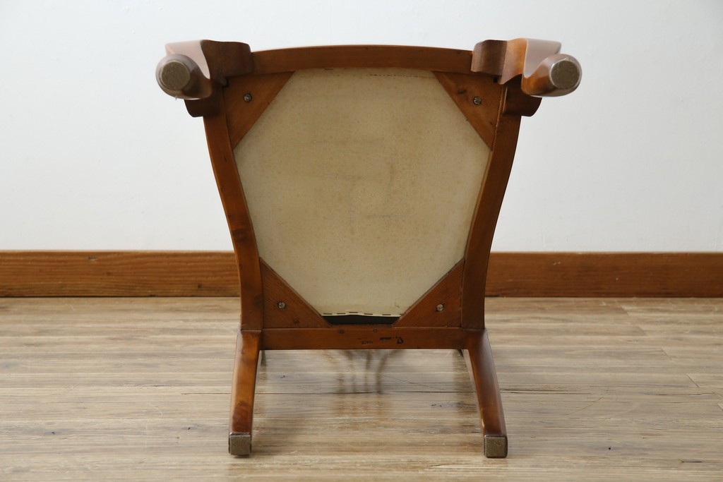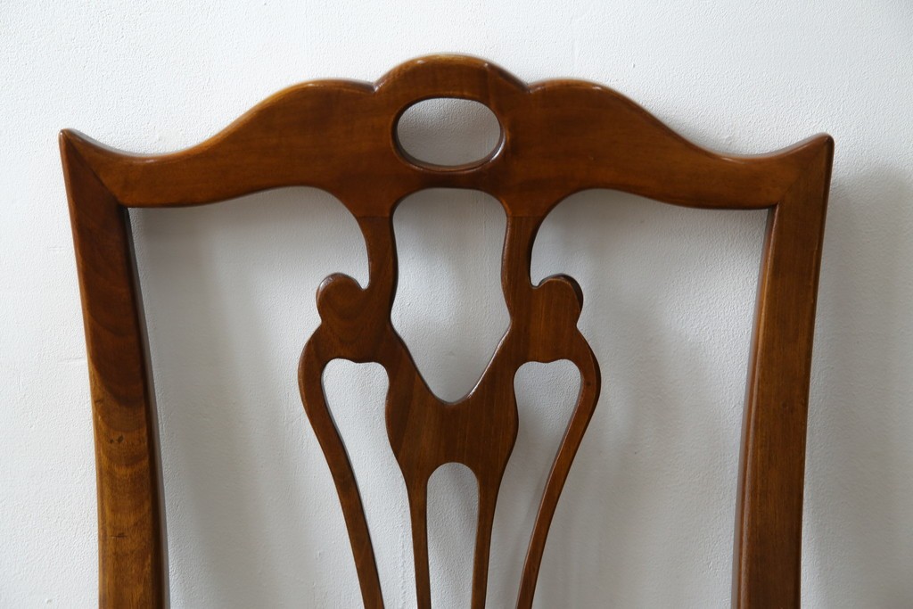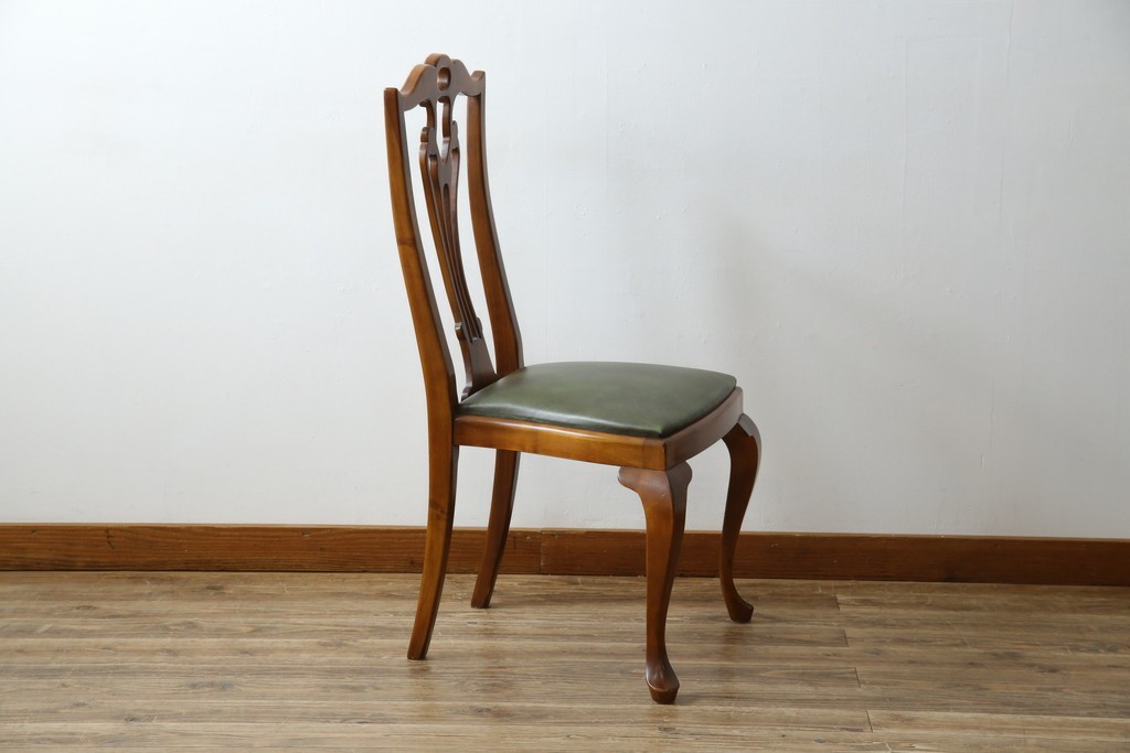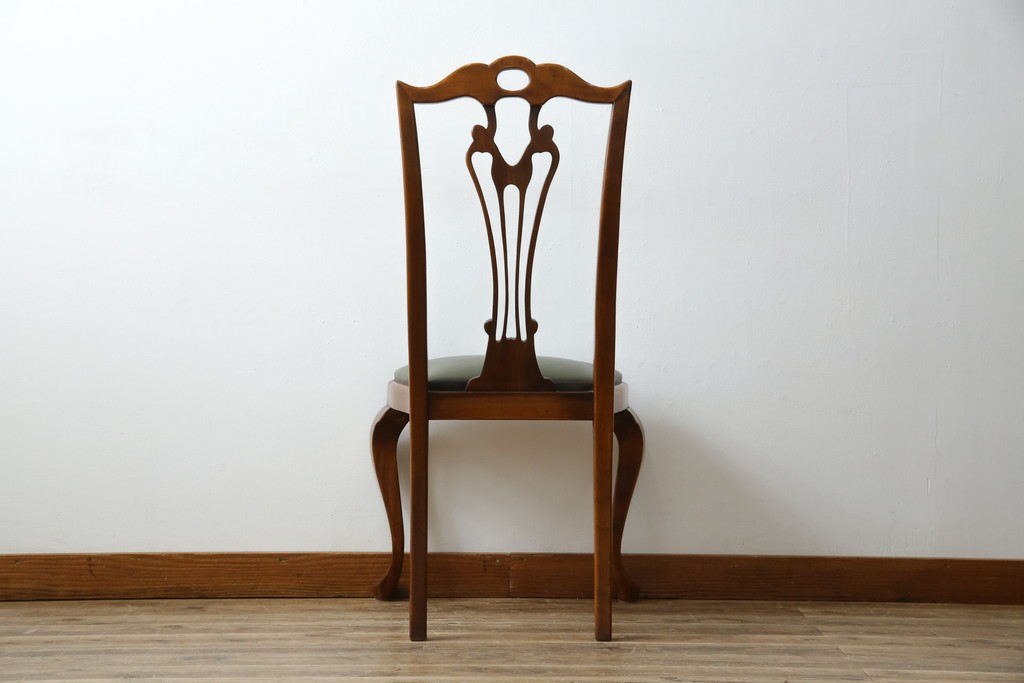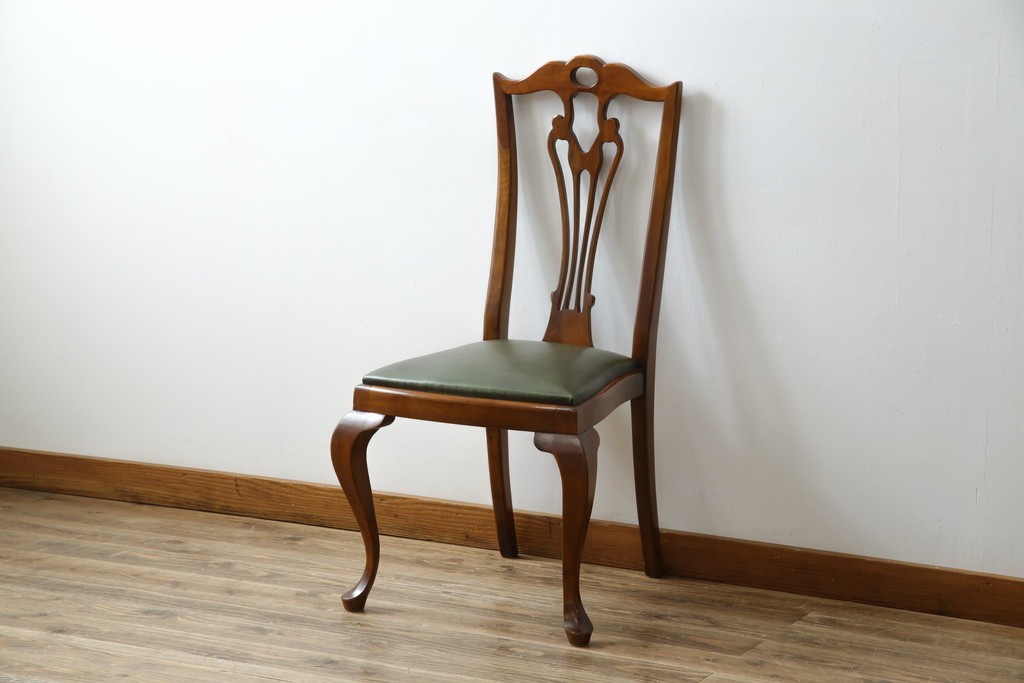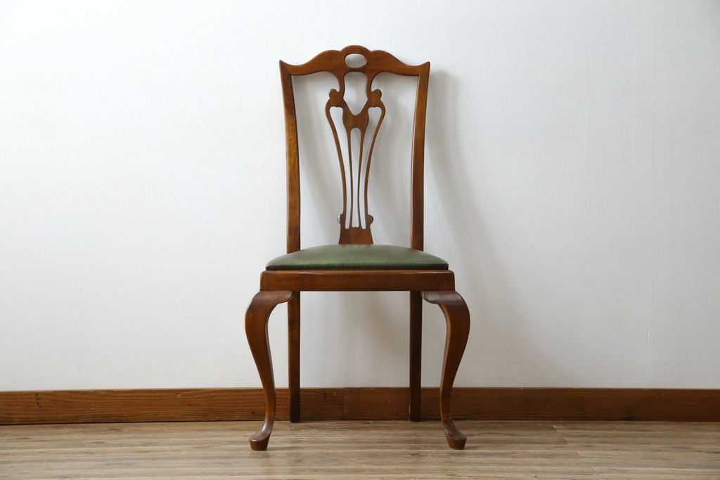 背もたれには優雅なカーブを描く装飾が施され、猫脚の脚部と相まってクラシックな雰囲気を演出します。