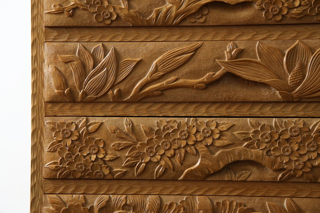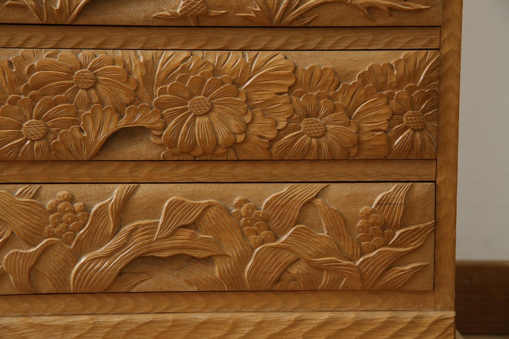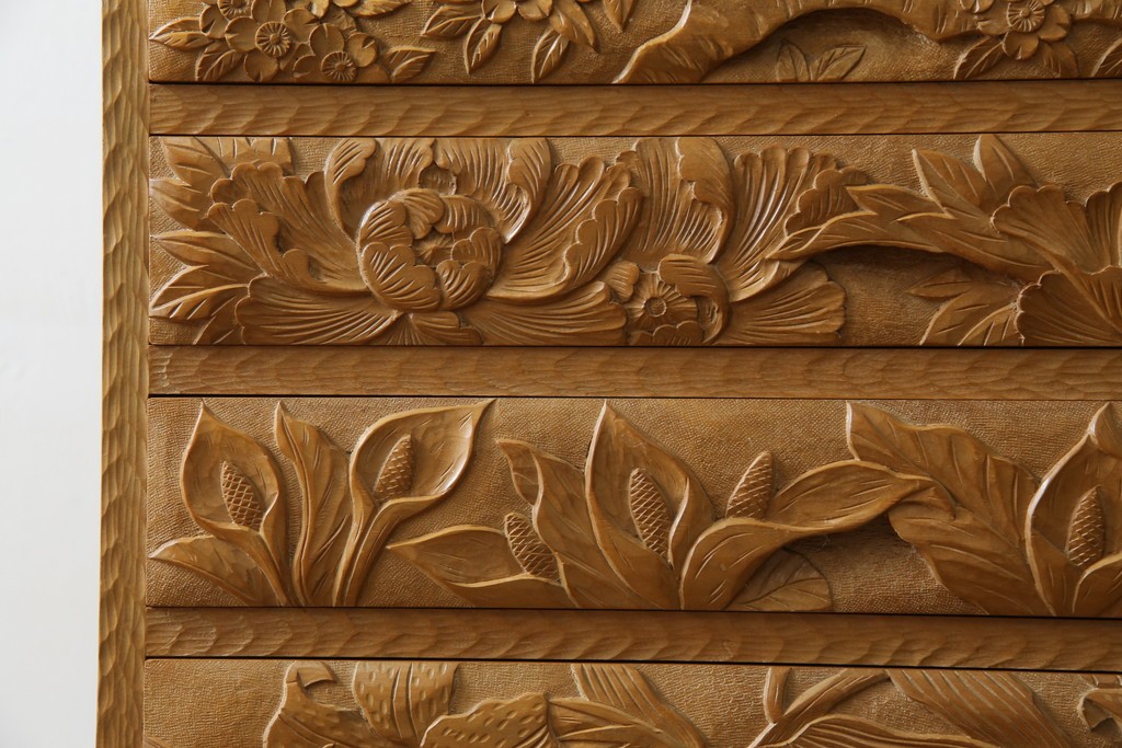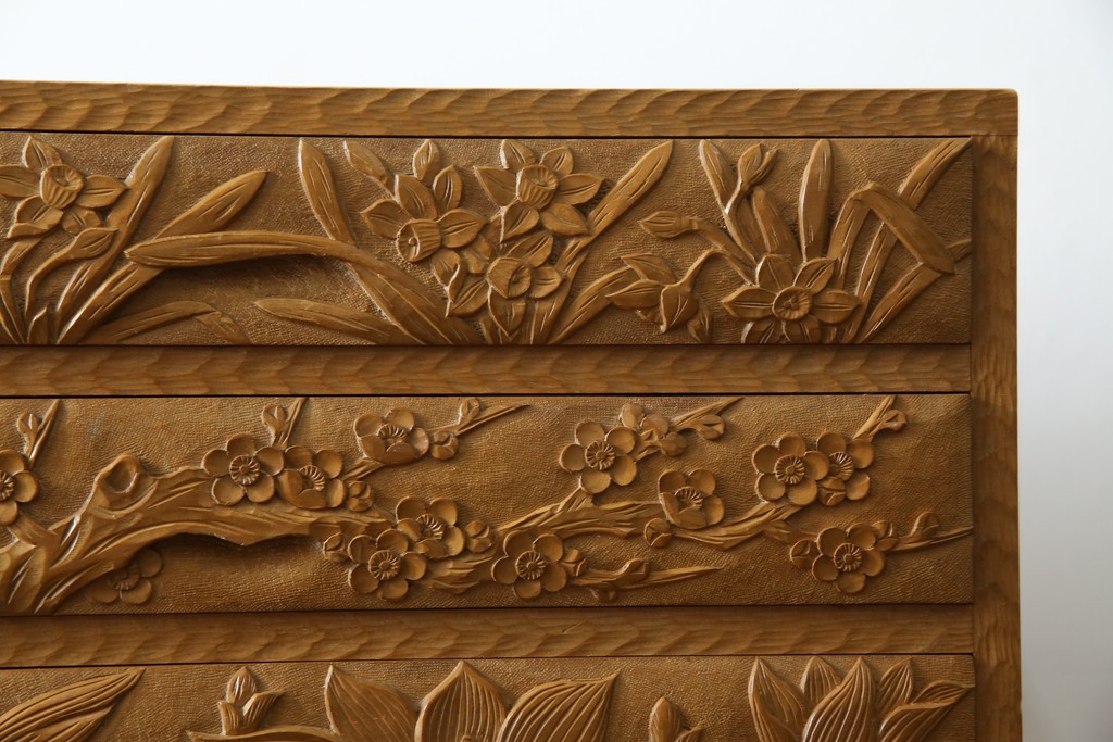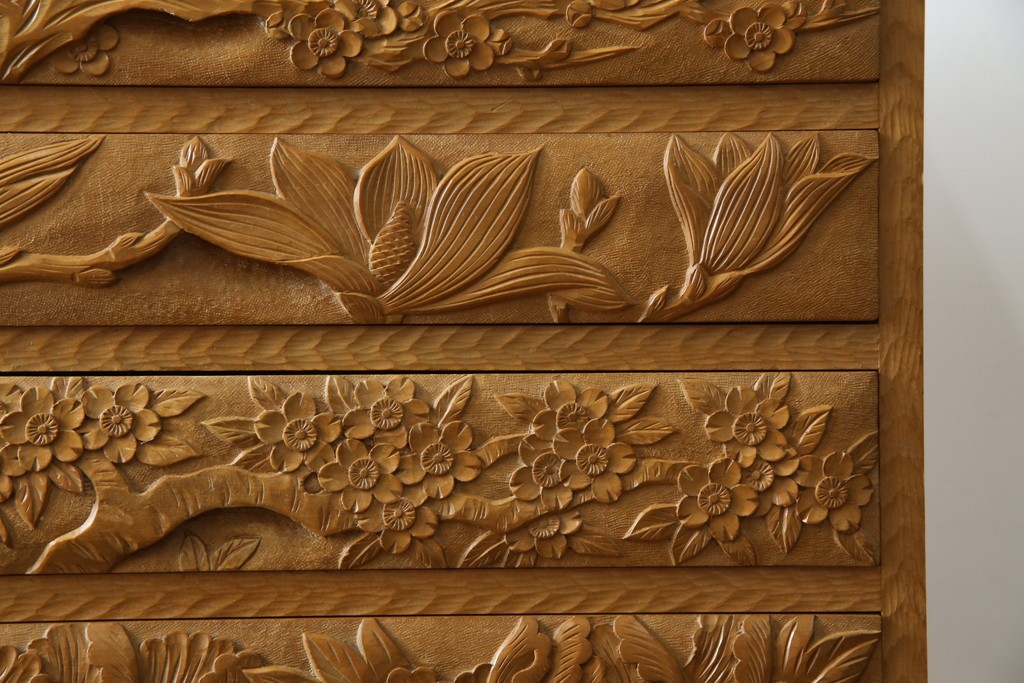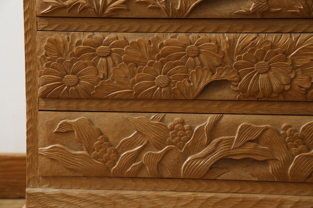 前板いっぱいに日光彫りの草花文が施された、贅沢な意匠のチェストです。一段ごとにモチーフが変化し、花々や葉の重なりなどが立体的に表現されています。陰影がきれいに出る彫り口で、光の当たり方によって表情が変わり、眺めているだけでも楽しい一台です。