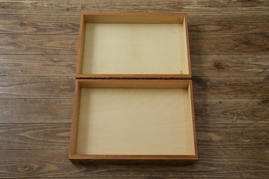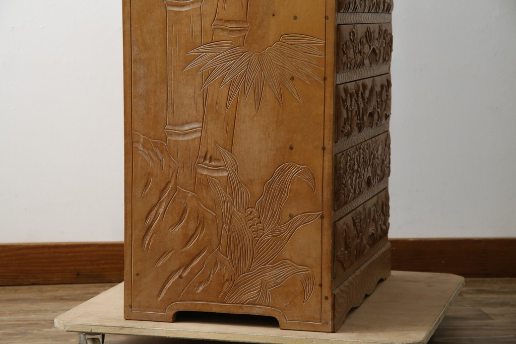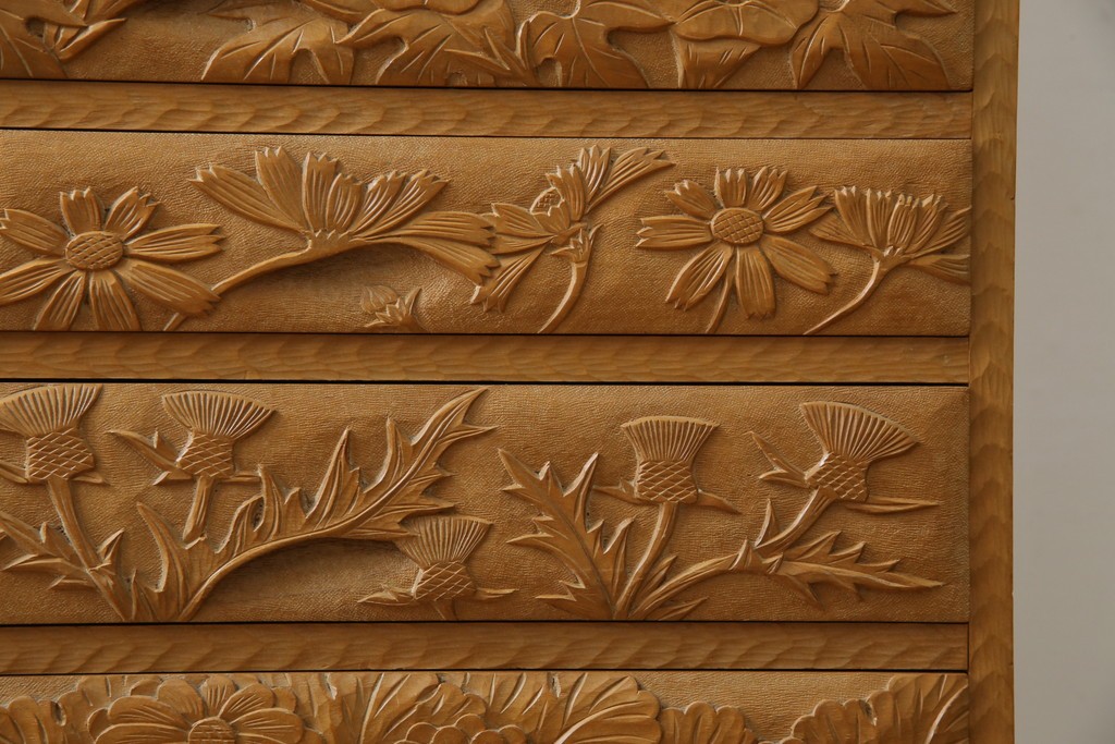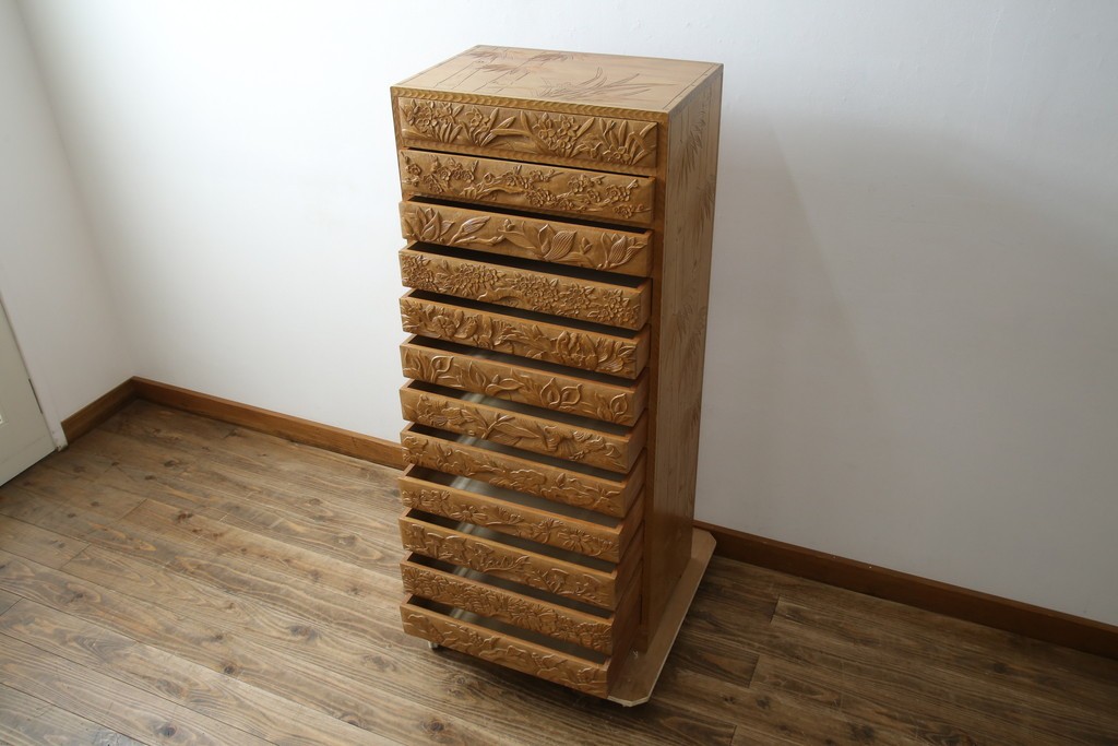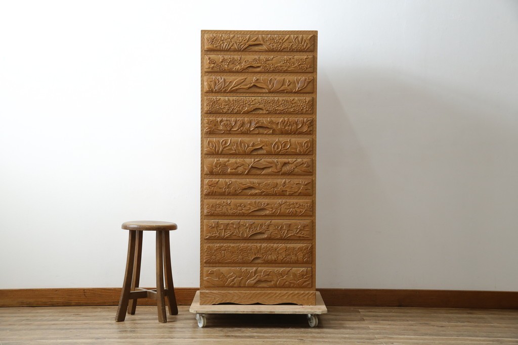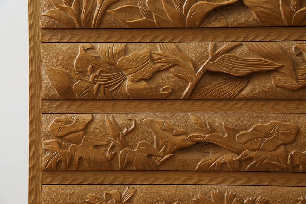 前板いっぱいに日光彫りの草花文が施された、贅沢な意匠のチェストです。一段ごとにモチーフが変化し、花々や葉の重なりなどが立体的に表現されています。陰影がきれいに出る彫り口で、光の当たり方によって表情が変わり、眺めているだけでも楽しい一台です。