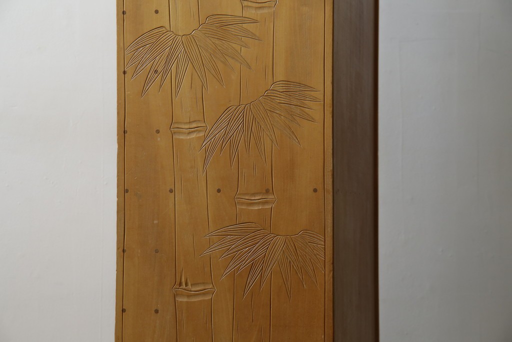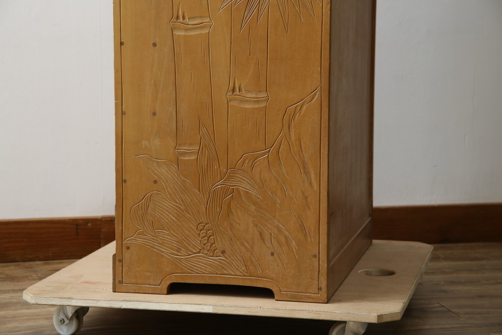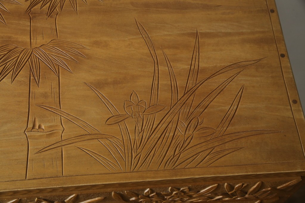 側面と天板には竹と草花が伸びやかに彫り込まれ、どの方向から見ても見栄えのするデザインに仕上がっています。竹の節や葉の線刻も丁寧で、和の風情をやさしく感じさせてくれます。和室はもちろん、和モダンや古民家風インテリアのアクセントとしても取り入れやすい雰囲気です。