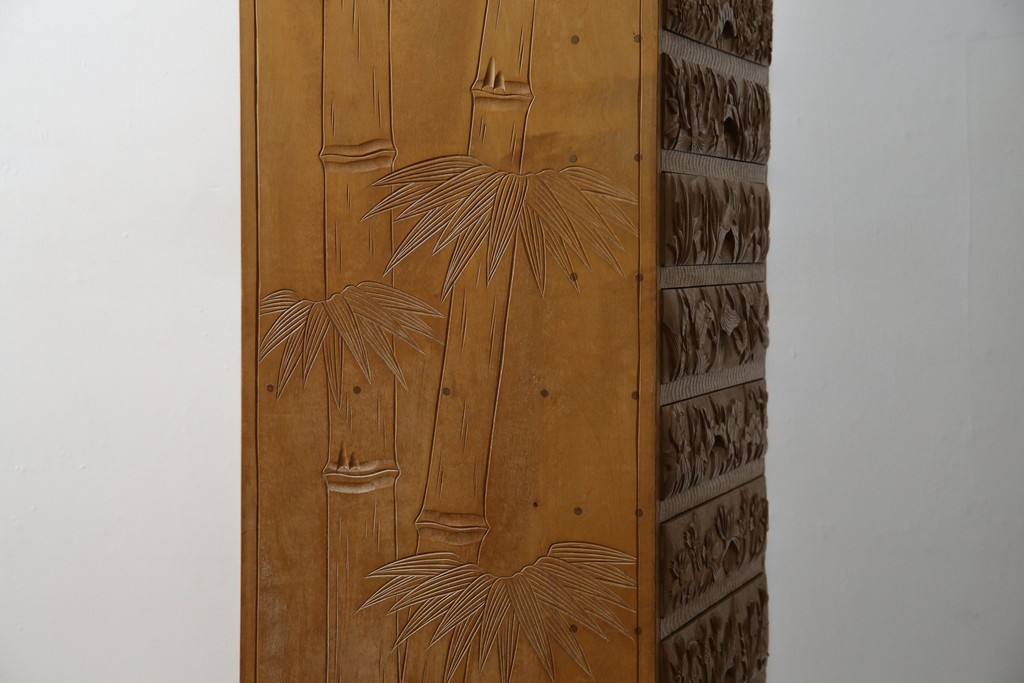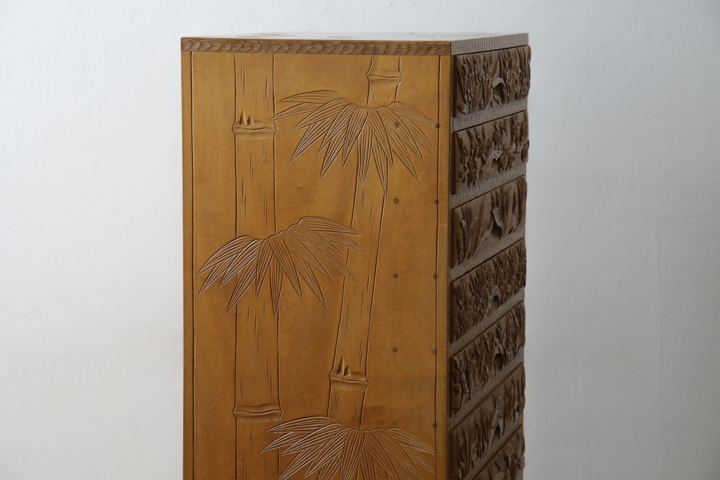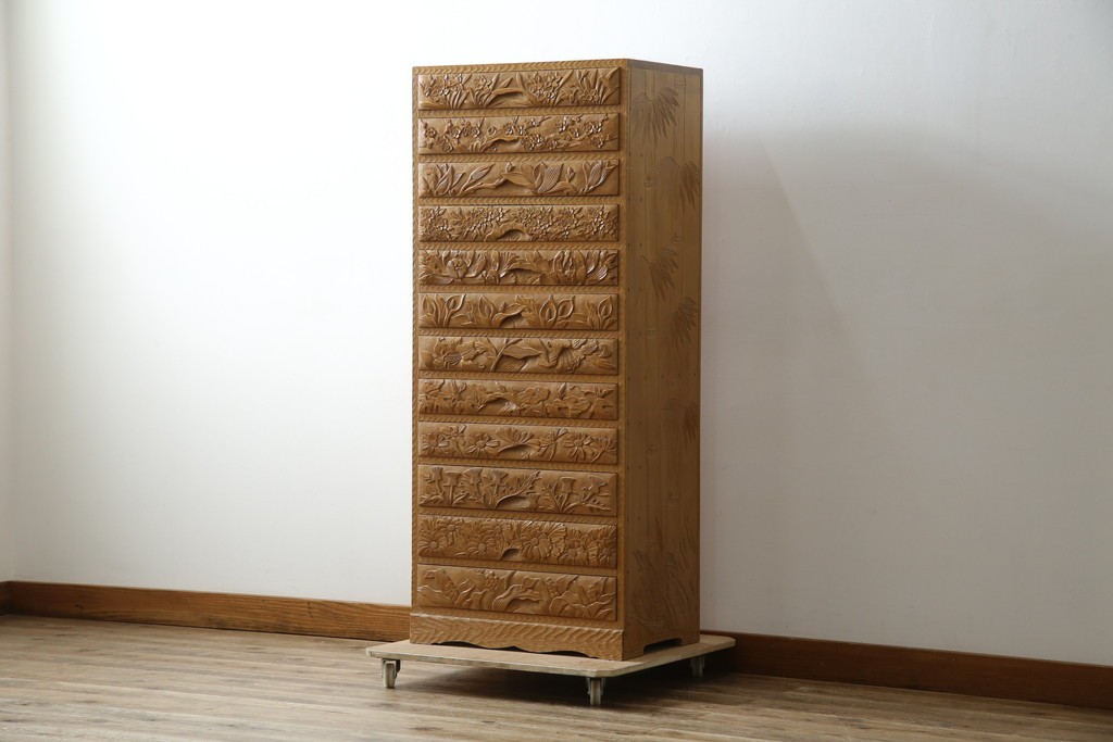 高さを生かしたスリムな多段チェストのため、設置スペースを抑えながら引き出し収納をたっぷり確保できます。廊下や玄関脇など限られた場所にも置きやすく、細かな衣類や小物の整理に重宝します。装飾性と実用性を兼ね備えた、日常使いしやすい日光彫り家具です。