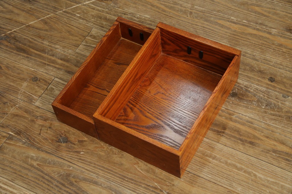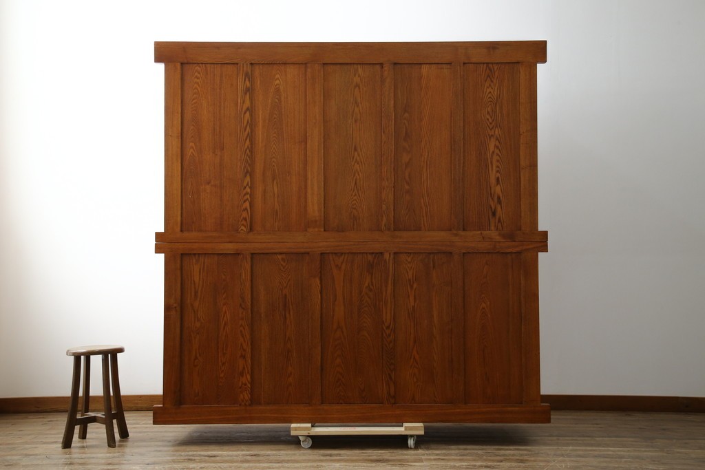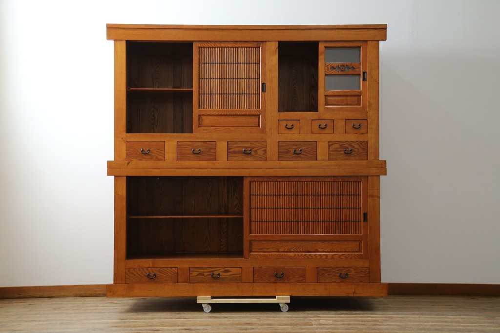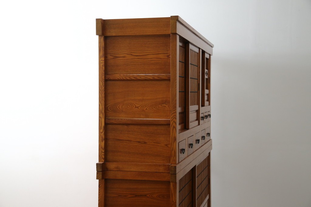 上下に重ねて構成された水屋箪笥は、収納力の高さと堂々とした風格が魅力です。食器や日用品をゆったり収められ、引き戸中心の設計により動線を妨げない利便性も備えています。現代住宅でも取り入れやすい落ち着いた木色が、空間に温もりを添えてくれます。