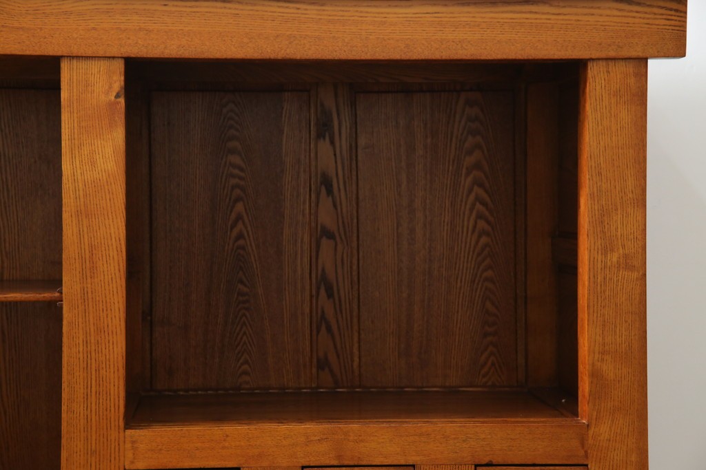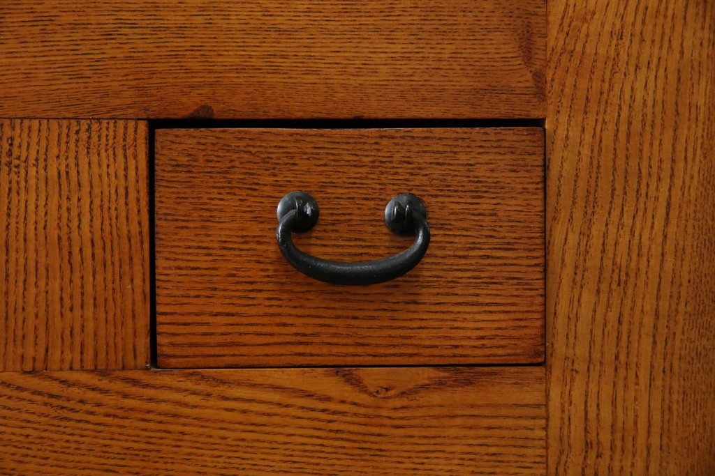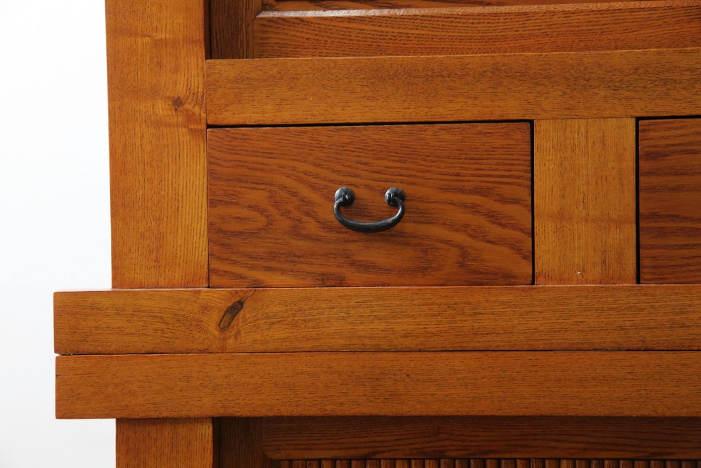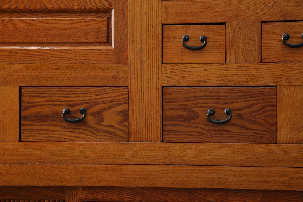 大小さまざまな引き出しと棚スペースが配置され、用途に合わせて使い分けができます。細かな物の整理から大皿や器の収納まで幅広く対応し、生活の道具をすっきりと収められます。実用性と意匠性を兼ね備えた、永く使いたくなる一品です。