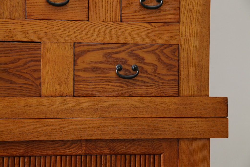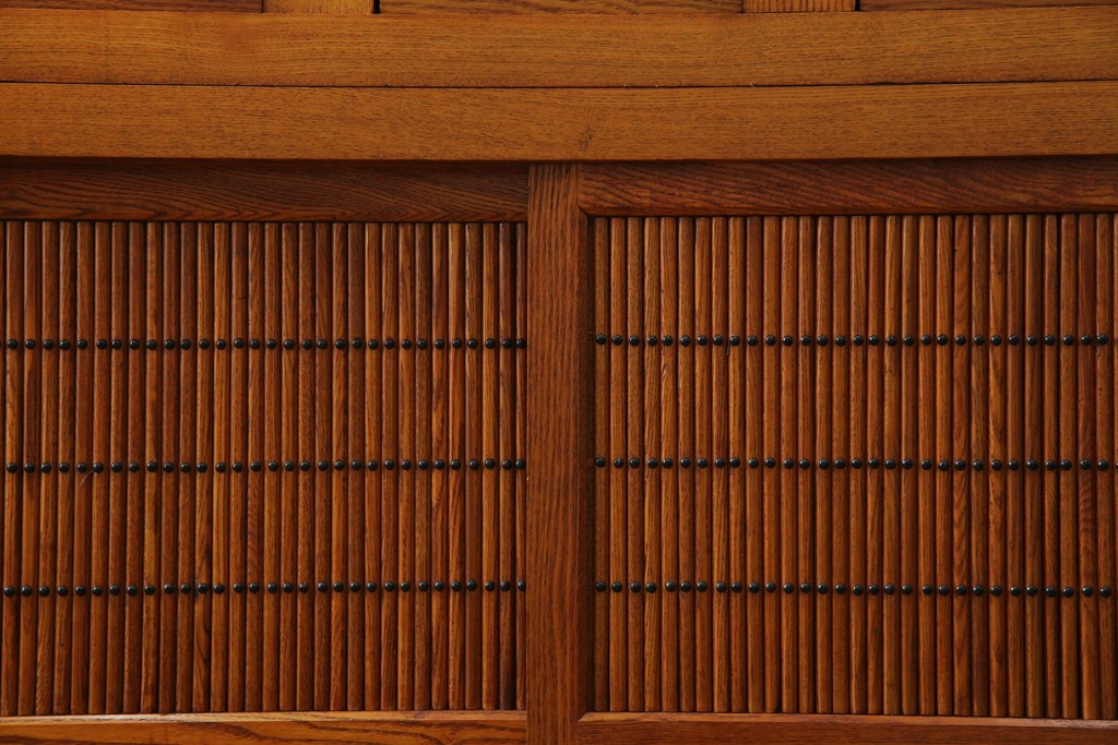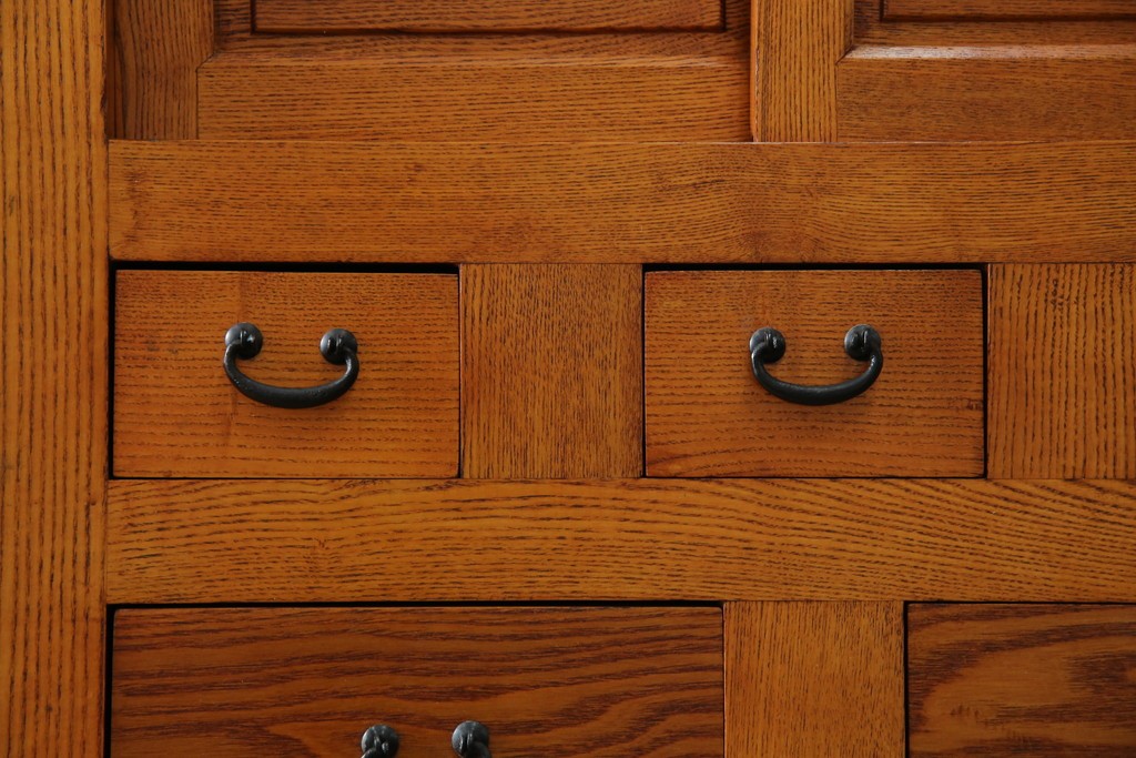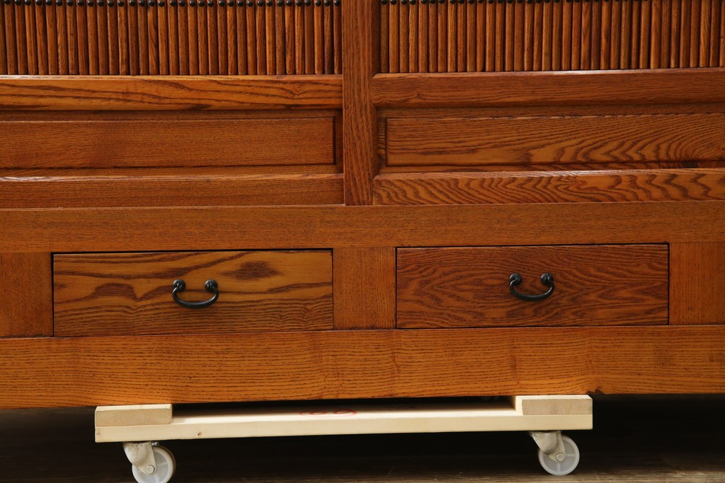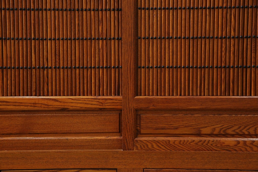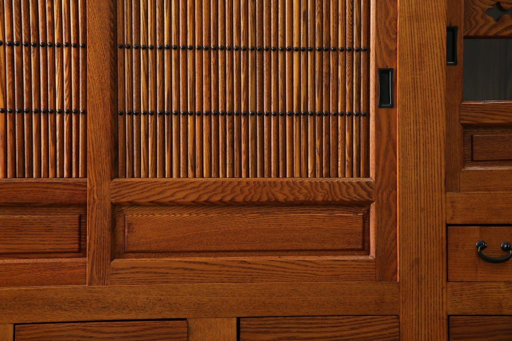 前面に施された細かな格子は、均整の取れた美しい仕上がりで、伝統的な職人技を感じさせます。扉や引き出しに使われた木肌には自然の木目が生かされ、光の当たり方で豊かな表情を見せます。日常の中に和の美しさを楽しめる、上質なつくりが印象的です。