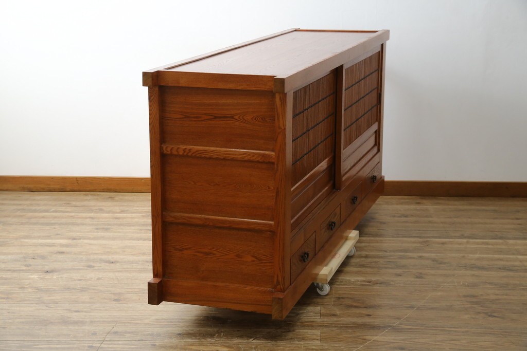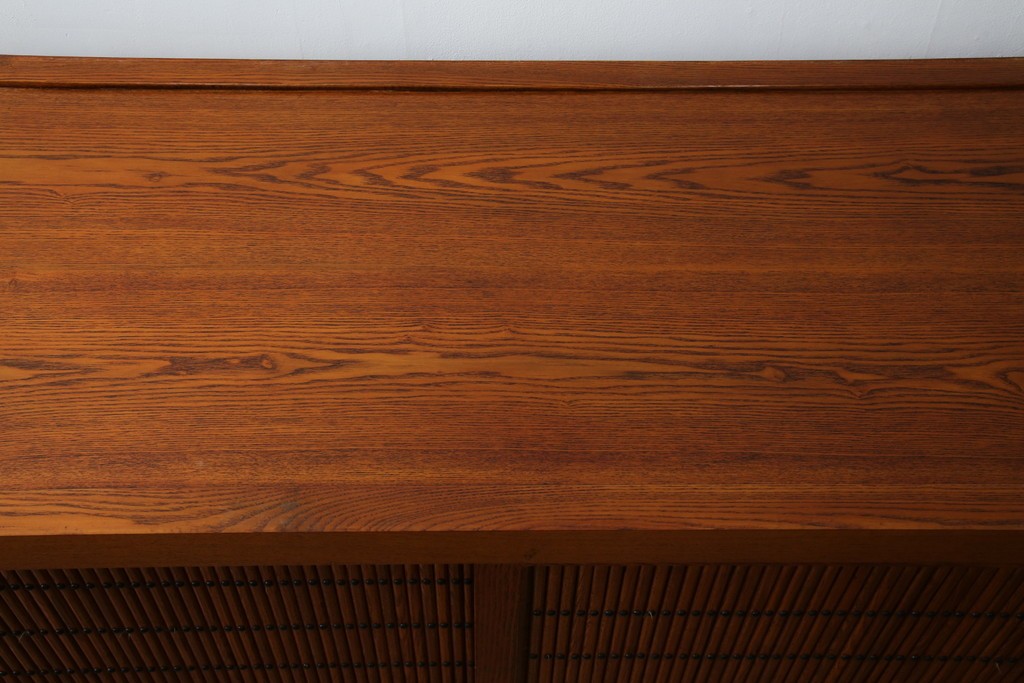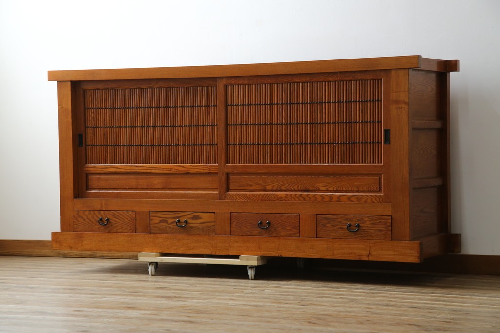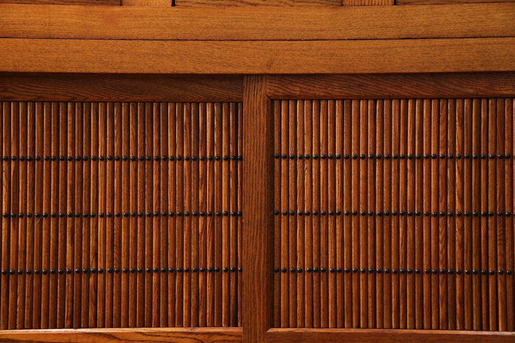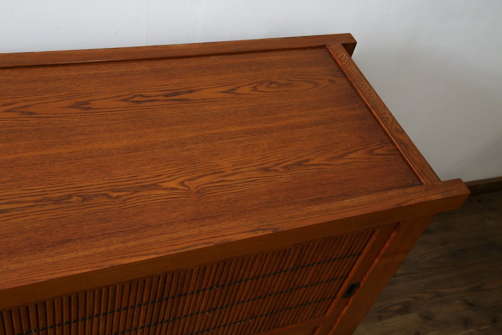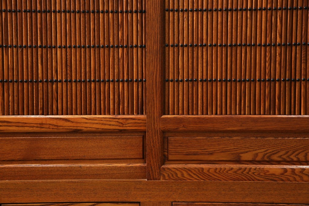 細かく整った丸桟が並ぶ格子戸は、和家具らしい落ち着いた趣を感じさせます。戸板には均一で美しい木目が広がり、職人による丁寧な仕上げが家具全体の品格を高めています。光の当たり方によって木肌がやわらかく艶めき、空間に温かみを添えてくれます。