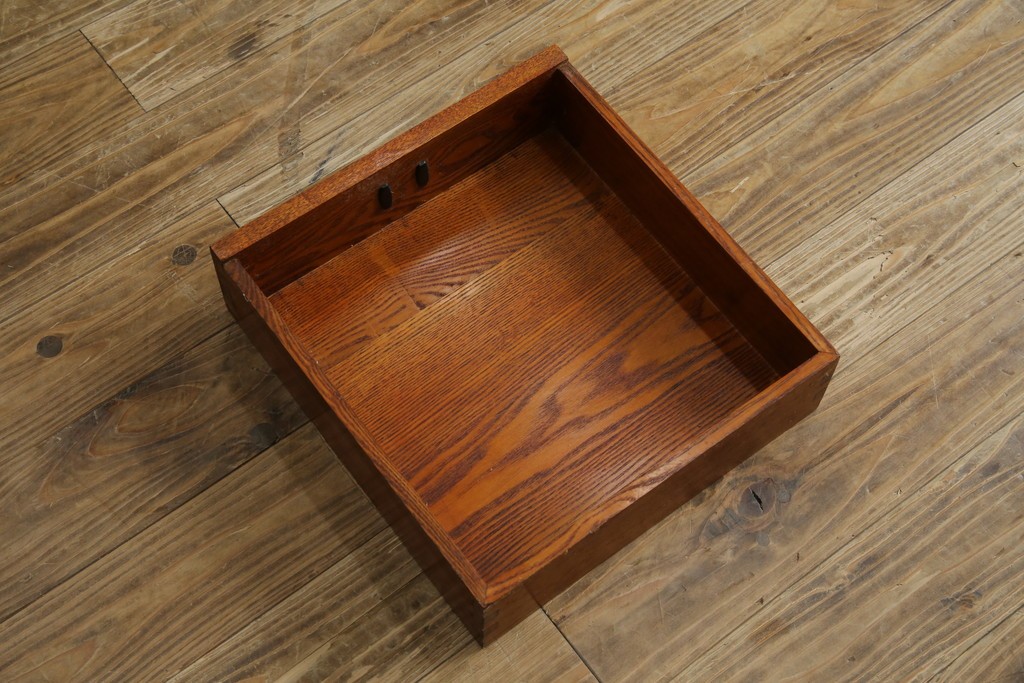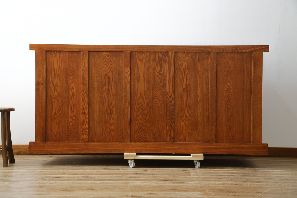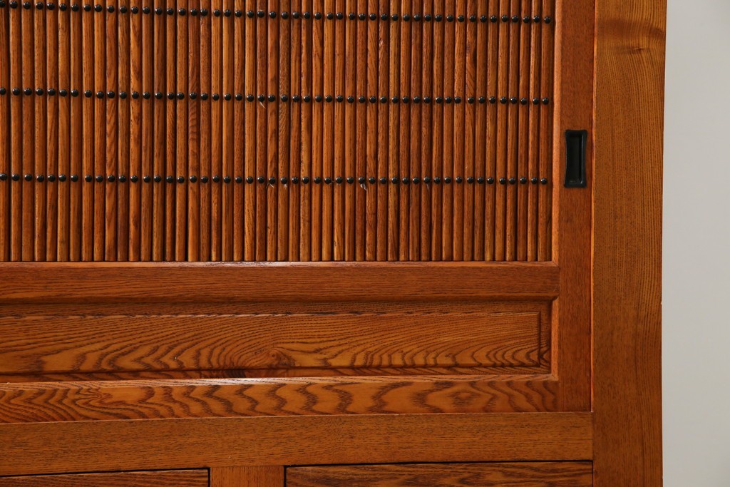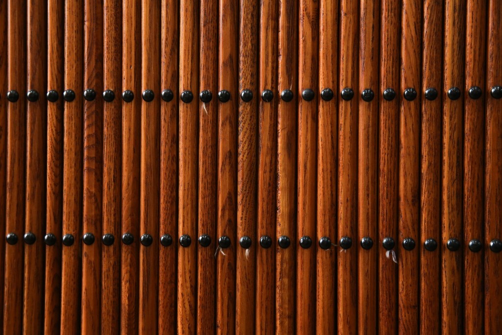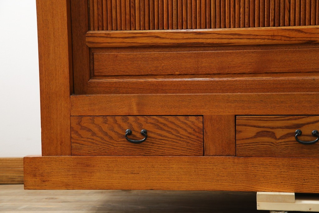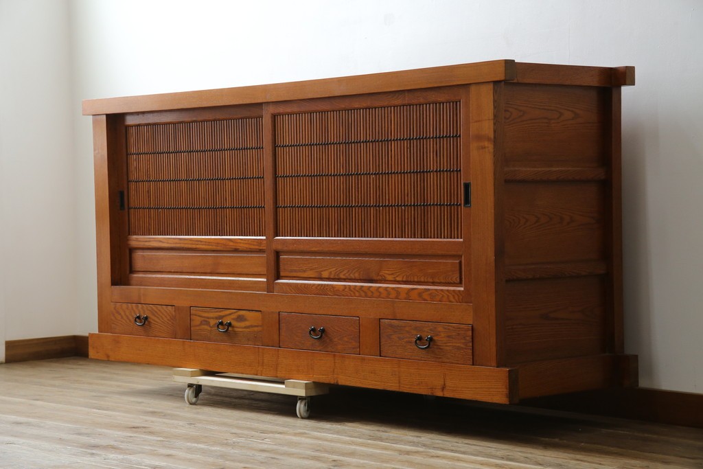 細かく整った丸桟が並ぶ格子戸は、和家具らしい落ち着いた趣を感じさせます。戸板には均一で美しい木目が広がり、職人による丁寧な仕上げが家具全体の品格を高めています。光の当たり方によって木肌がやわらかく艶めき、空間に温かみを添えてくれます。