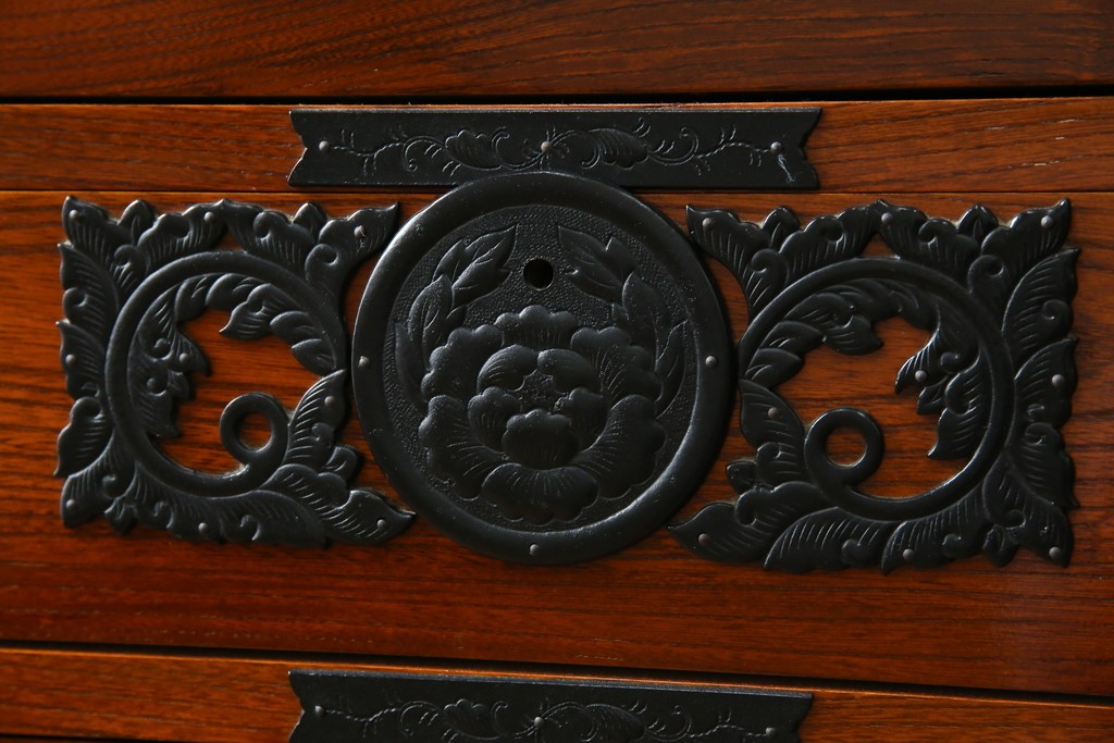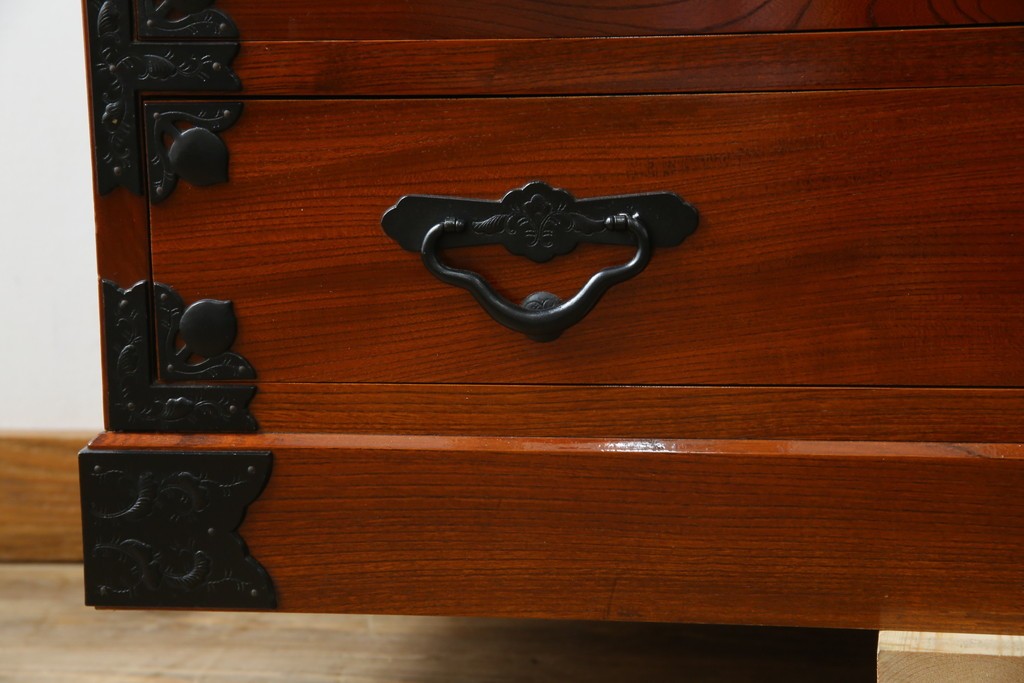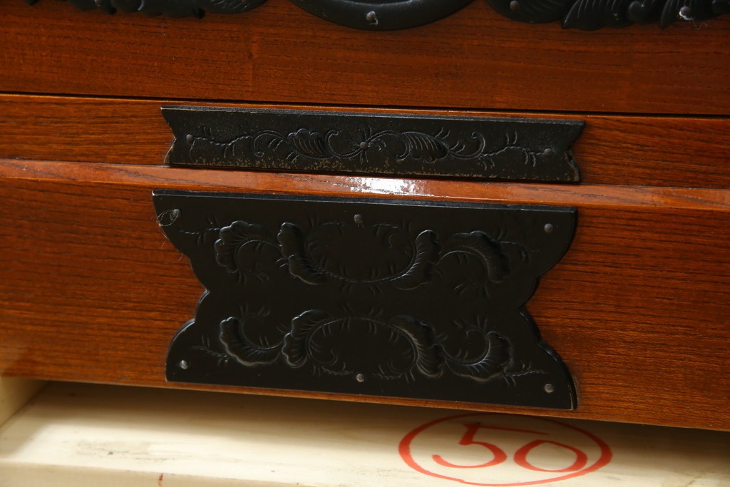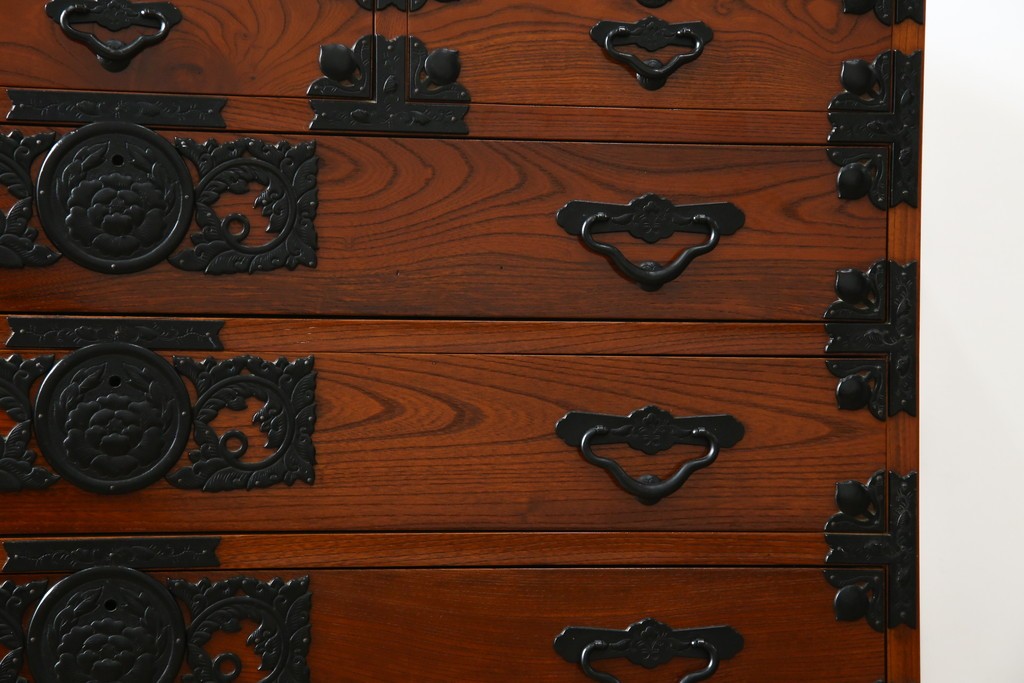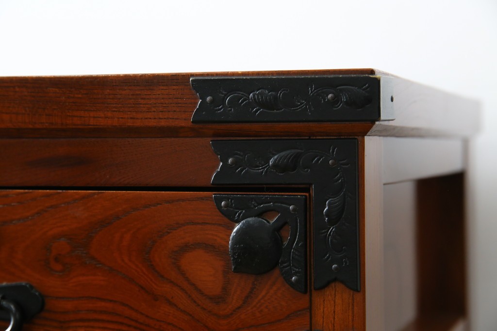 前面に施された装飾金具は、植物文様が丁寧に彫り込まれた重厚なつくりで、仙台箪笥ならではの華やかさを添えています。引手や要所の飾り金具は細部まで作り込まれており、和家具の美を象徴するような存在感があります。意匠性と実用性を両立させた上手物ならではの仕上がりです。