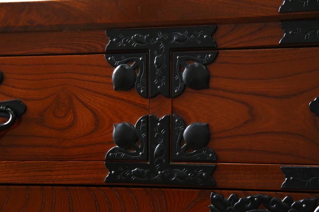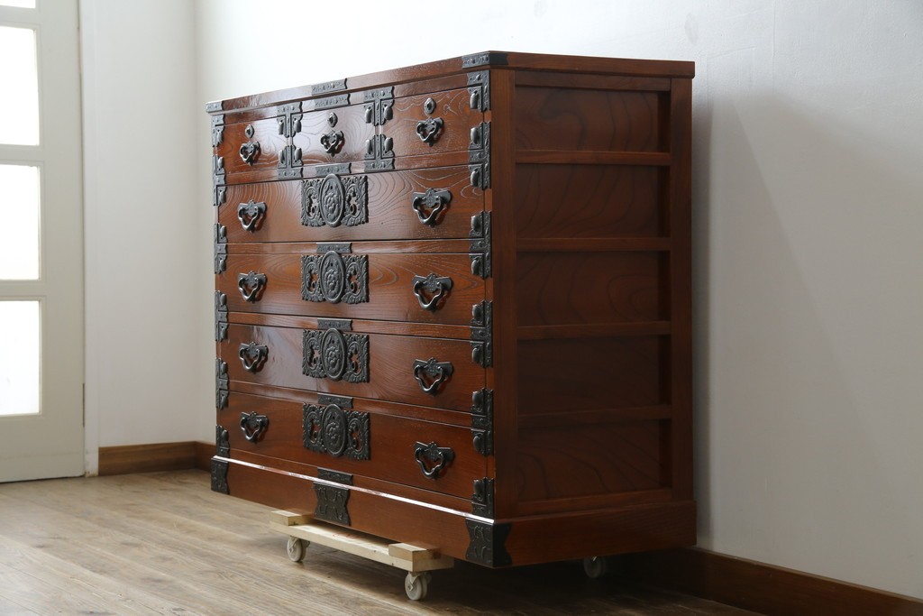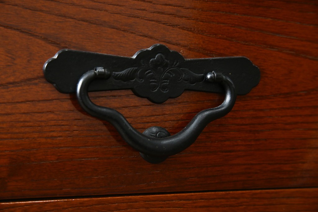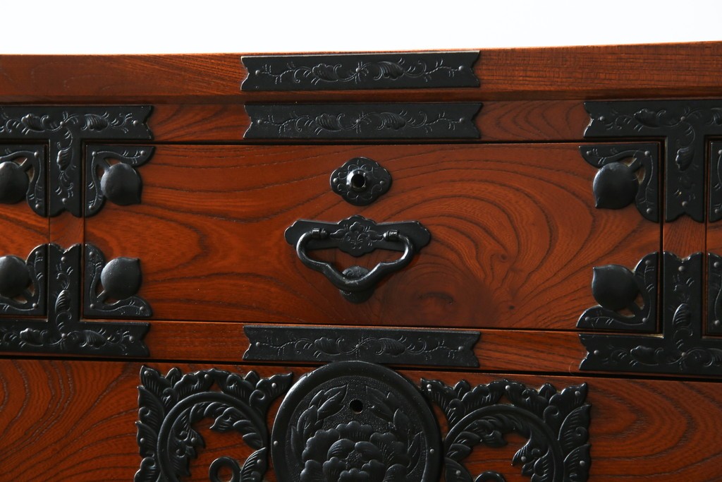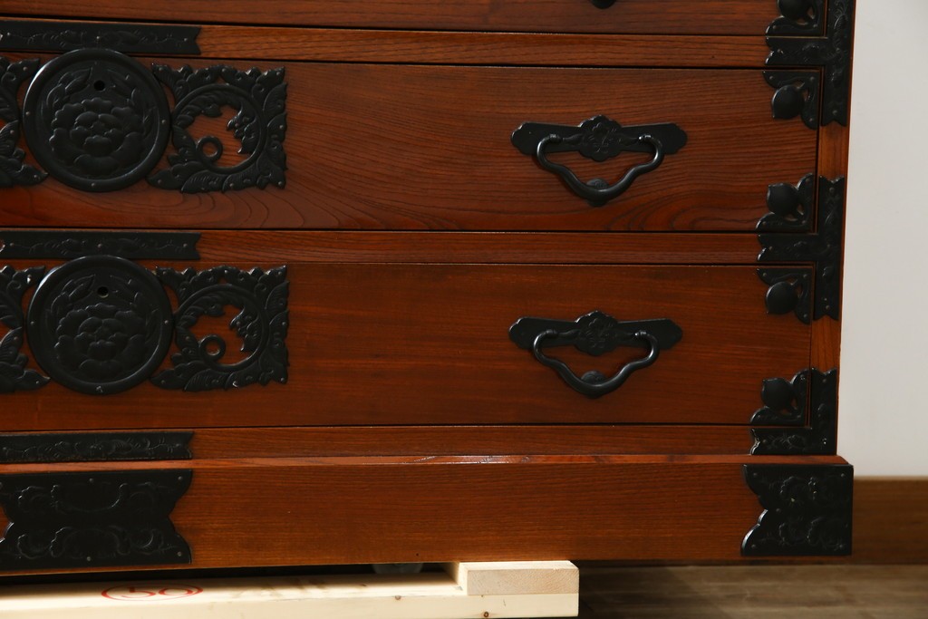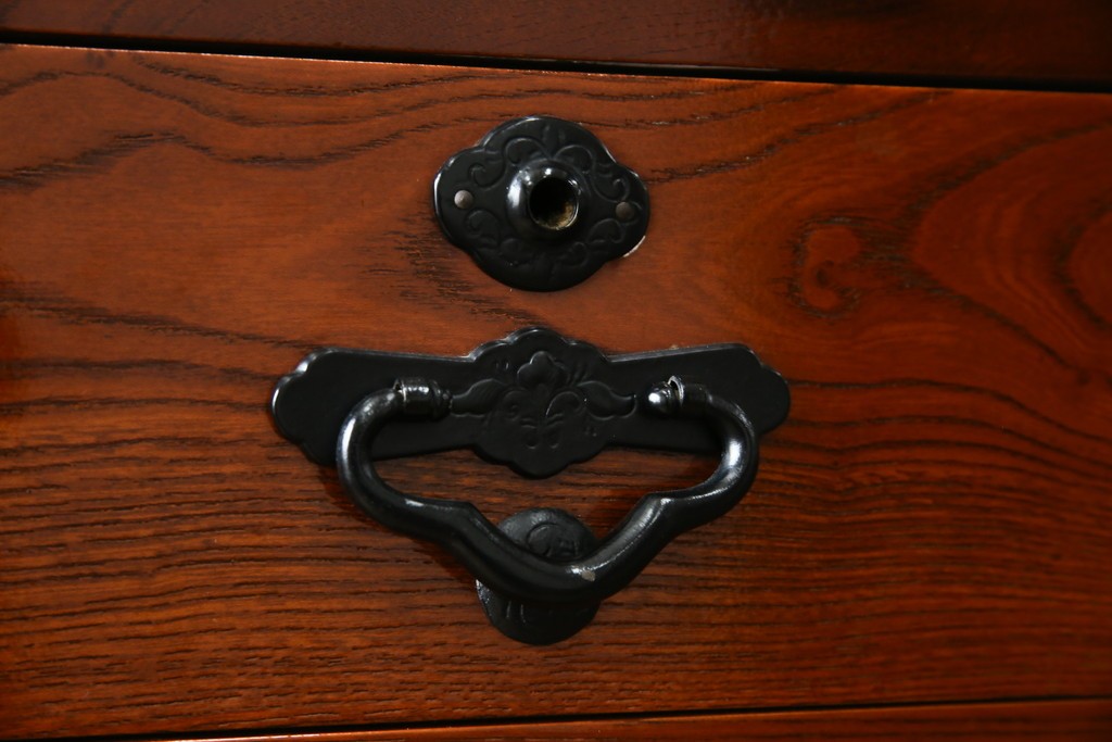 前面に施された装飾金具は、植物文様が丁寧に彫り込まれた重厚なつくりで、仙台箪笥ならではの華やかさを添えています。引手や要所の飾り金具は細部まで作り込まれており、和家具の美を象徴するような存在感があります。意匠性と実用性を両立させた上手物ならではの仕上がりです。