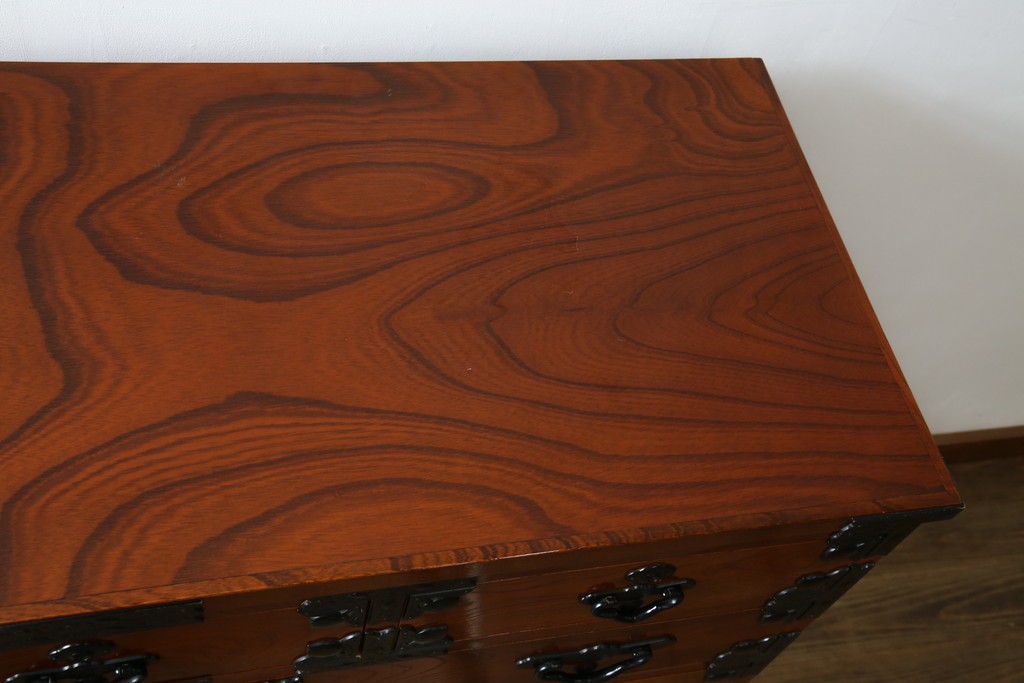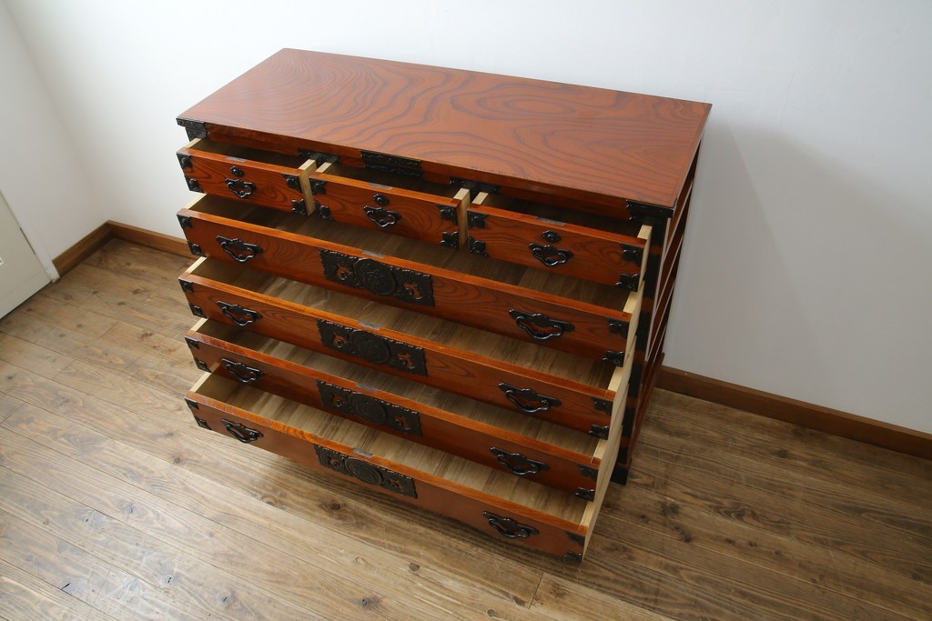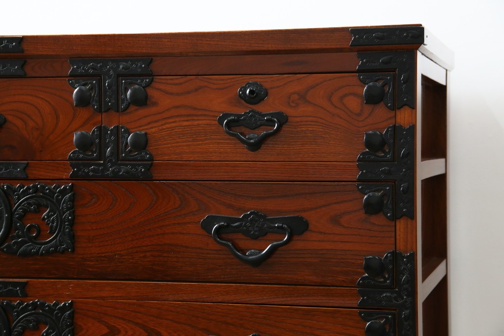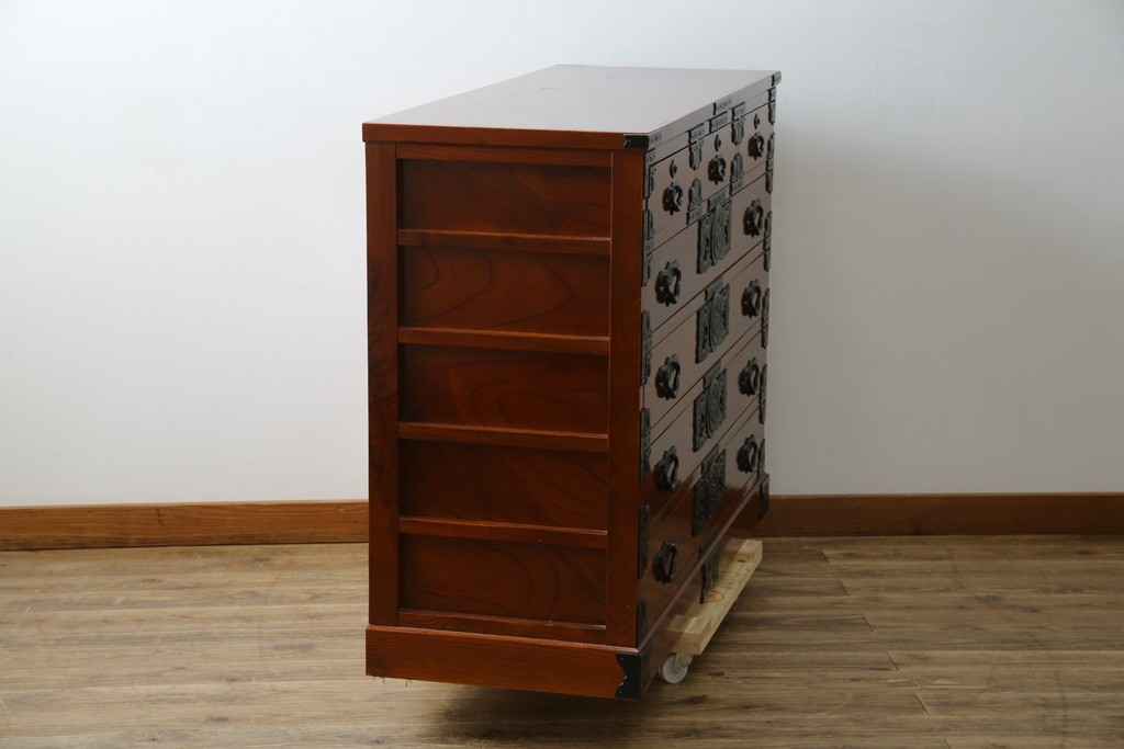 複数段の引き出しを備え、衣類から小物まで整理しやすい構造になっています。内部は木肌の温かみを感じるつくりで、日常の収納に快適さをもたらします。和室はもちろん、現代的な空間にも映える落ち着いた存在感があり、暮らしに伝統の趣を取り入れたい方にぴったりの一台です。