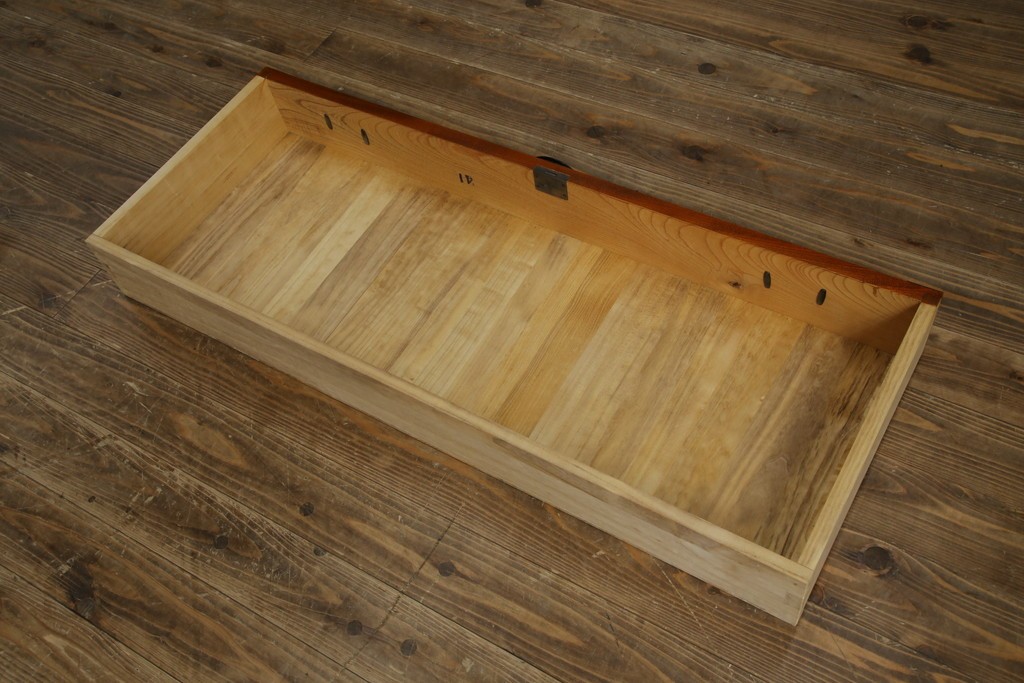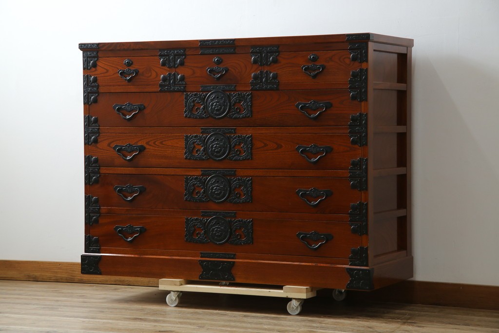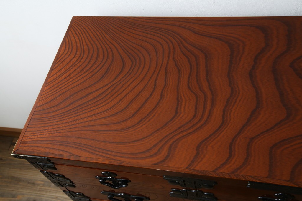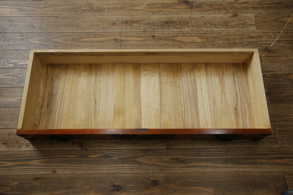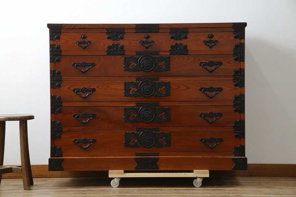 複数段の引き出しを備え、衣類から小物まで整理しやすい構造になっています。内部は木肌の温かみを感じるつくりで、日常の収納に快適さをもたらします。和室はもちろん、現代的な空間にも映える落ち着いた存在感があり、暮らしに伝統の趣を取り入れたい方にぴったりの一台です。