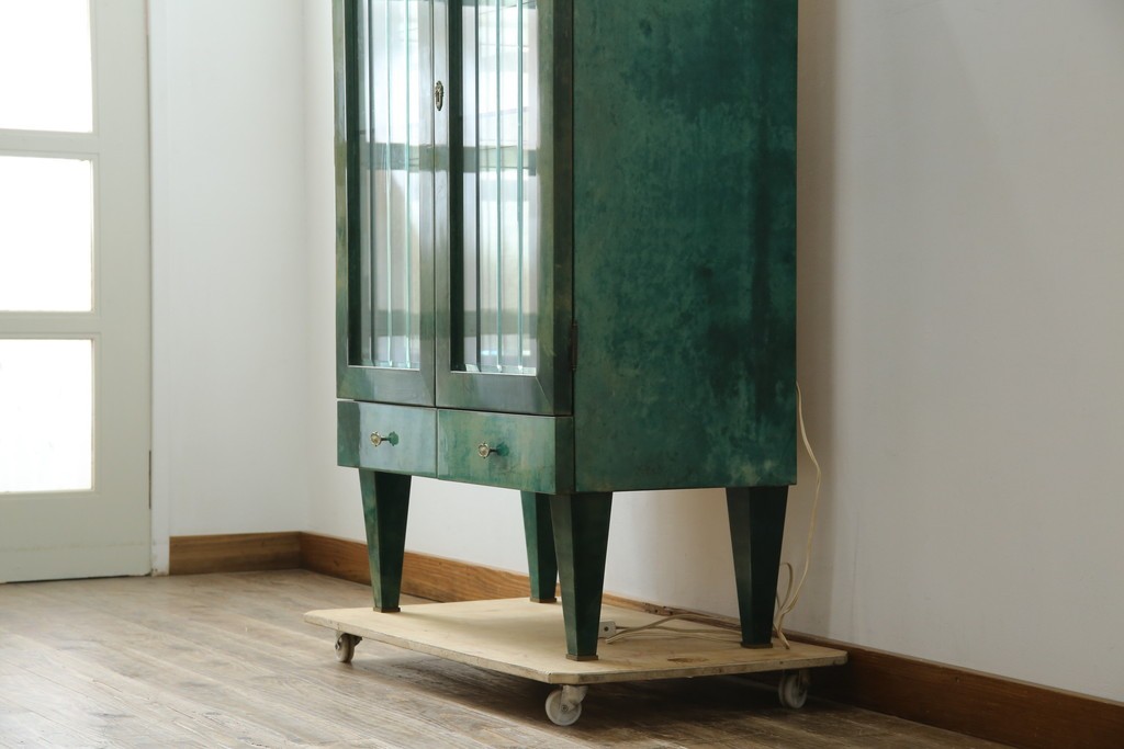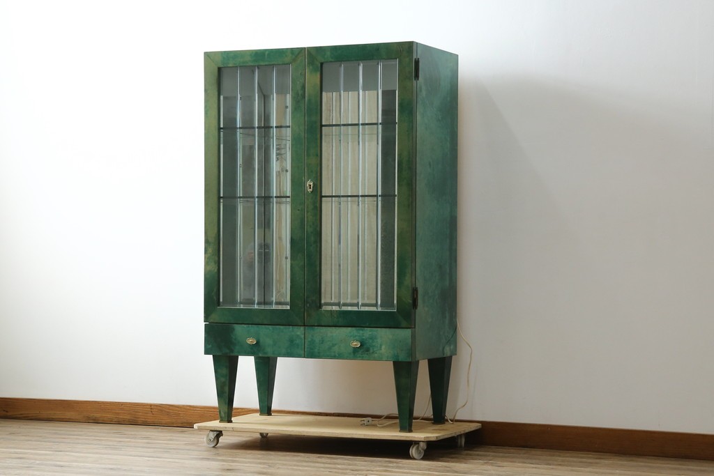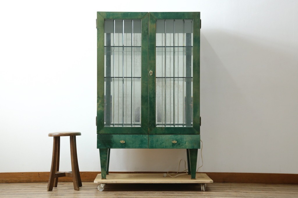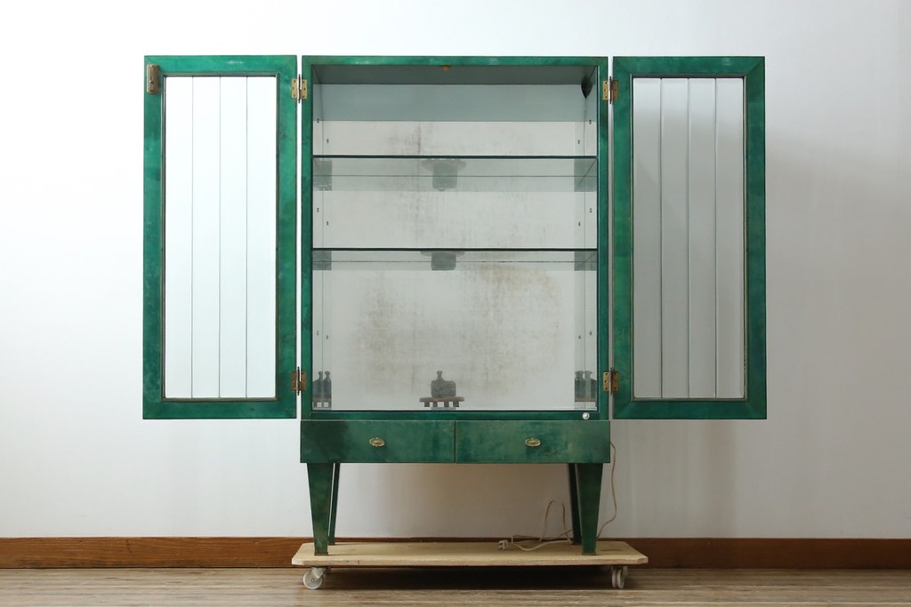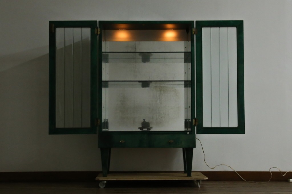 内部にはガラス棚が設けられ、背面のミラーと組み合わせることで、飾る物を引き立てるディスプレイ性を高めています。照明がゆるやかに灯ることで、空間に柔らかな陰影を添え、飾る品の魅力をより豊かに演出します。下部の引き出しも実用的で、使い勝手の良い構成です。