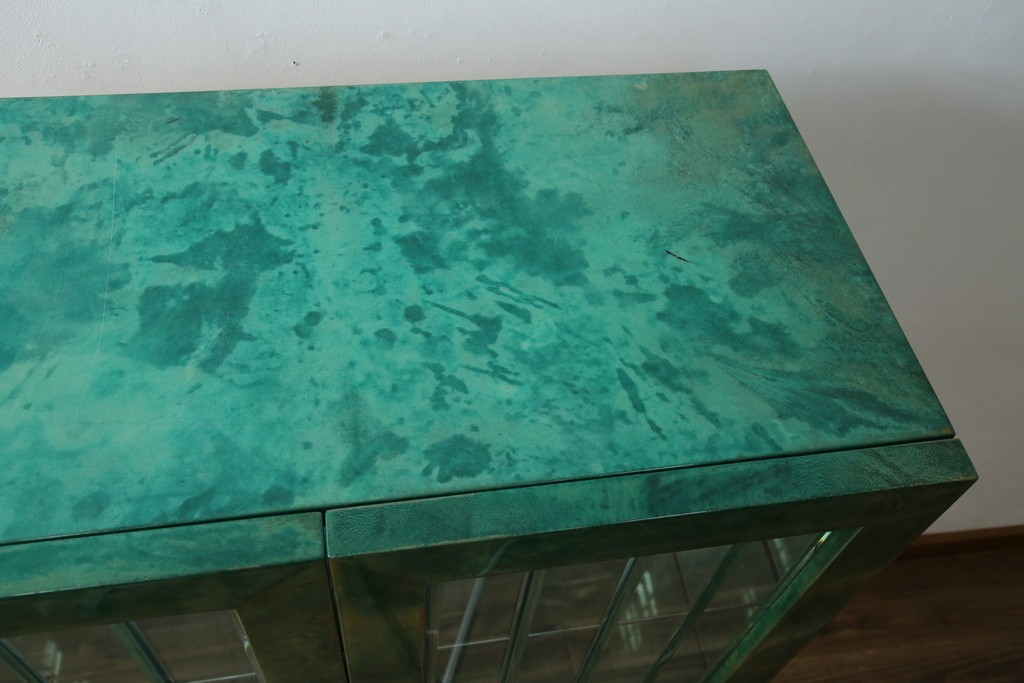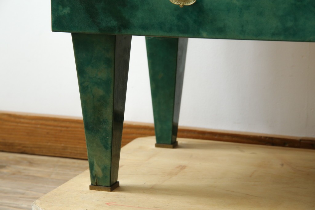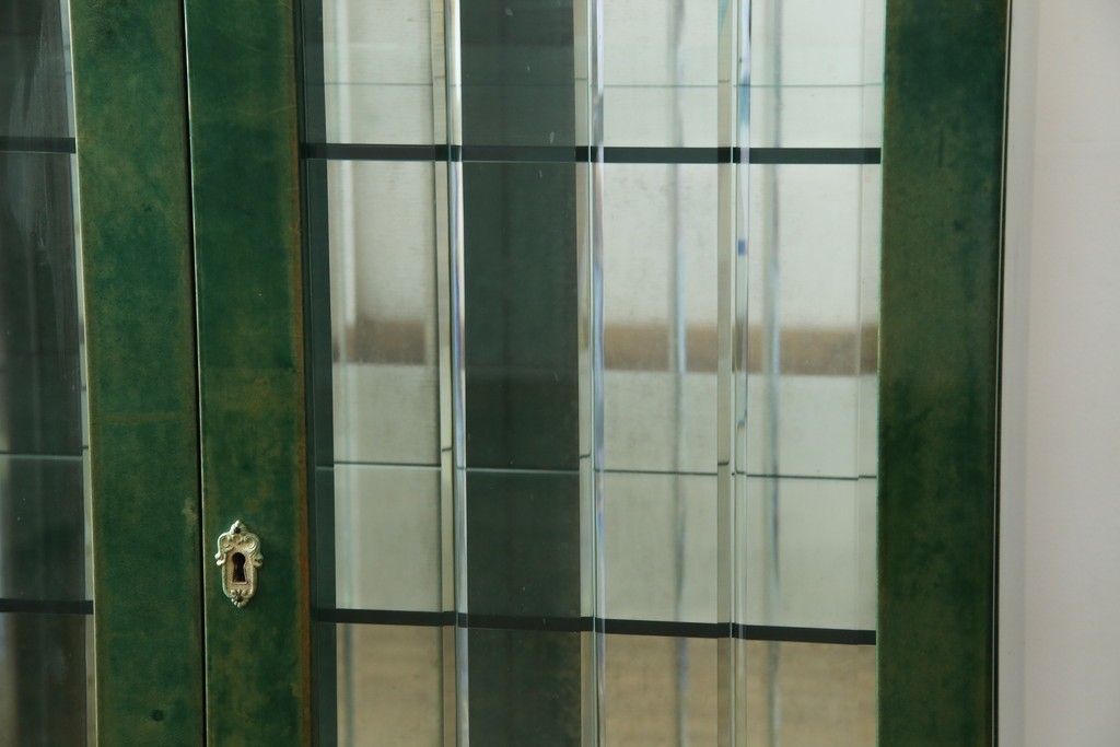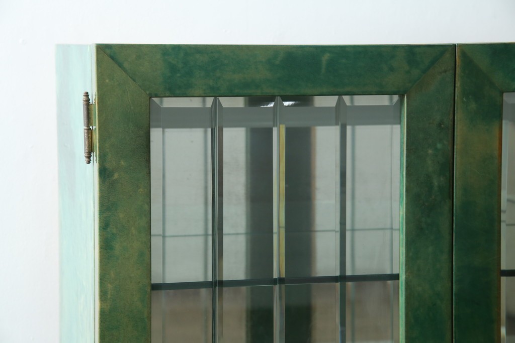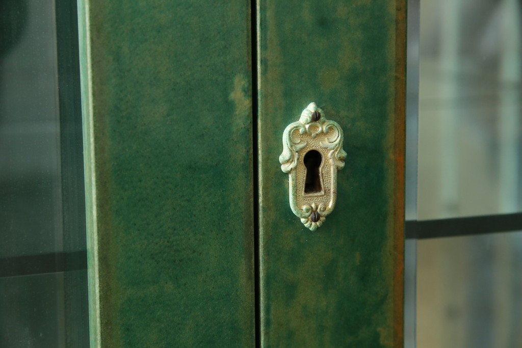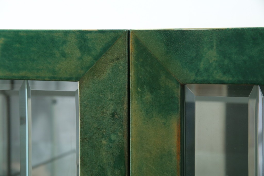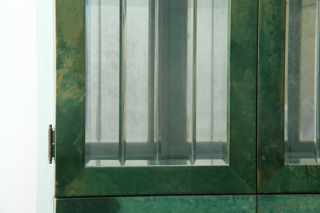 外装には仔山羊革が贅沢に用いられ、染色による深みのある緑色の濃淡が独特の味わいを見せています。革ならではのしっとりとした質感と、不規則な模様が重なり合う表情は、同じものが存在しない一点ものの魅力に満ちています。手仕事の美しさが随所に感じられる仕上がりです。