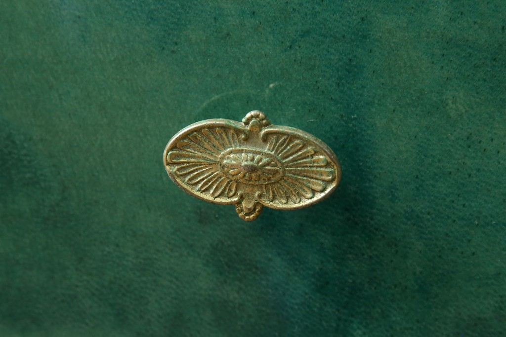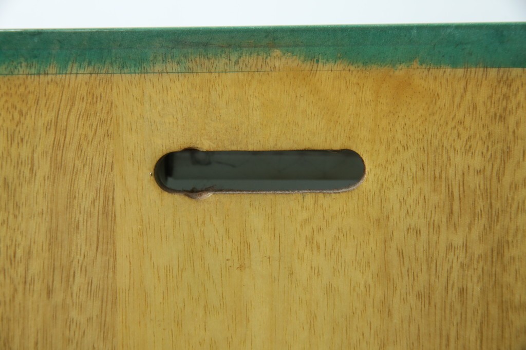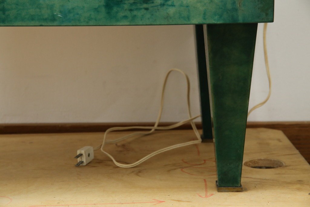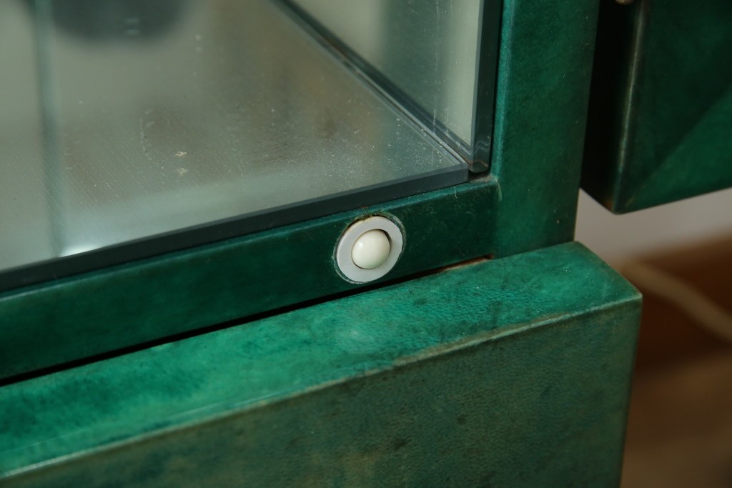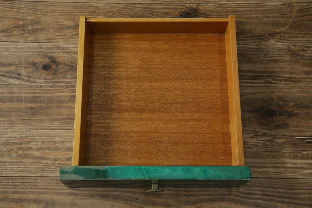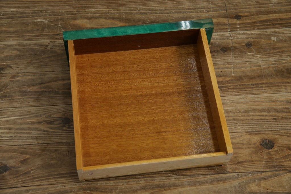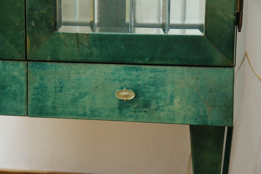 外装には仔山羊革が贅沢に用いられ、染色による深みのある緑色の濃淡が独特の味わいを見せています。革ならではのしっとりとした質感と、不規則な模様が重なり合う表情は、同じものが存在しない一点ものの魅力に満ちています。手仕事の美しさが随所に感じられる仕上がりです。