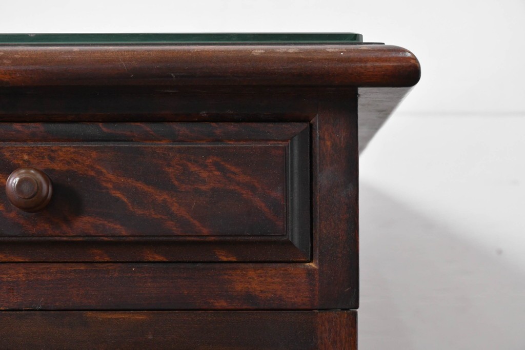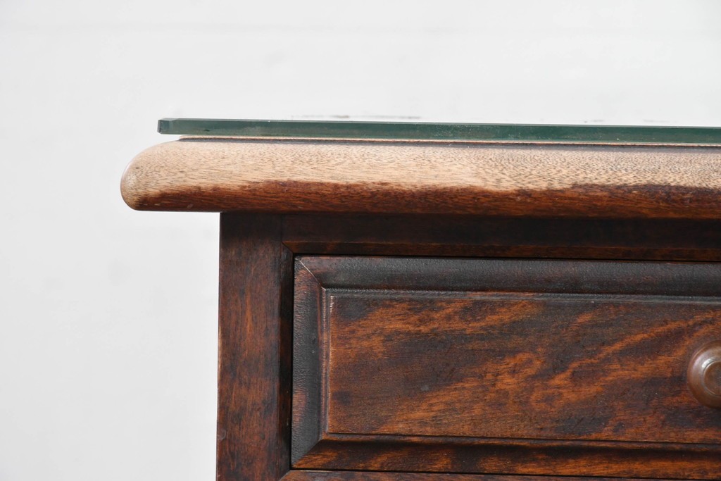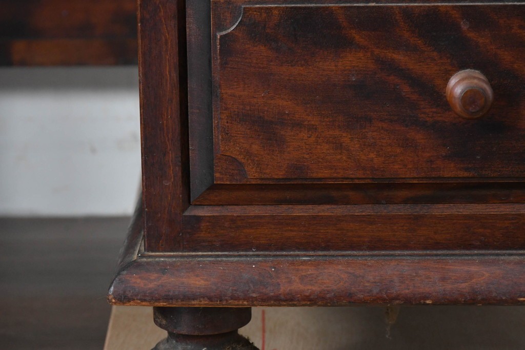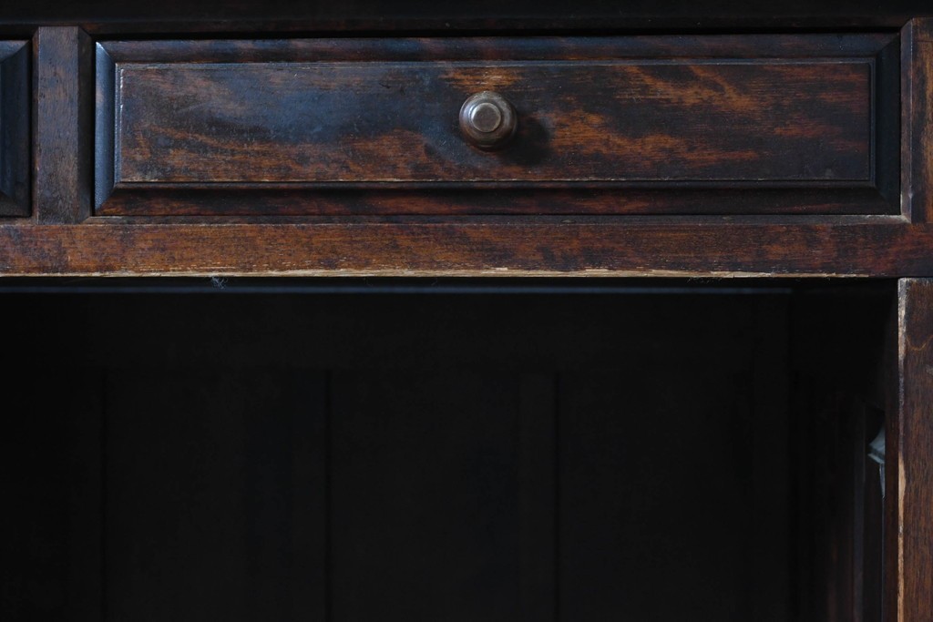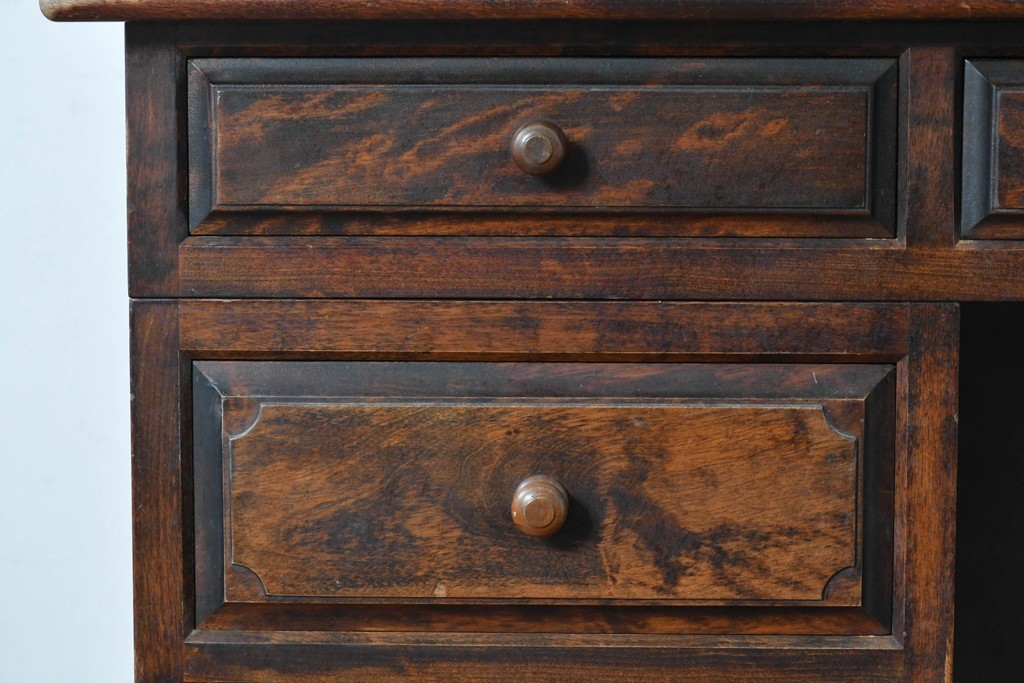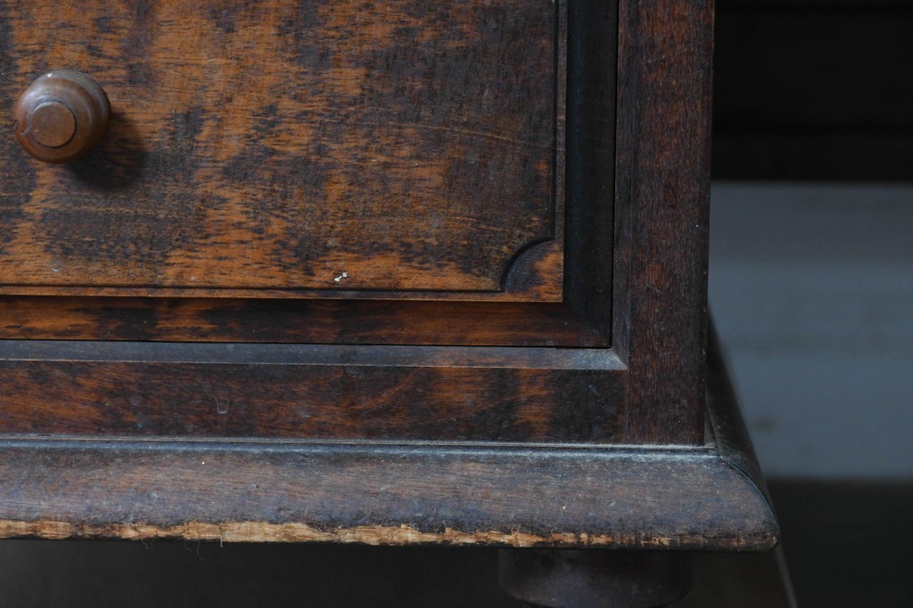 松本民芸家具らしい虎斑のような揺らぎの木目が前面に広がり、見る角度によって表情が変わります。時間とともに増した渋さが天板や引き出しの木目に現れ、唯一無二の雰囲気を醸し出しています。