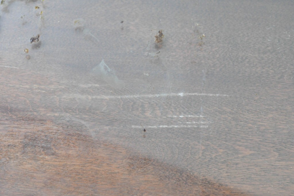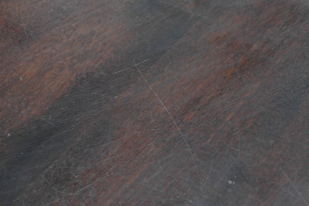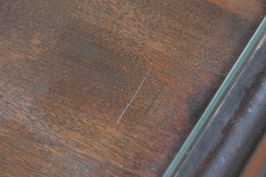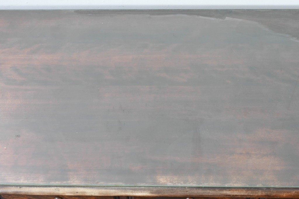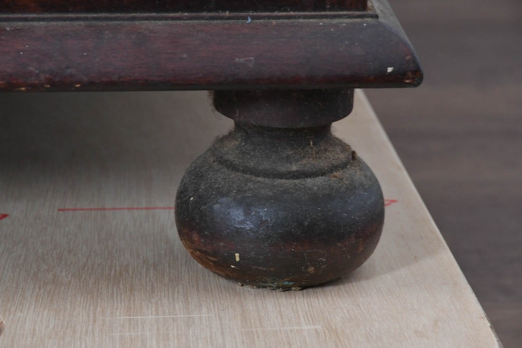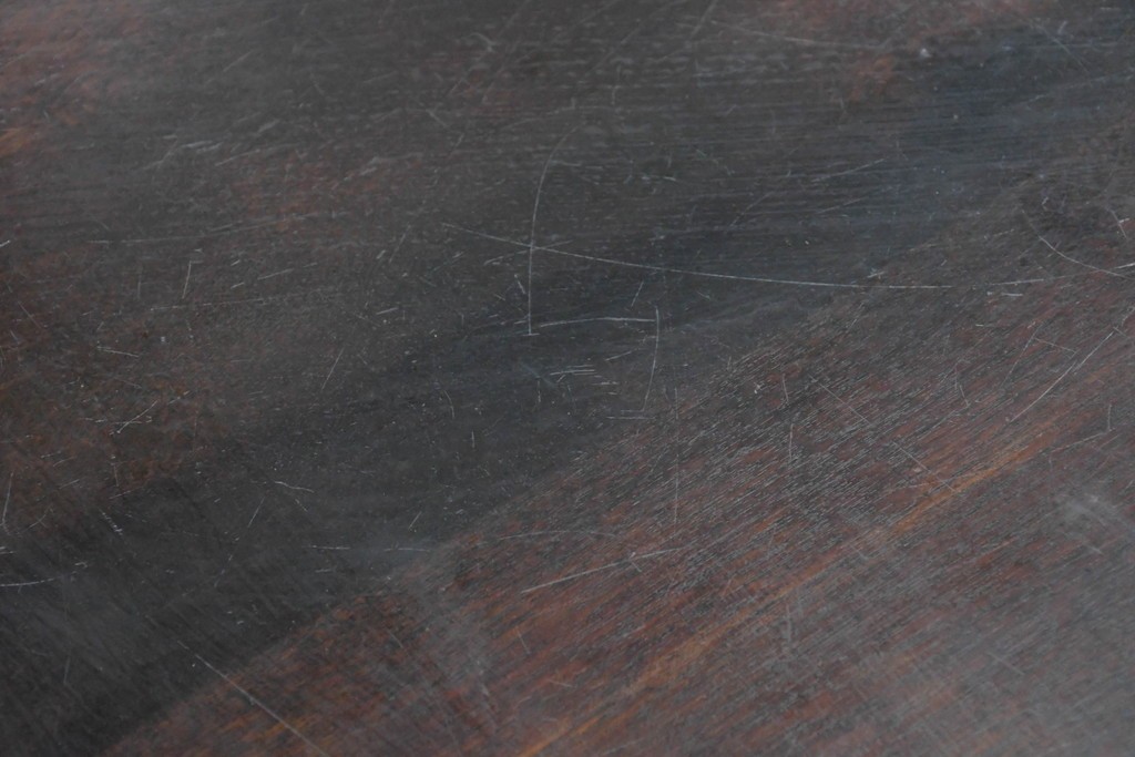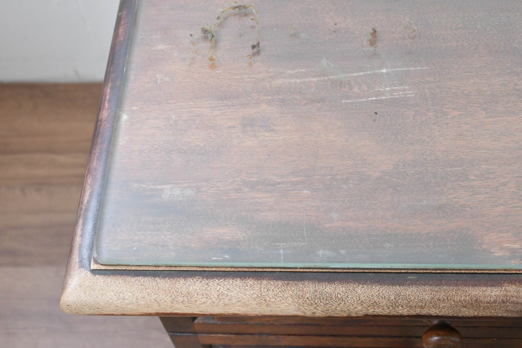 松本民芸家具らしい虎斑のような揺らぎの木目が前面に広がり、見る角度によって表情が変わります。時間とともに増した渋さが天板や引き出しの木目に現れ、唯一無二の雰囲気を醸し出しています。