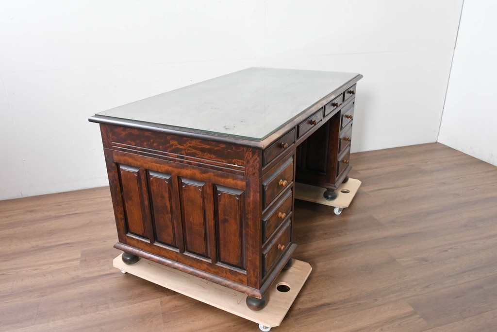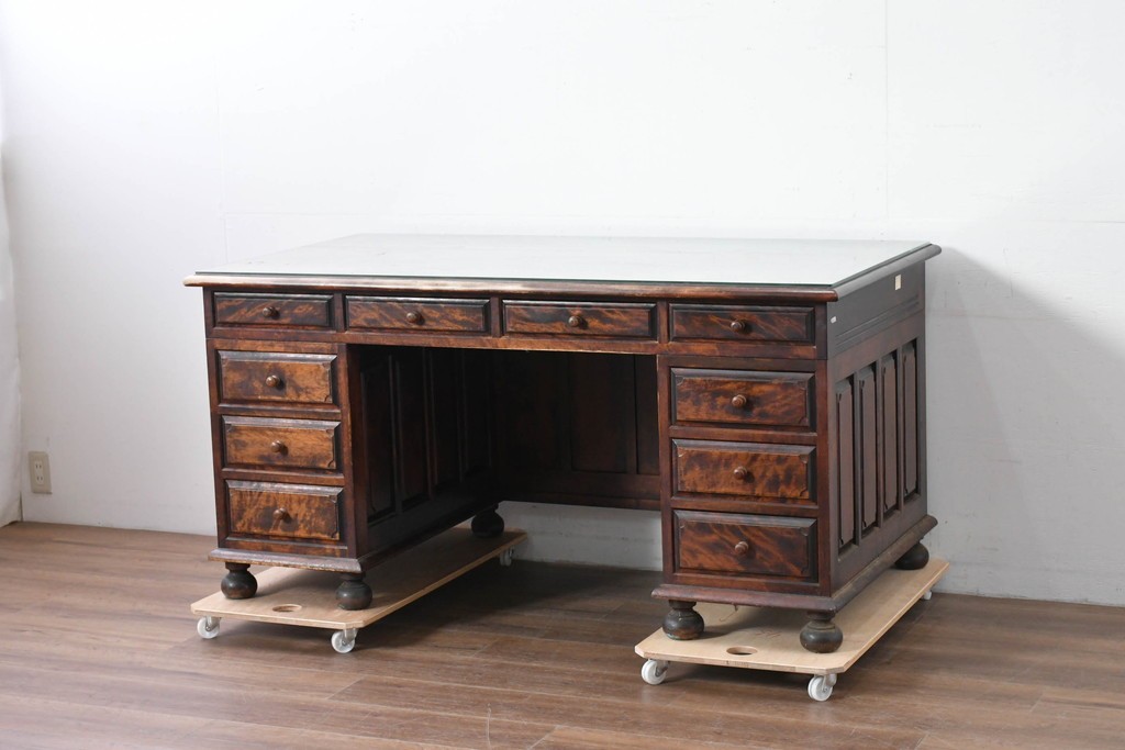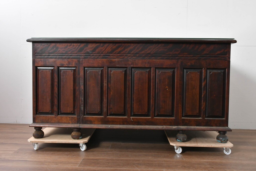 深く落ち着いたブラウンに、隅々まで丁寧に施された面取りとパネル装飾。置くだけで空間の格を引き上げるクラシカルな佇まいで、書斎・オフィス・店舗でも存在感を発揮します。