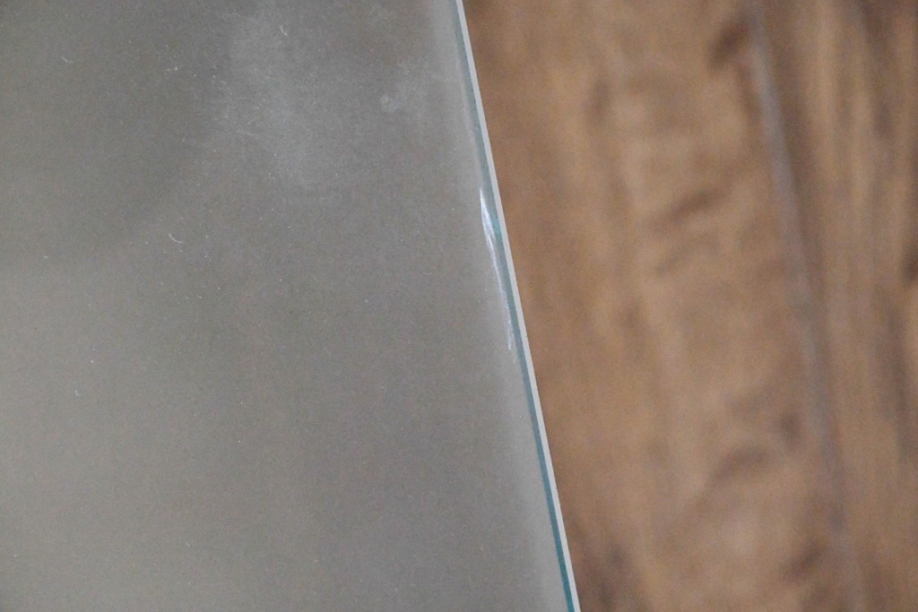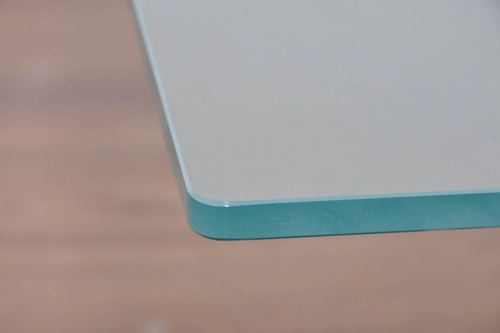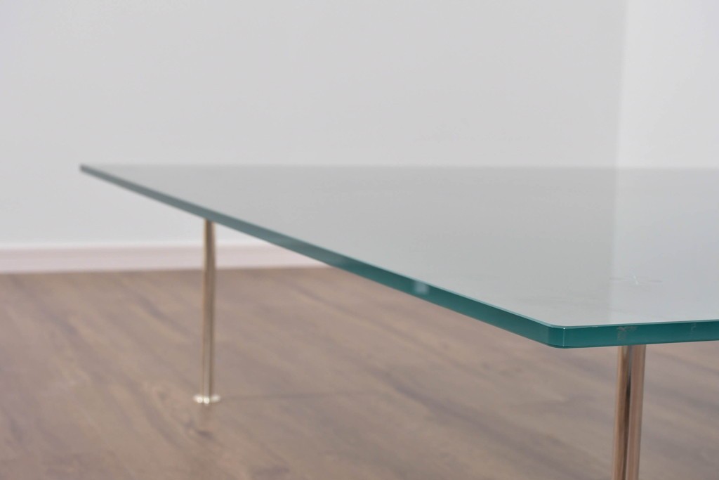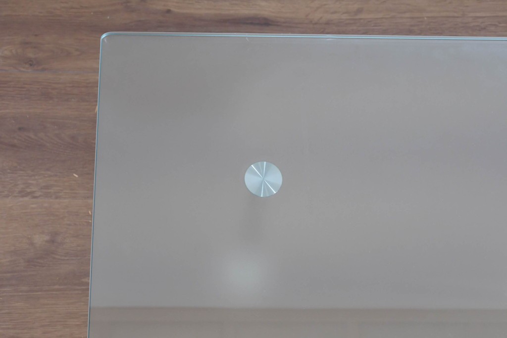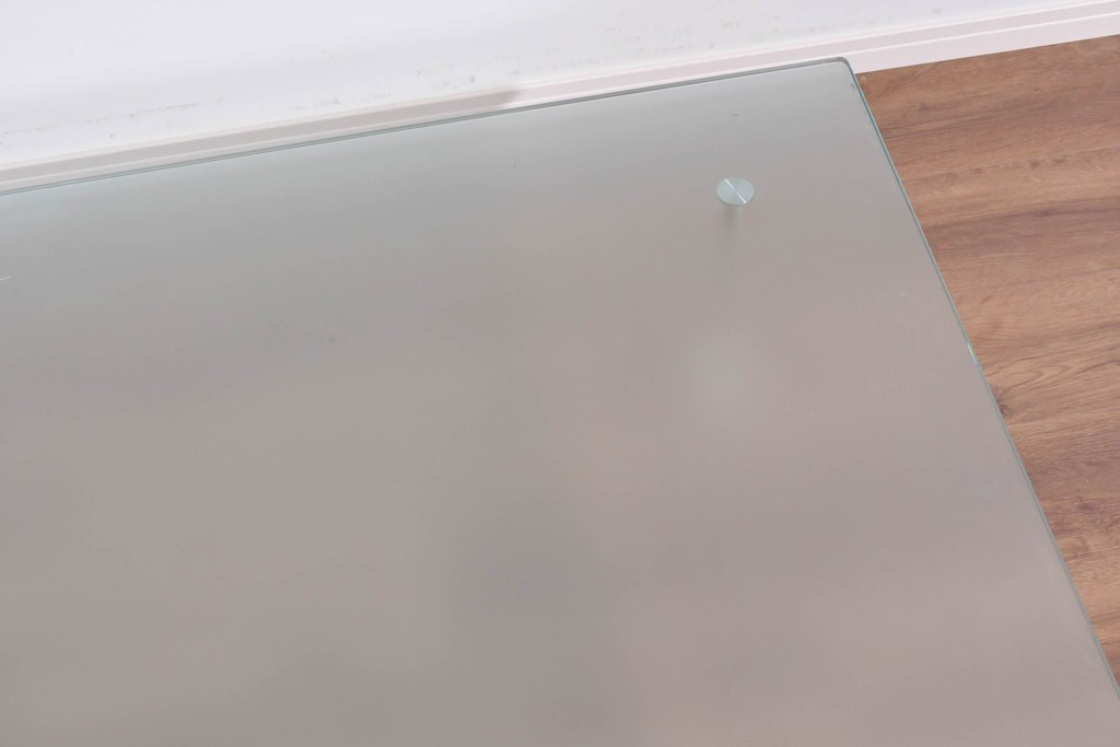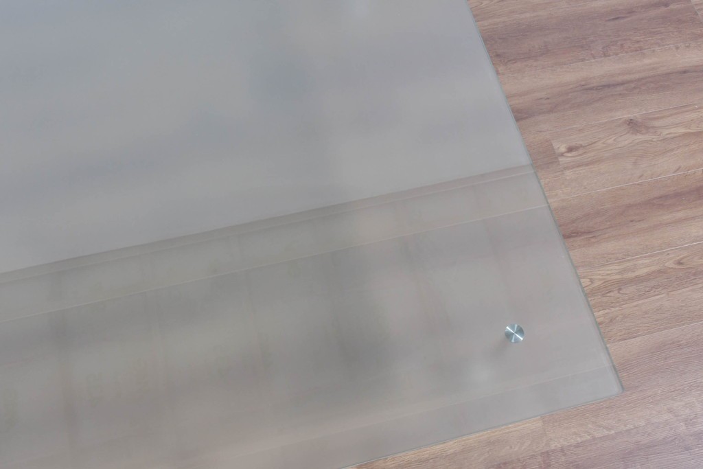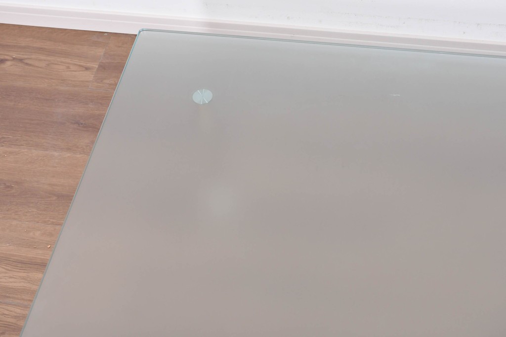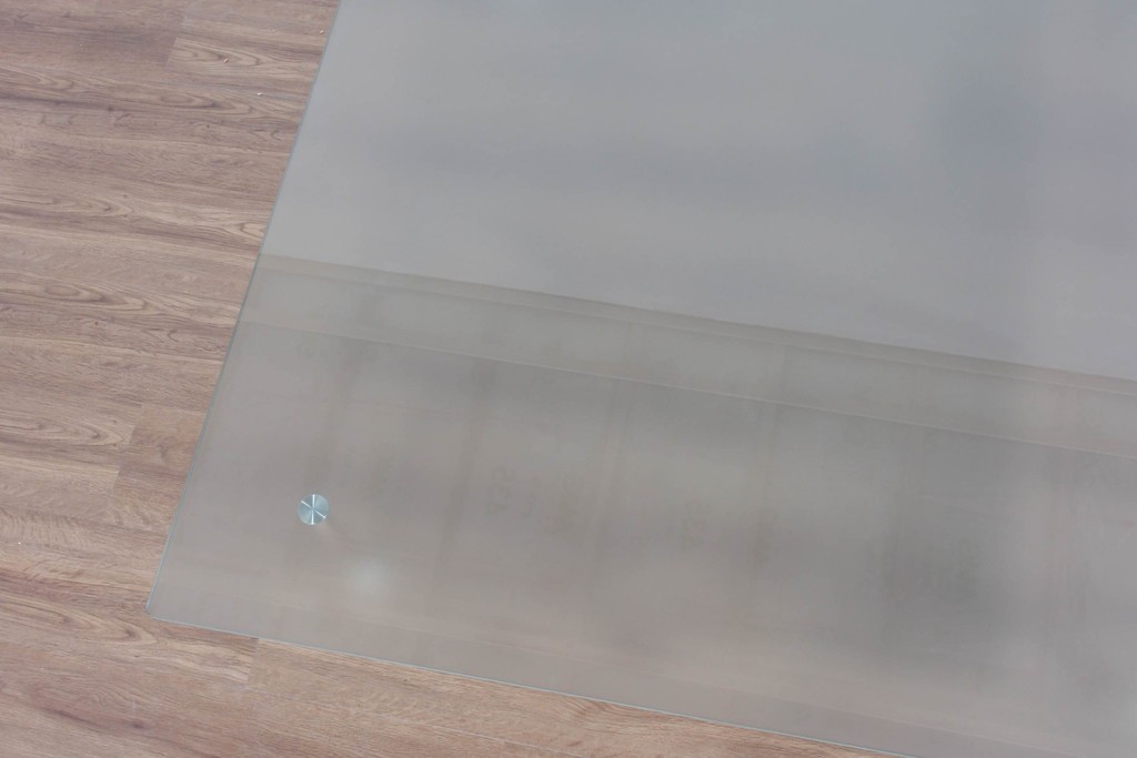 透明なガラス天板は直線的なフォルムと相まって、ミニマルで洗練された雰囲気を演出します。
