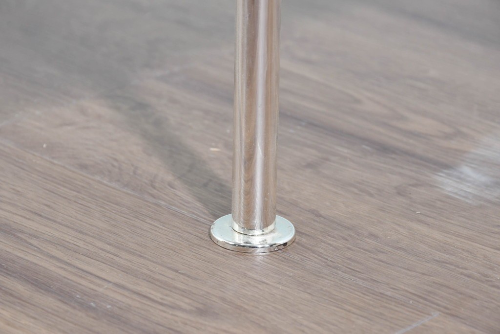 ガラス天板と細身の金属脚による構成が軽やかな印象を与え、空間に広がりをもたらしてくれるデザインです。
