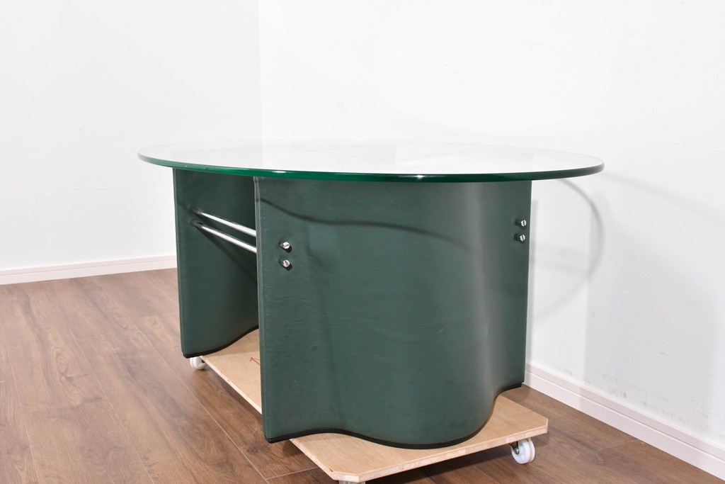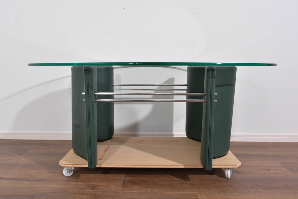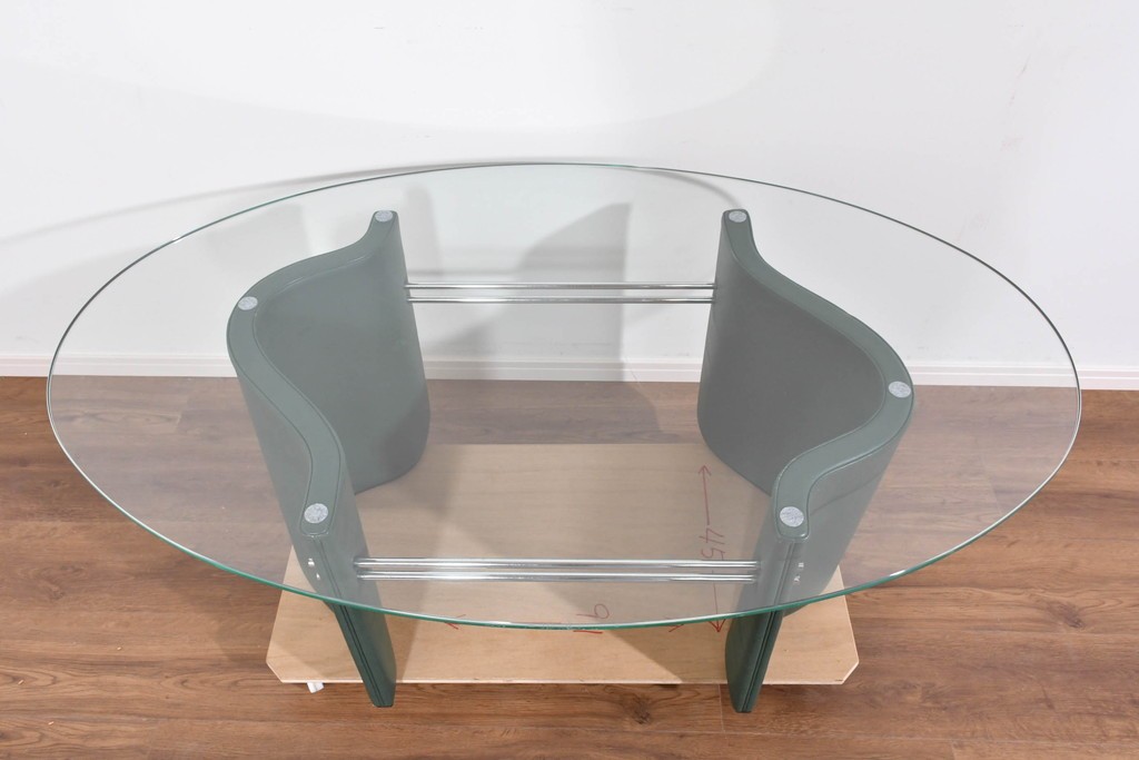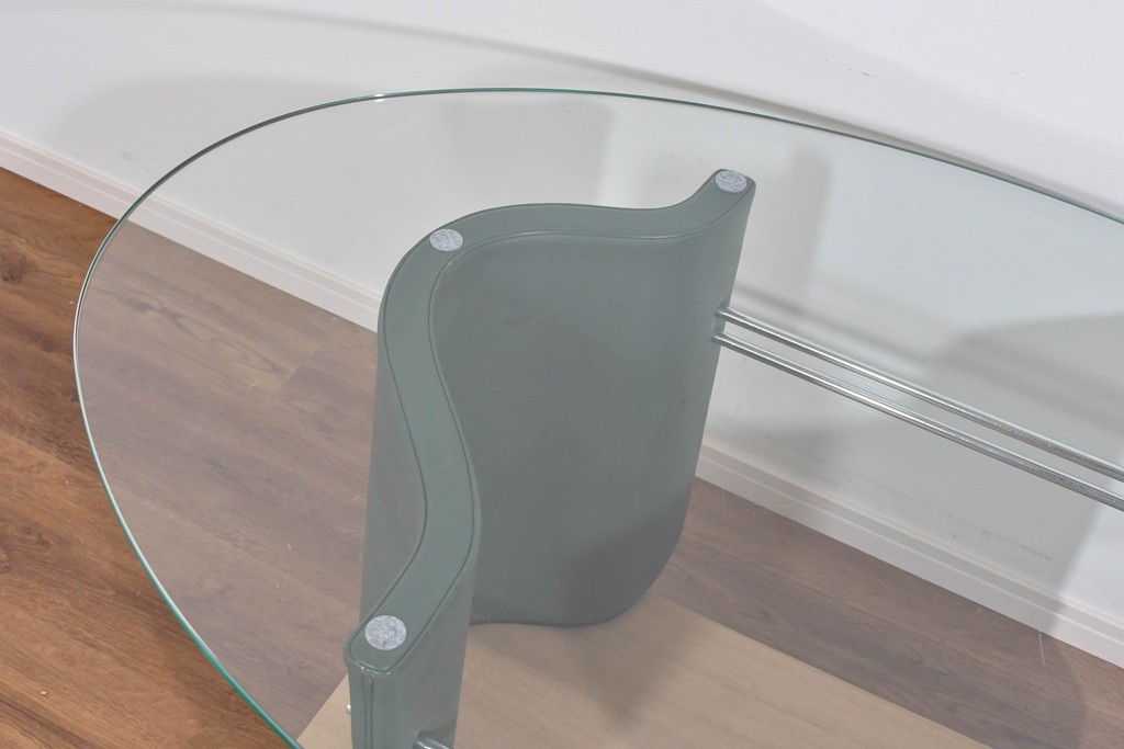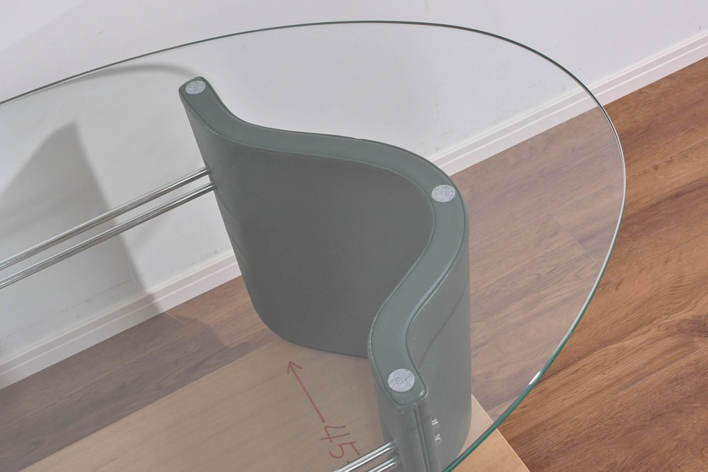 ガラス天板の軽やかさと、本革を用いた脚部の上質な素材感が美しく調和します。