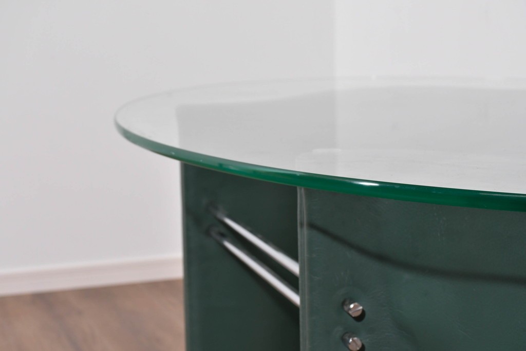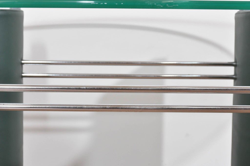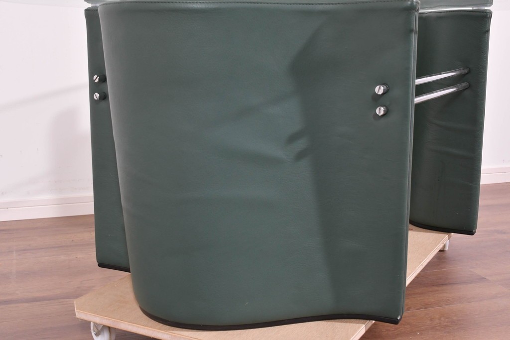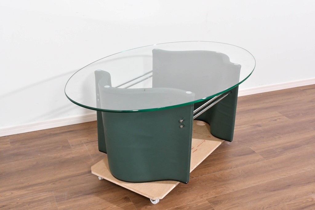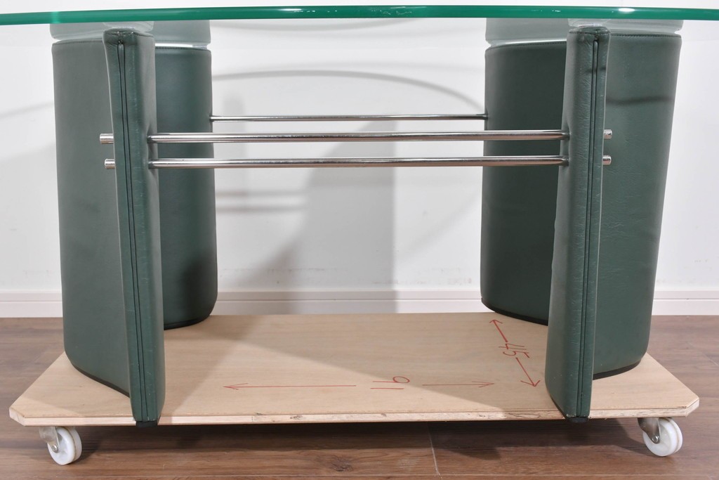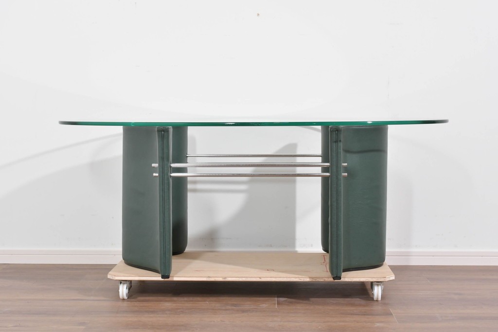ガラス天板の軽やかさと、本革を用いた脚部の上質な素材感が美しく調和します。