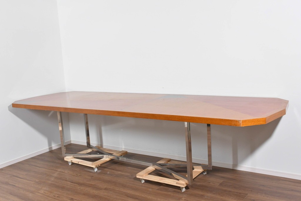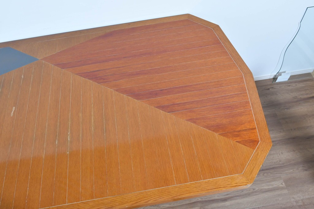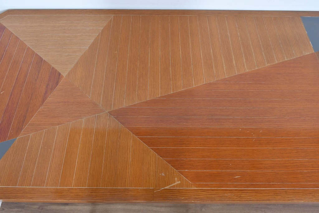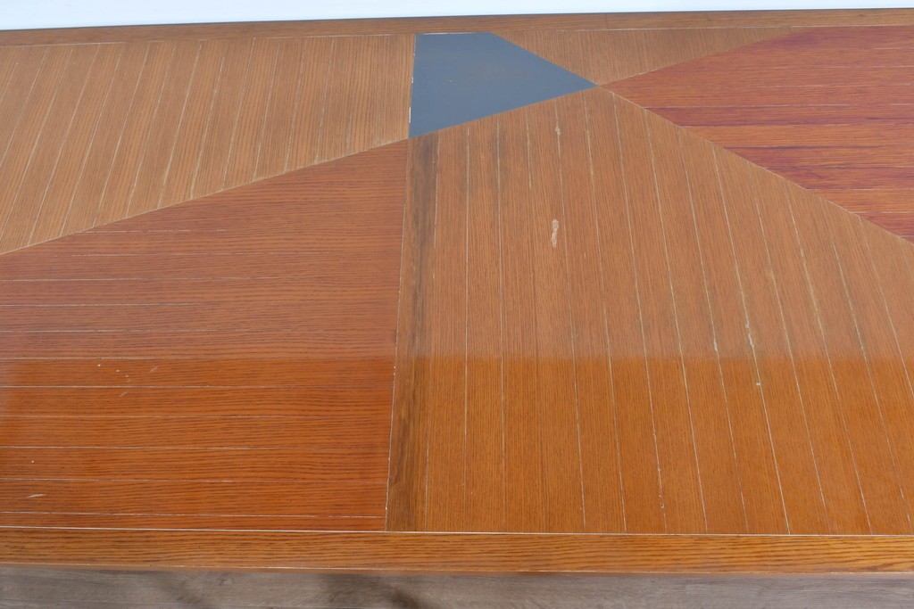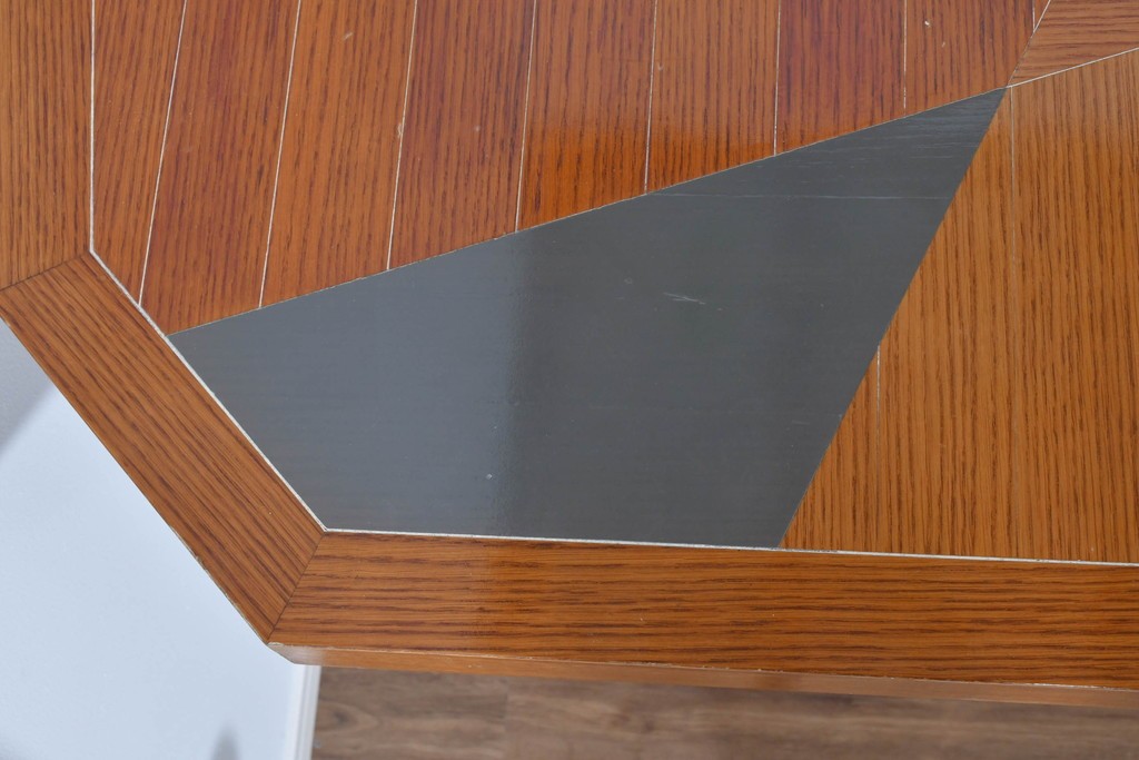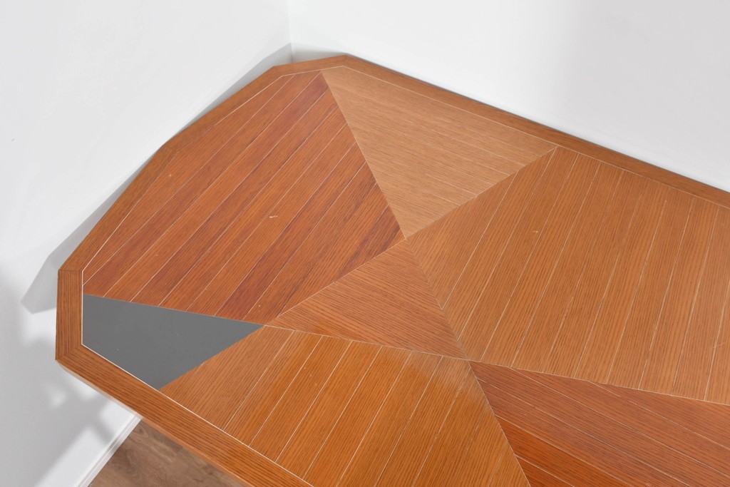 幅約350cmの特大サイズに広がる幾何学的な天板デザインが印象的で、ポストモダン期らしい自由で大胆な造形が楽しめます。異なる色調の木目を組み合わせた意匠は空間の主役として存在感を発揮します。
