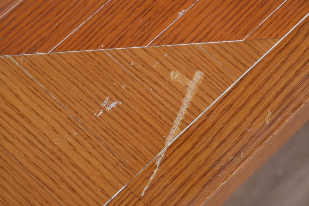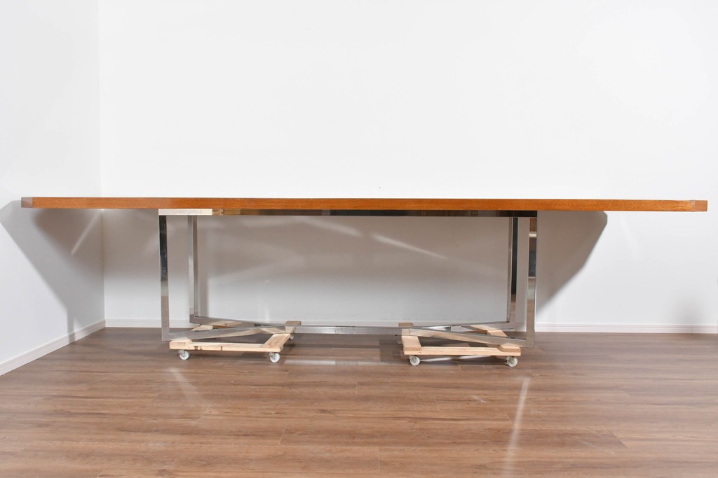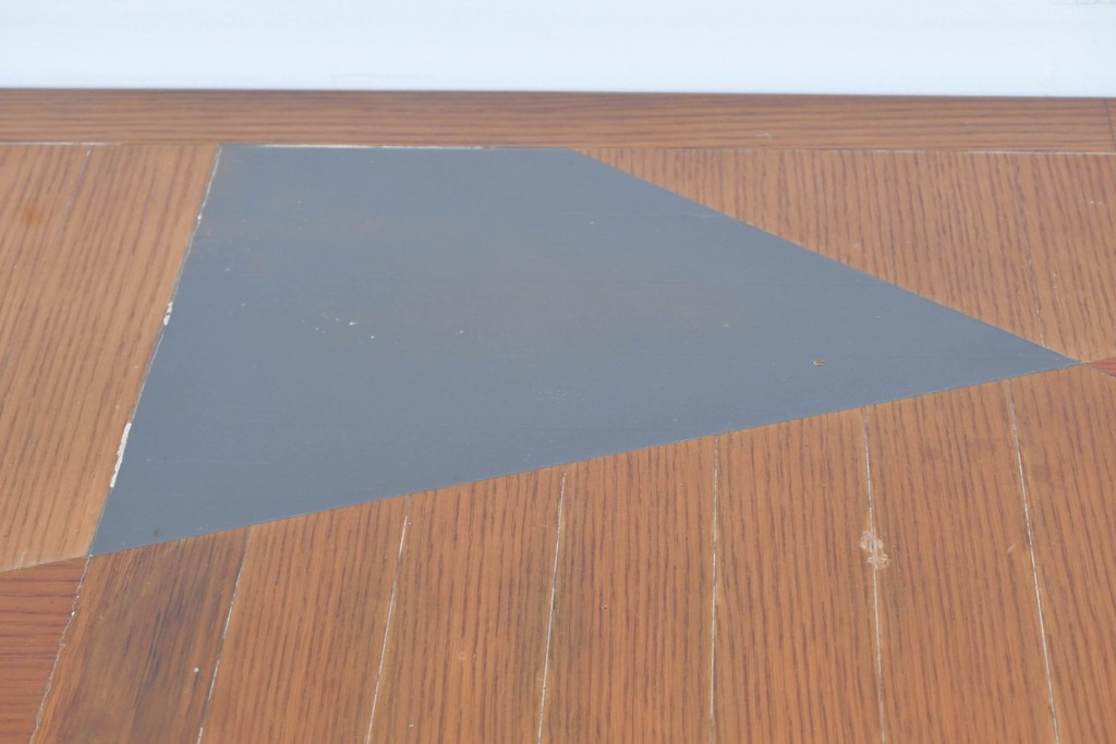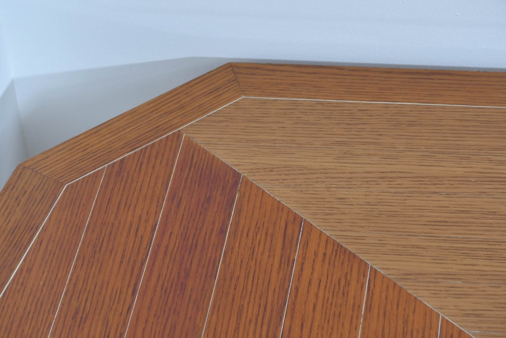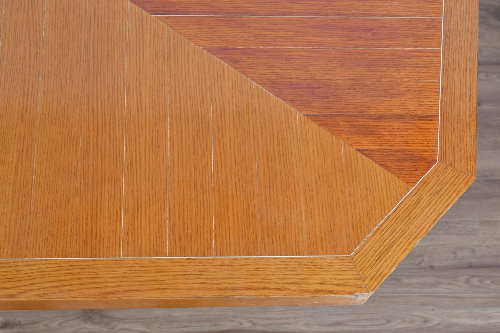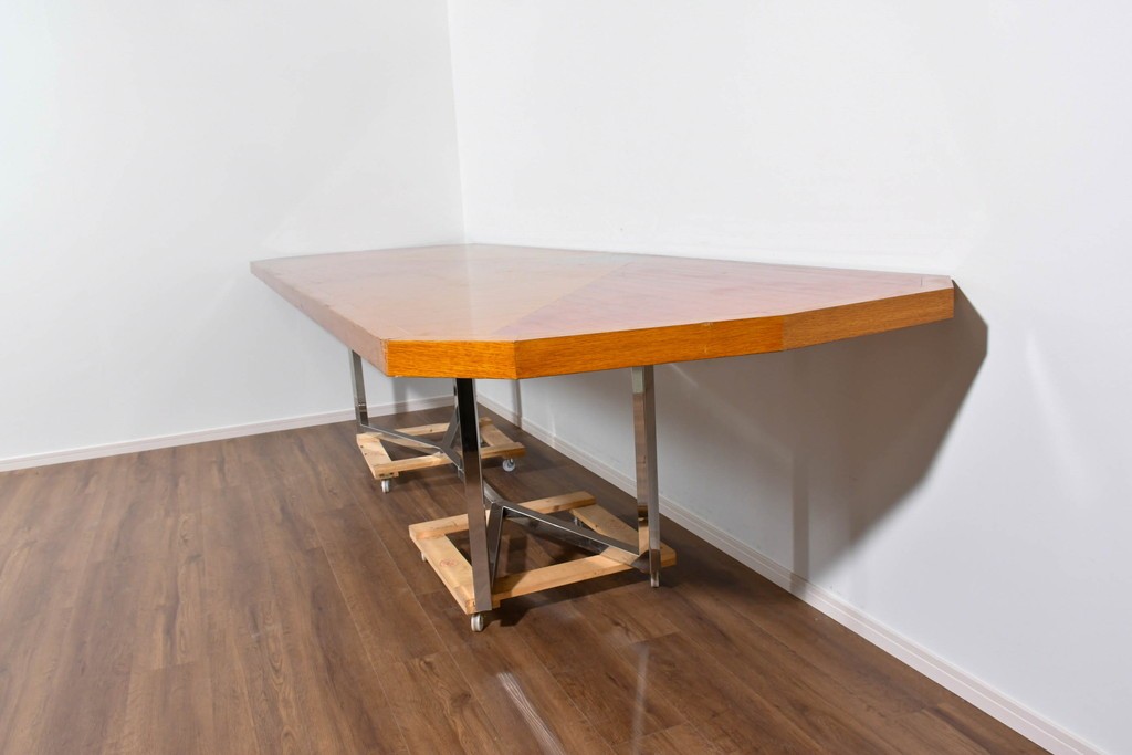 幅約350cmの特大サイズに広がる幾何学的な天板デザインが印象的で、ポストモダン期らしい自由で大胆な造形が楽しめます。異なる色調の木目を組み合わせた意匠は空間の主役として存在感を発揮します。