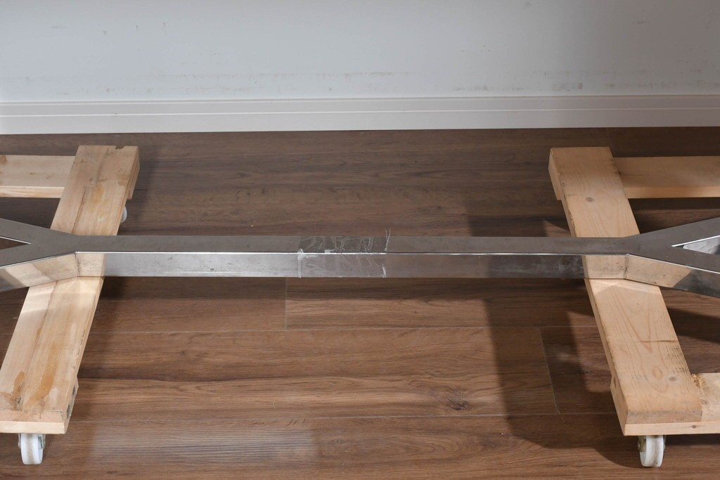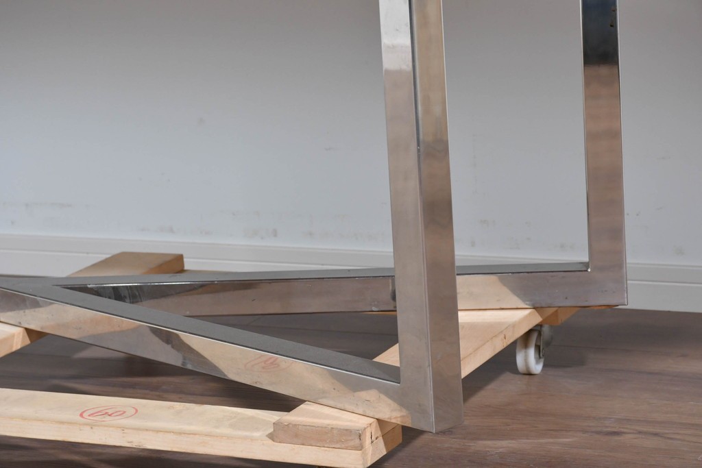 天板を支える脚部にはメタルフレームが用いられ、直線的なラインが全体にシャープな印象を与えています。大きなサイズでありながら軽快さもあり、現代空間とも自然になじむデザイン性の高さが魅力です。