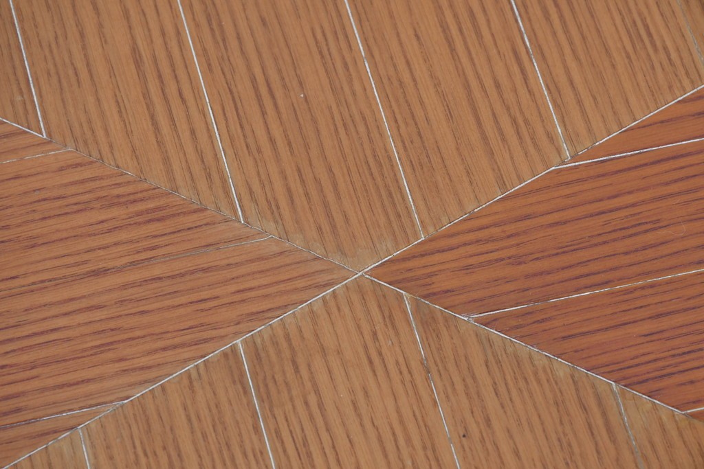 放射状に配置された木目パターンがリズミカルな表情を生み、視線を惹きつける独特の構成が魅力です。さまざまな角度で組み合わせられた材の表情が重なり合い、アートピースのような面白さを感じられます。