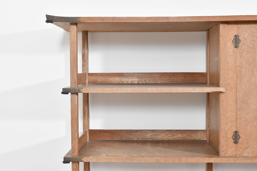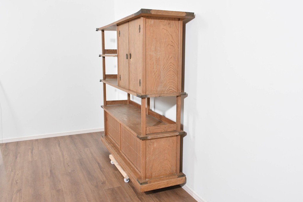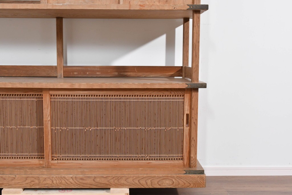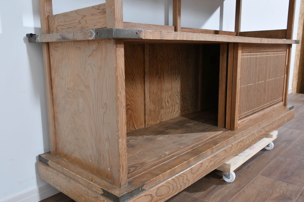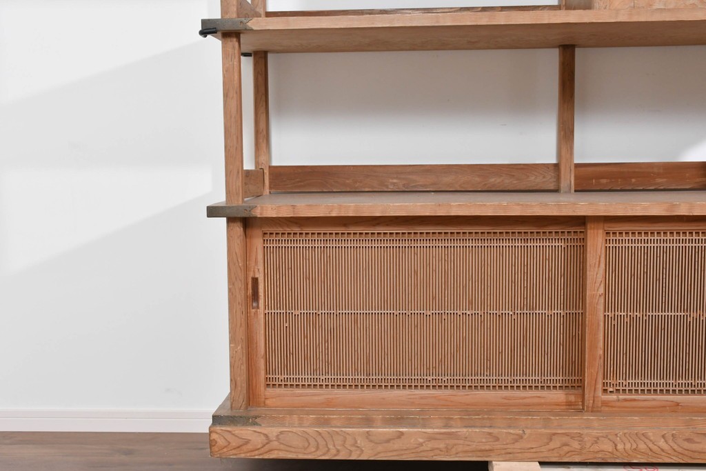 上段の扉収納、広い棚板、下段の格子戸収納など、見せる収納と隠す収納を兼ね備えた実用的な構成です。