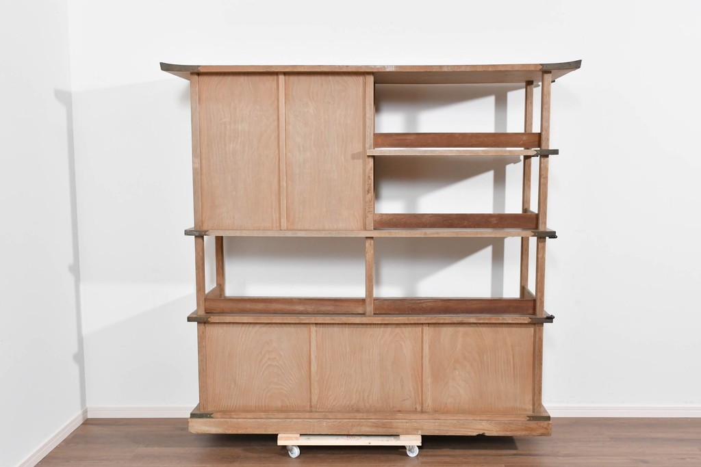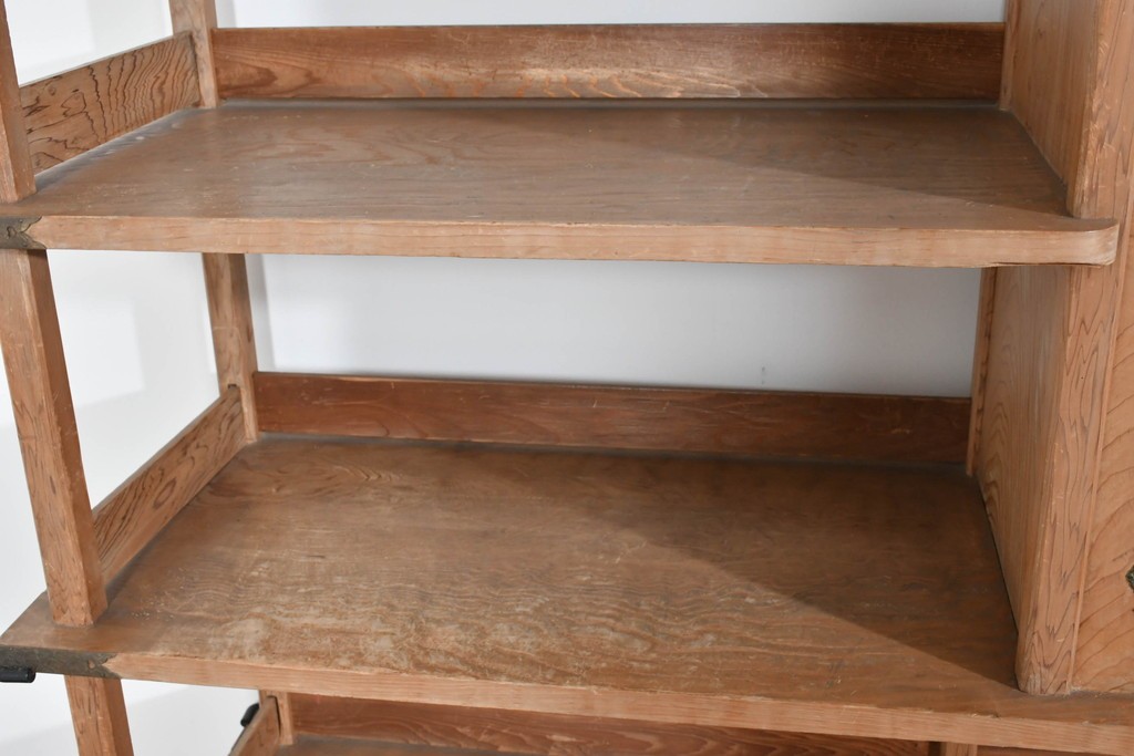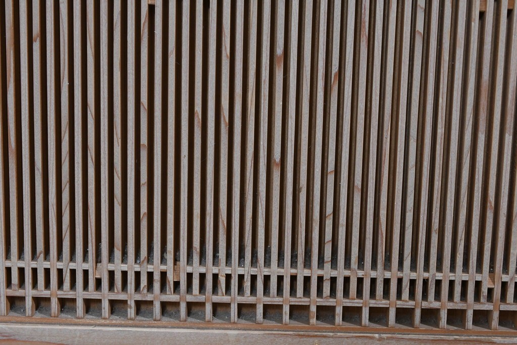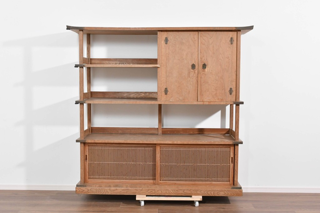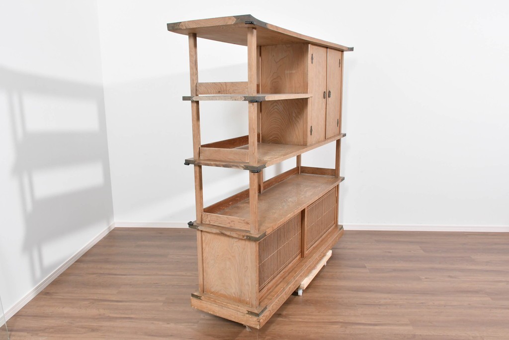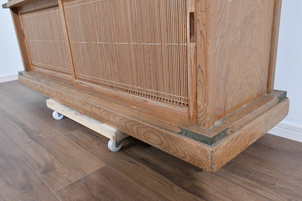 上段の扉収納、広い棚板、下段の格子戸収納など、見せる収納と隠す収納を兼ね備えた実用的な構成です。