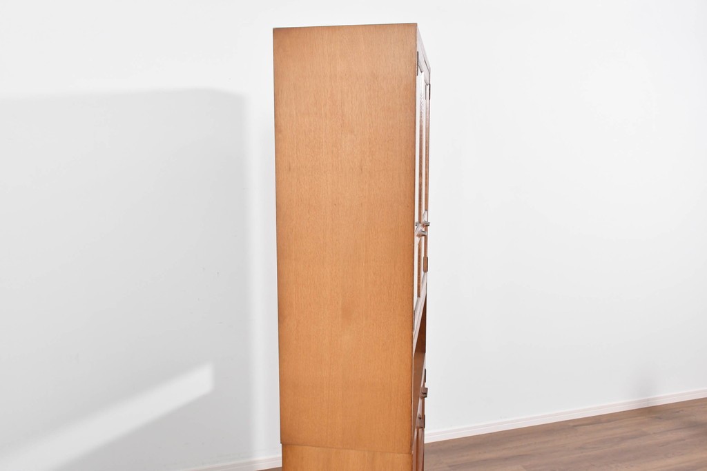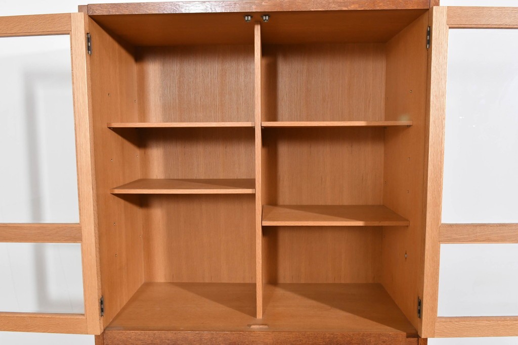 上部にはガラス扉棚、下部には板扉収納を備え、食器や日用品の整理に役立ちます。