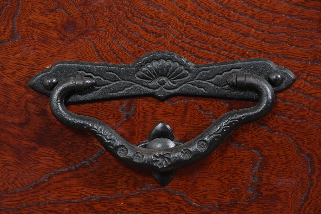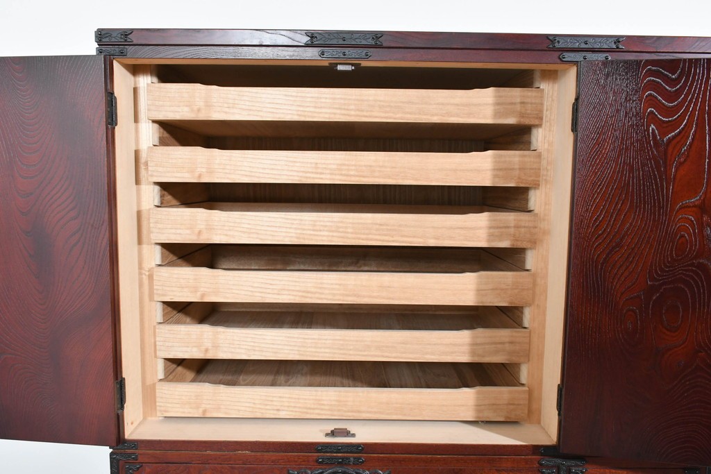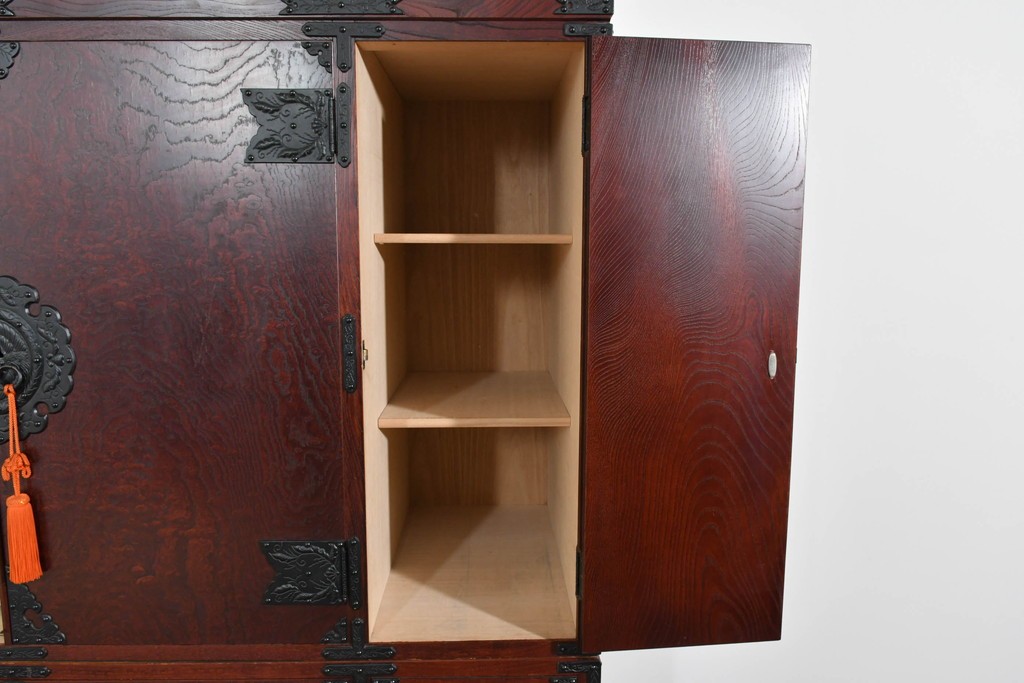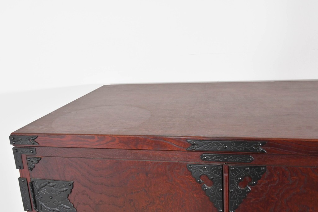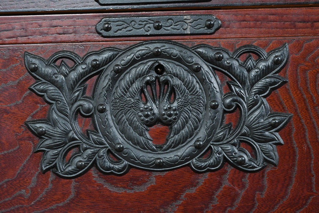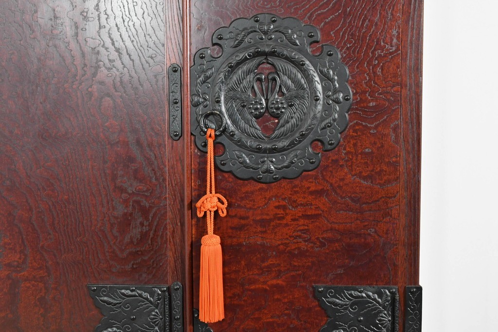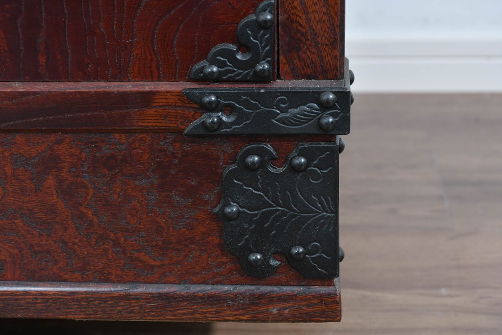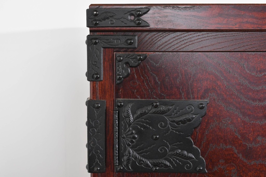 深みのある木肌に、細やかな文様を施した重厚な金具がよく映え、和家具ならではの落ち着いた品格を感じさせる佇まいが魅力です。収納としての使い勝手に優れつつ、空間に置くだけで雰囲気を整えてくれる存在感があり、和の住まいにも現代のインテリアにも自然に調和します。