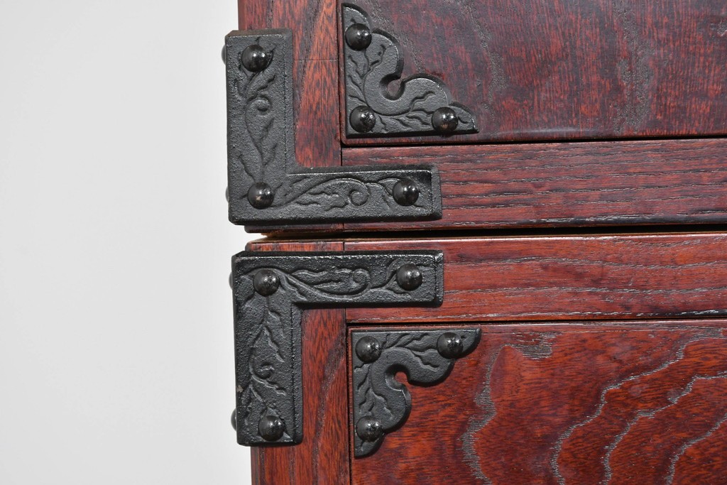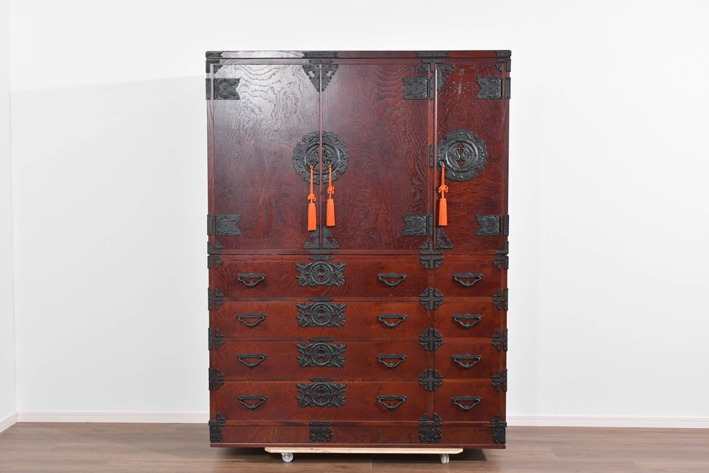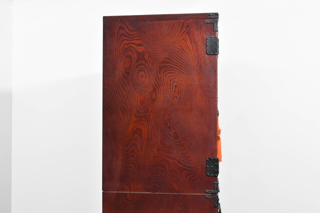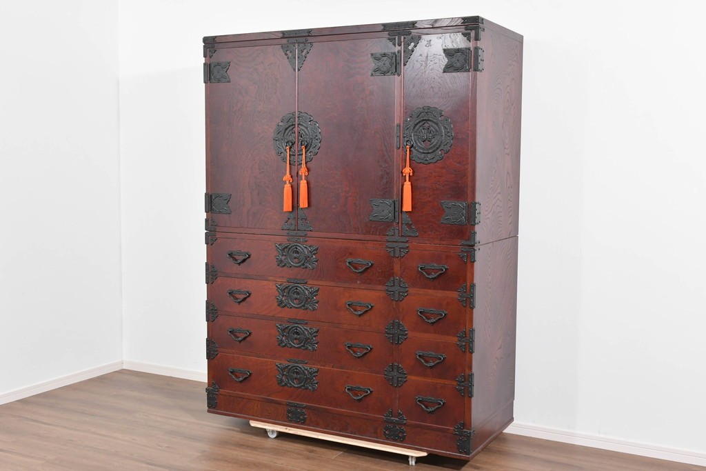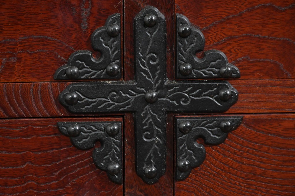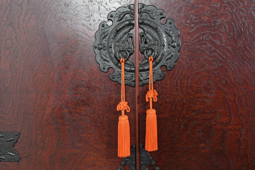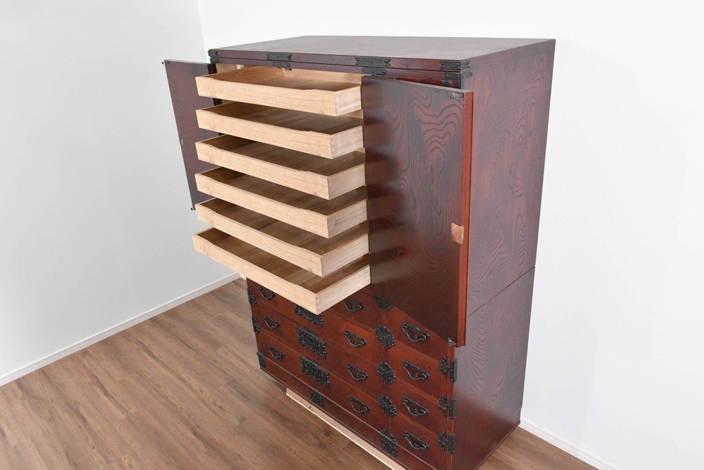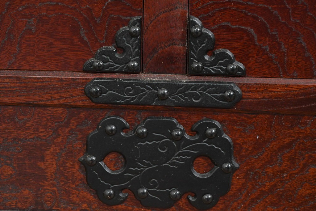 深みのある木肌に、細やかな文様を施した重厚な金具がよく映え、和家具ならではの落ち着いた品格を感じさせる佇まいが魅力です。収納としての使い勝手に優れつつ、空間に置くだけで雰囲気を整えてくれる存在感があり、和の住まいにも現代のインテリアにも自然に調和します。